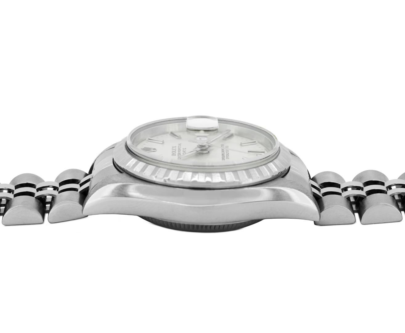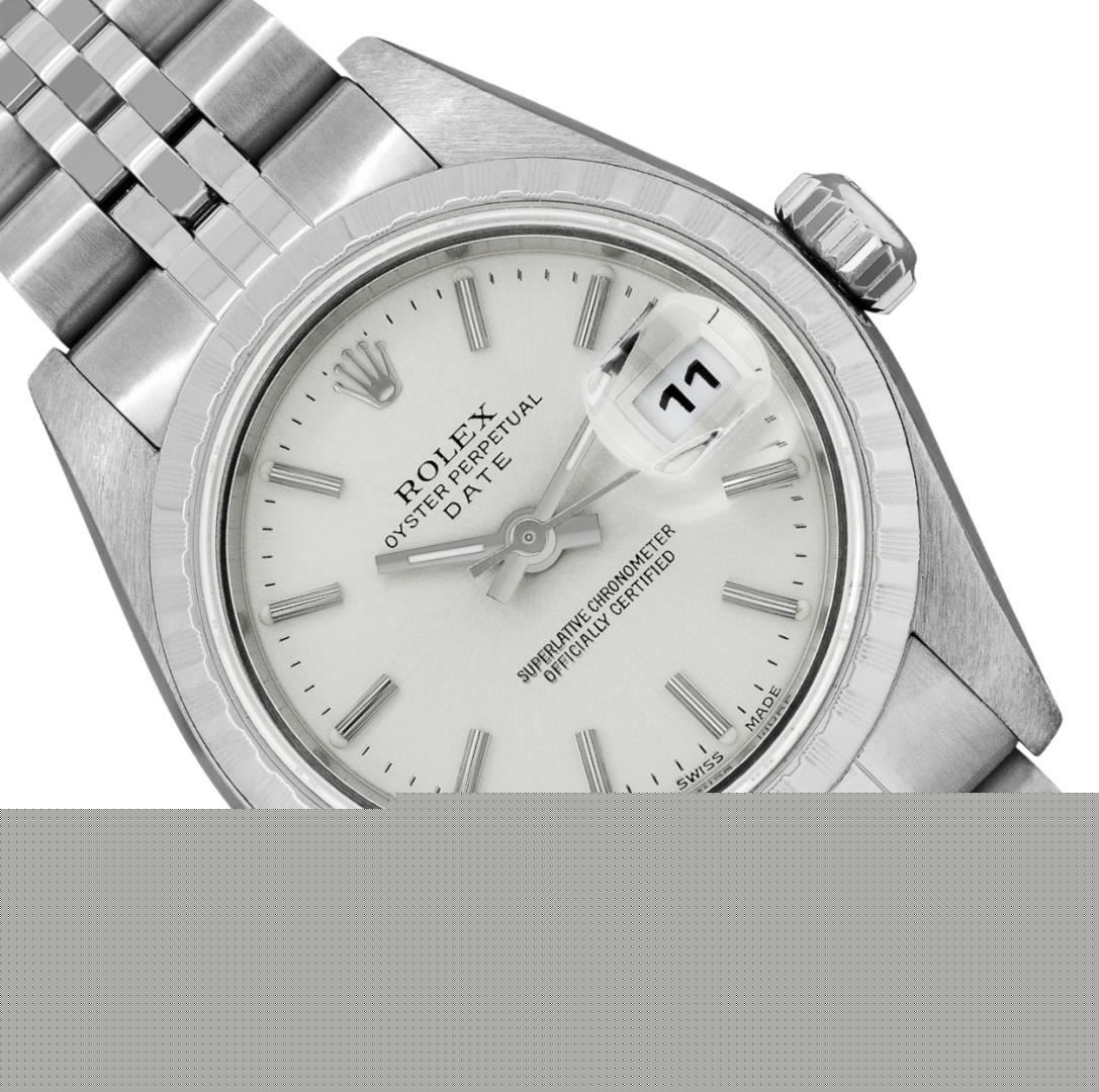 One Rolex Ladies Pre Owned Quickset Stainless Steel Date Wristwatch Polished Bright with Satin Finish, Serviced And Electronically Tested, Stainless Steel Case: 26mm, Stainless Steel Crown, Rolex Stainless Steel Engine Turn bezel. Crystal: Sapphire With Magnified Date Window. Hands: Luminescent Hands. Rolex Movement: 2235 Automatic Winding Movement. Rolex Dial: Factory Silver With Index Hour Markers, Dash Track, And Lumi Dots. Date Window: 3 O'Clock Position Date Display, Model: Sapphire Date. Condition: G-6 Extra Fine. Rolex Bracelet: Stainless Steel Jubilee Band. Bright Polish & Satin Finish. 6.0 Inch Length, Adjustable. Standard Clasp, With Rolex Logo. This Watch Has Been Serviced And Time Tested. It Is In Excellent Condition, Free Of All Scratches And Dents. This Watch Comes With A Rolex Box.