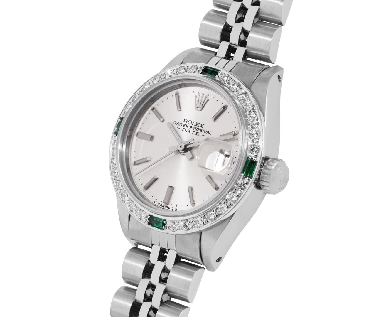 One Rolex Ladies Pre Owned Stainless Steel Date Wristwatch Polished Bright with Satin Finish, Serviced & Electronically Tested, Stainless Steel Case: 26mm, Stainless Steel Crown, Custom Bezel: New 18K White Gold Emerald Beadset Diamond Bezel, Diamond + Gem Count: 36 Diamonds + 4 Emeralds. Custom Crystal: New Sapphire With Magnified Date Window. Custom Hands: New Luminescent Hands. Rolex Movement: Automatic Winding Movement 2035. Rolex Dial: Factory Silver With Index Hour Markers, Lumi Dots, and Dash Tracks. Date Window: 3 O'Clock Position Date Display, Model: Date. Condition: G-6 Extra Fine. Rolex Bracelet: Stainless Steel Jubilee Band. Bright Polish & Satin Finish. 6.0 Inch Length, Adjustable. Standard Clasp, With Rolex Logo. This Watch Has Been Serviced Time Tested And Is In Excellent Condition. It Is Free Of All Scratches And Dents.