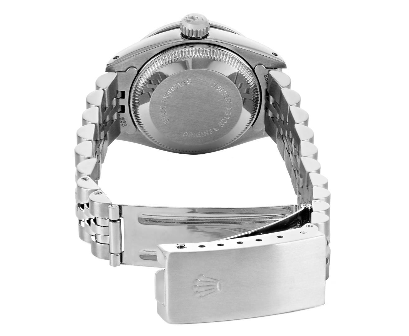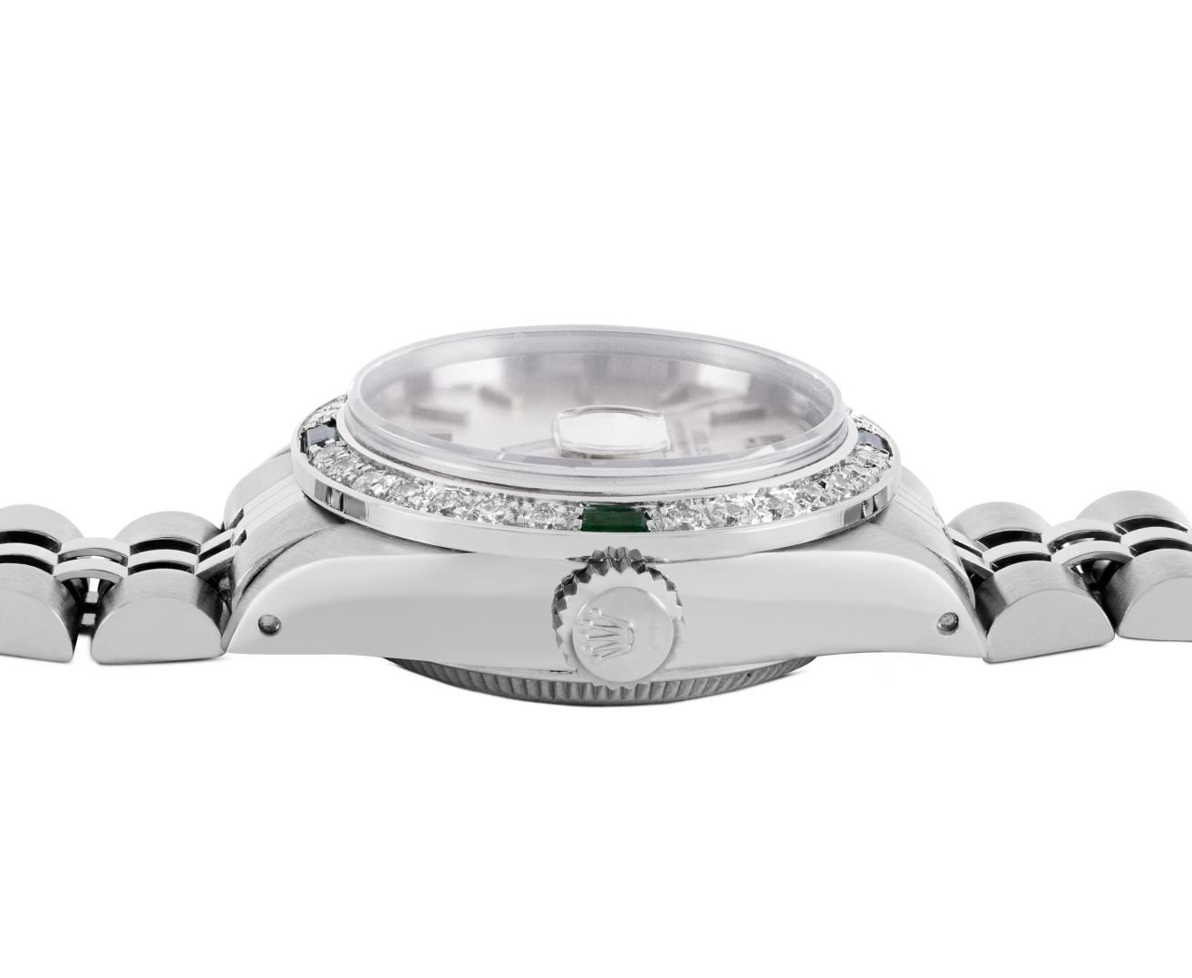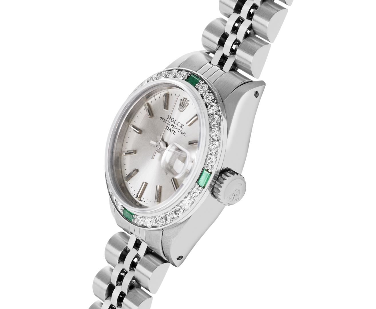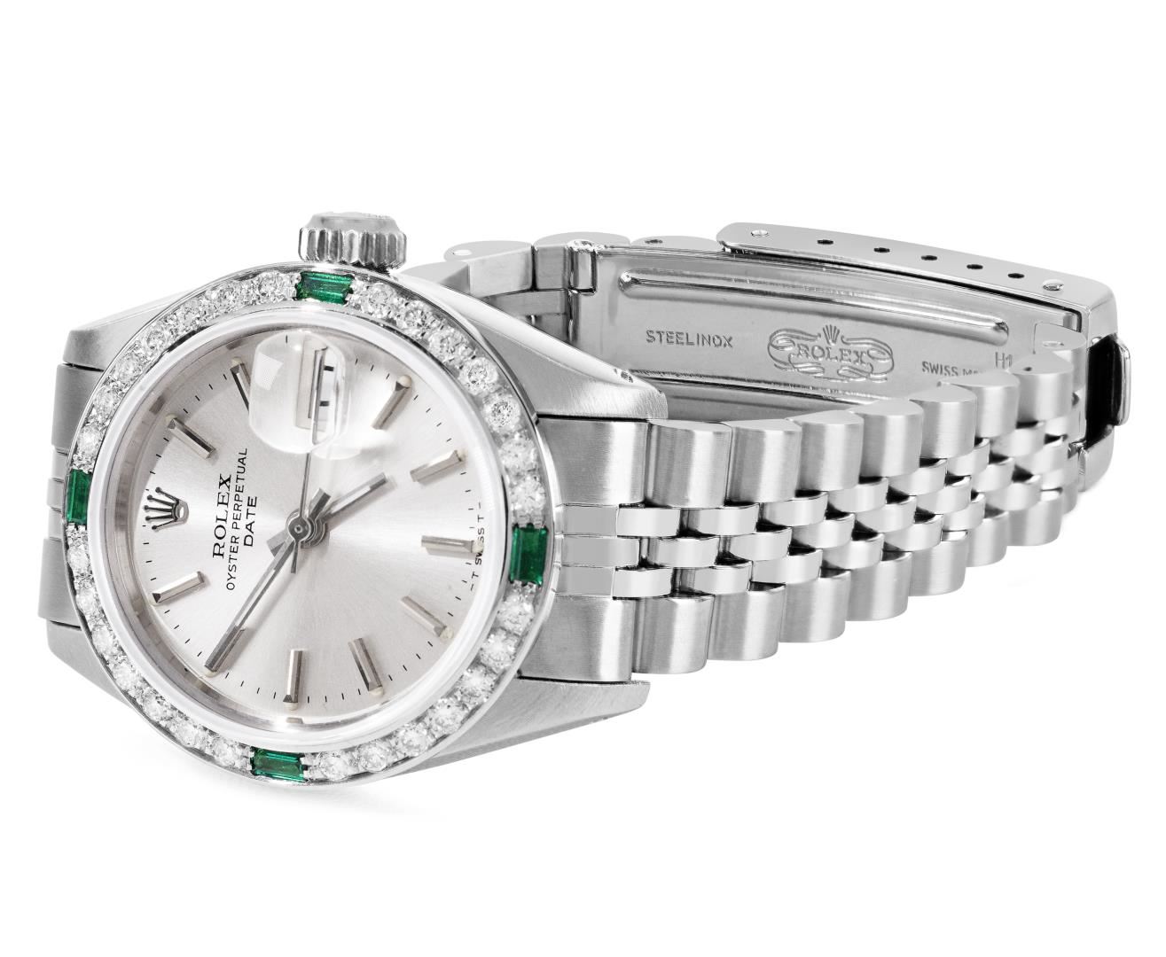One Rolex Ladies Pre Owned Stainless Steel Date Wristwatch Polished Bright with Satin Finish, Serviced & Electronically Tested, Stainless Steel Case: 26mm, Stainless Steel Crown, Custom Bezel: New 18K White Gold Emerald Beadset Diamond Bezel, Diamond + Gem Count: 36 Diamonds + 4 Emeralds, Clarity: SI-VS, Color: G to H. Custom Crystal: New Sapphire With Magnified Date Window. Custom Hands: New Luminescent Hands. Rolex Movement: Automatic Winding Movement 2035. Rolex Dial: Factory Silver With Index Hour Markers, Lumi Dots, and Dash Tracks. Date Window: 3 O'Clock Position Date Display, Model: Date. Condition: G-6 Extra Fine. Rolex Bracelet: Stainless Steel Jubilee Band. Bright Polish & Satin Finish. 6.0 Inch Length, Adjustable. Standard Clasp, With Rolex Logo. This Watch Has Been Serviced Time Tested And Is In Excellent Condition. It Is Free Of All Scratches And Dents. This Watch Comes With A Rolex Box.