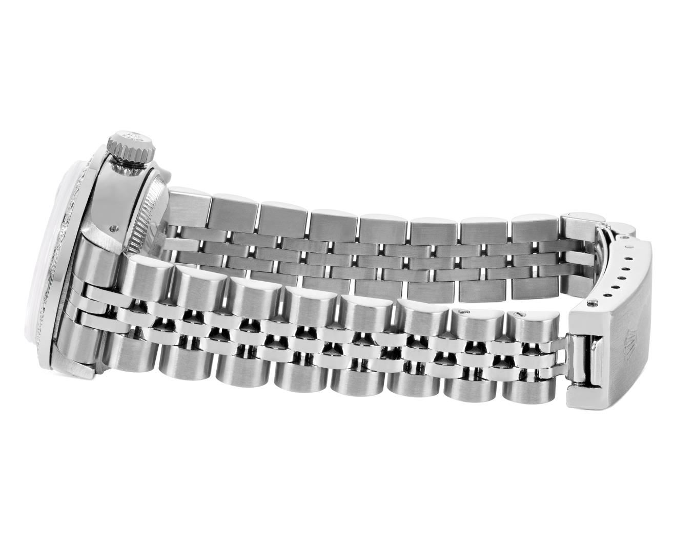 One Rolex Ladies Pre Owned Stainless Steel Date Wristwatch Polished Bright with Satin Finish, Serviced & Electronically Tested, Stainless Steel Case: 26mm, Stainless Steel Crown, Custom Bezel: New 18K White Gold Emerald Beadset Diamond Bezel, Diamond + Gem Count: 36 Diamonds + 4 Emeralds, Clarity: SI-VS, Color: G to H. Custom Crystal: New Sapphire With Magnified Date Window. Custom Hands: New Luminescent Hands. Rolex Movement: Automatic Winding Movement 2035. Rolex Dial: Factory Silver With Index Hour Markers, Lumi Dots, and Dash Tracks. Date Window: 3 O'Clock Position Date Display, Model: Date. Condition: G-6 Extra Fine. Rolex Bracelet: Stainless Steel Jubilee Band. Bright Polish & Satin Finish. 6.0 Inch Length, Adjustable. Standard Clasp, With Rolex Logo. This Watch Has Been Serviced Time Tested And Is In Excellent Condition. It Is Free Of All Scratches And Dents. This Watch Comes With A Rolex Box.