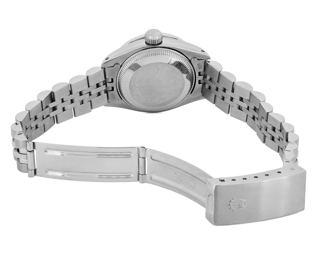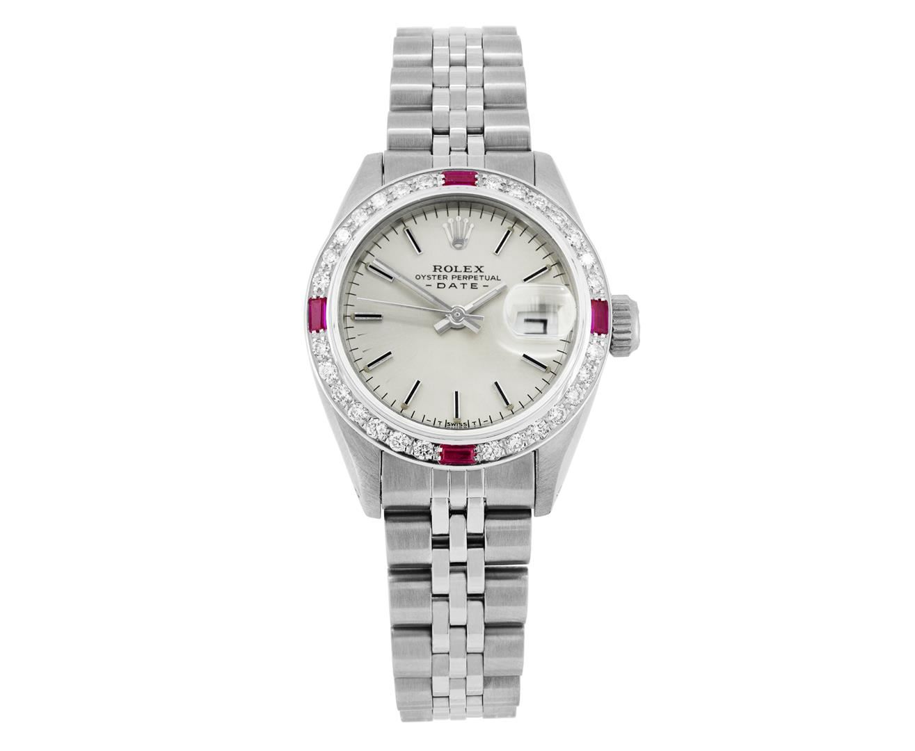 One Rolex Ladies Pre Owned Stainless Steel Date Wristwatch Polished Bright with Satin Finish, Serviced & Electronically Tested, Stainless Steel Case: 26mm, Stainless Steel Crown, Custom Bezel: New 18K White Gold Ruby Beadset Diamond Bezel, Diamond + Gem Count: 36 Diamonds + 4 Rubies, Clarity: SI-VS, Color: G to H. Custom Crystal: New Sapphire With Magnified Date Window. Custom Hands: New Luminescent Hands. Rolex Movement: Automatic Winding Movement. Rolex Dial: Factory Silver Dial With Black Index Hour Markers And Lumi Dots. Date Window: 3 O'Clock Position Date Display, Model: Datej. Condition: G-6 Extra Fine. Rolex Bracelet: Stainless Steel Jubilee Band. Bright Polish & Satin Finish. 6.0 Inch Length, Adjustable. Standard Clasp, With Rolex Logo. This Watch Has Been Serviced Time Tested And Is In Excellent Condition. It Is Free Of All Scratches And Dents. This Watch Comes With A Rolex Box.