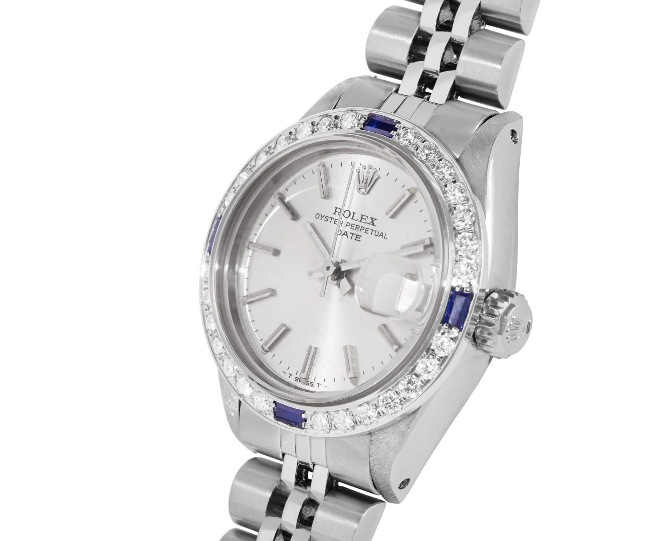 One Rolex Ladies Pre Owned Stainless Steel Date Wristwatch Polished Bright with Satin Finish, Serviced & Electronically Tested, Stainless Steel Case: 26mm, Stainless Steel Crown, Custom Bezel: New 18K White Gold Sapphire Beadset Diamond Bezel, Diamond + Gem Count: 36 Diamonds + 4 Sapphires, Clarity: SI-VS, Color: G to H. Custom Crystal: New Sapphire With Magnified Date Window. Custom Hands: New Luminescent Hands. Rolex Movement: Automatic Winding Movement 2035. Rolex Dial: Factory Silver With Index Hour Markers and Lumi Markers, Dash Track, and Lumi Dots. Date Window: 3 O'Clock Position Date Display, Model: Date. Condition: G-6 Extra Fine. Rolex Bracelet: Stainless Steel Jubilee Band. Bright Polish & Satin Finish. 6.0 Inch Length, Adjustable. Standard Clasp, With Rolex Logo. This Watch Has Been Serviced Time Tested And Is In Excellent Condition. It Is Free Of All Scratches And Dents.