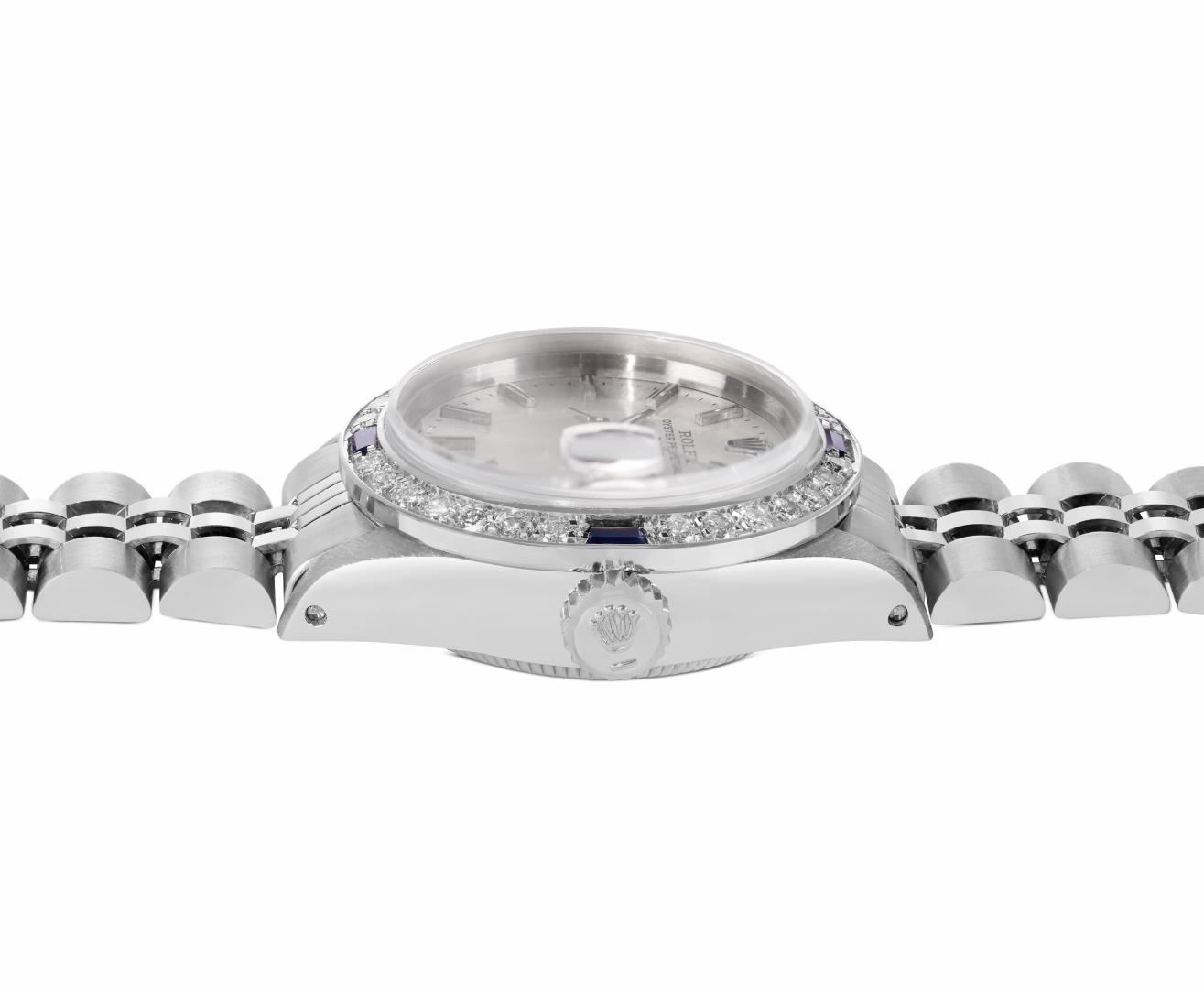 One Rolex Ladies Pre Owned Stainless Steel Date Wristwatch Polished Bright with Satin Finish, Serviced & Electronically Tested, Stainless Steel Case: 26mm, Stainless Steel Crown, Custom Bezel: New 18K White Gold Sapphire Beadset Diamond Bezel, Diamond + Gem Count: 36 Diamonds + 4 Sapphires, Clarity: SI-VS, Color: G to H. Custom Crystal: New Sapphire With Magnified Date Window. Custom Hands: New Luminescent Hands. Rolex Movement: Automatic Winding Movement 2035. Rolex Dial: Factory Silver With Index Hour Markers and Lumi Markers, Dash Track, and Lumi Dots. Date Window: 3 O'Clock Position Date Display, Model: Date. Condition: G-6 Extra Fine. Rolex Bracelet: Stainless Steel Jubilee Band. Bright Polish & Satin Finish. 6.0 Inch Length, Adjustable. Standard Clasp, With Rolex Logo. This Watch Has Been Serviced Time Tested And Is In Excellent Condition. It Is Free Of All Scratches And Dents.