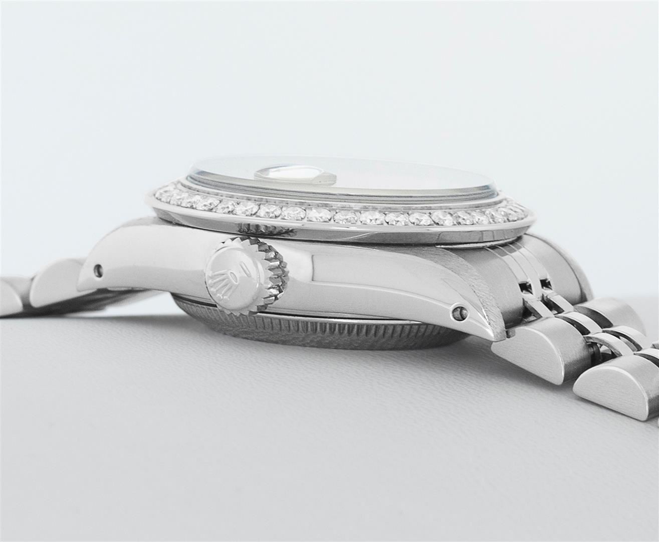 One Ladies Pre Owned Stainless Steel Rolex Polished Bright with Satin Finish, Serviced & Electronically Tested, Stainless Steel Case: 26mm, Stainless Steel Crown, Custom Bezel: New Stainless Steel Beadset Diamond Bezel, Diamond Count: 40 Diamonds On Bezel, Color: G To H, Clarity: SI-VS. Custom Crystal: New Acrylic With Magnified Date Window. Custom Hands: New Luminescent Hands. Rolex Movement: Automatic Winding Movement. Rolex Dial: Silver Index With Dash Track. Date Window: 3 O'Clock Position Date Display, Model: Date. Condition: G-6 Extra Fine. Rolex Bracelet: Stainless Steel Jubilee Band. Bright Polish & Satin Finish. 6.0 Inch Length, Adjustable. Standard Clasp, With Rolex Logo. This Watch Has Been Serviced Time Tested And Is In Excellent Condition It Is Free Of All Scratches And Dents.