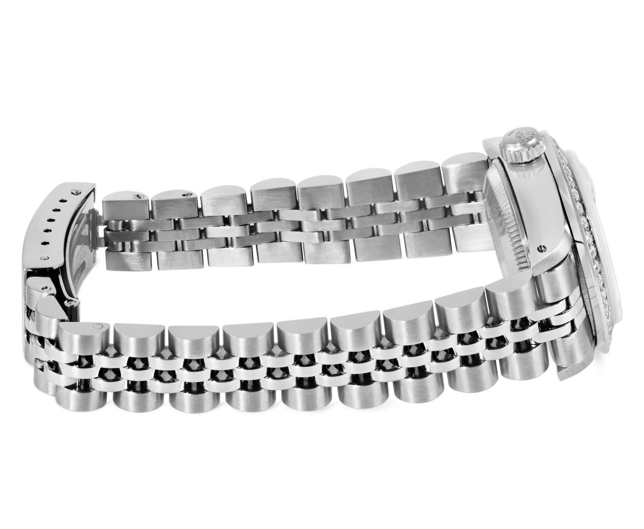 One Rolex Ladies Pre Owned Stainless Steel Date Wristwatch Polished Bright with Satin Finish, Serviced & Electronically Tested, Stainless Steel Case: 26mm, Stainless Steel Crown, Custom Bezel: New Stainless Steel Beadset Diamond Bezel, Diamond Count: 40 Diamonds. Custom Crystal: New Sapphire With Magnified Date Window. Custom Hands: New Luminescent Hands. Rolex Movement: Automatic Winding Movement 2035. Rolex Dial: Factory Silver With Index Hour Markers And Lumi Dots. Date Window: 3 O'Clock Position Date Display, Model: Date. Condition: G-6 Extra Fine. Rolex Bracelet: Stainless Steel Jubilee Band. Bright Polish And Satin Finish. 6.0 Inch Length, Adjustable. Standard Clasp, With Rolex Logo. This Watch Has Been Serviced And Time Tested. It Is In Excellent Condition, Free Of All Scratches And Dents. This Watch Comes With A Rolex Box.
