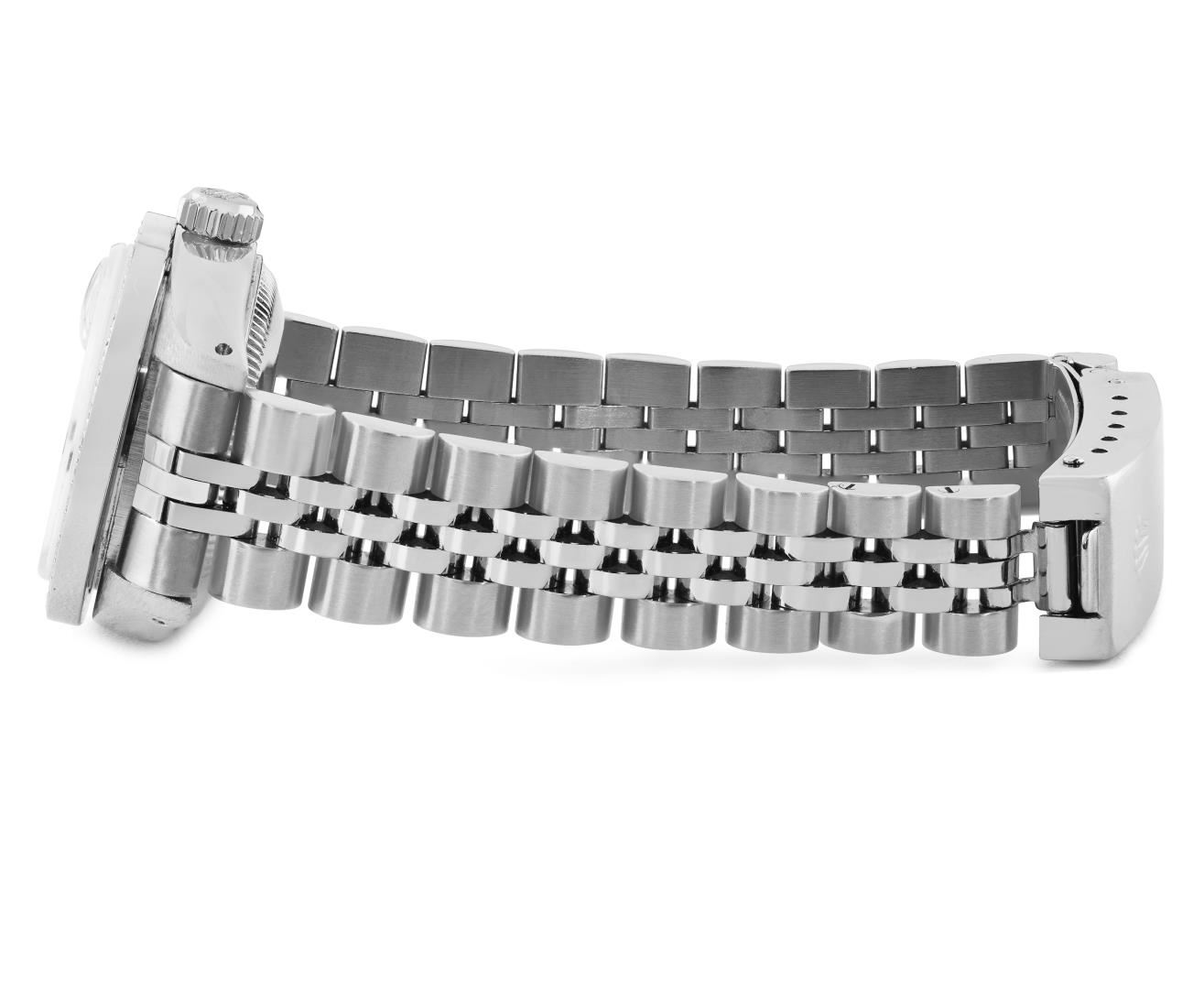 One Rolex Ladies Pre Owned Stainless Steel Date Wristwatch Polished Bright with Satin Finish, Serviced & Electronically Tested, Stainless Steel Case: 26mm, Stainless Steel Crown, Custom Bezel: New Stainless Steel Diamond Bezel, Diamond Count: 44 Diamonds. Custom Crystal: New Sapphire With Magnified Date Window. Custom Hands: New Luminescent Hands. Rolex Movement: Automatic Winding Movement 2035. Rolex Dial: Factory Silver Dial With Index Hour Markers And Lumi Dots. Date Window: 3 O'Clock Position Date Display, Model: Date. Condition: G-6 Extra Fine. Rolex Bracelet: Stainless Steel Jubilee Band. Bright Polish And Satin Finish. 6.0 Inch Length, Adjustable. Standard Clasp, With Rolex Logo. This Watch Has Been Serviced And Time Tested. It Is In Excellent Condition, Free Of All Scratches And Dents. This Watch Comes With A Rolex Box.