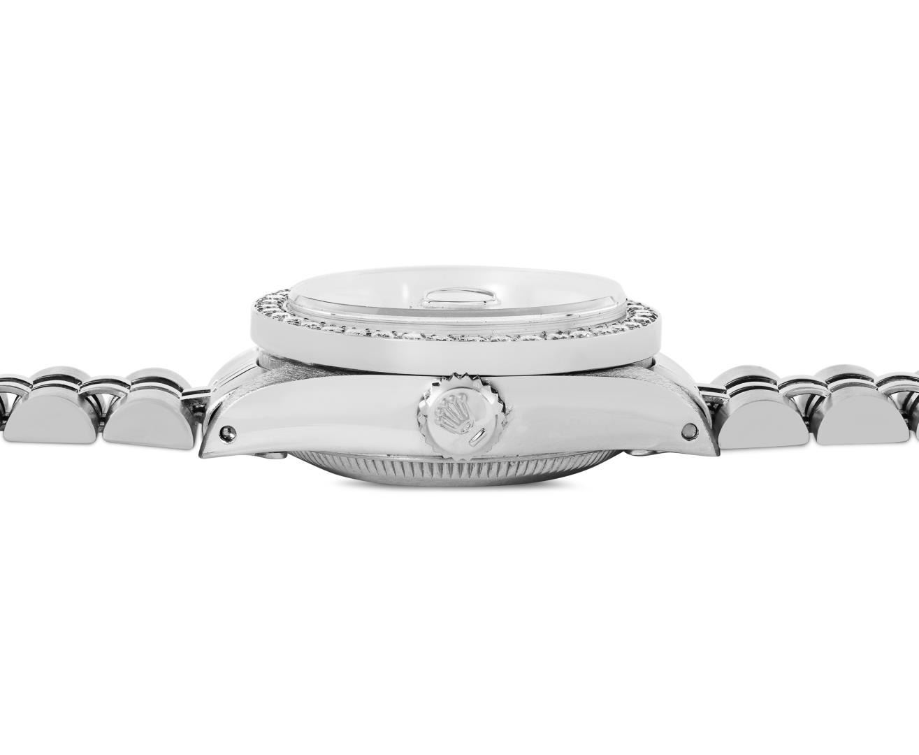 One Rolex Ladies Pre Owned Stainless Steel Date Wristwatch Polished Bright with Satin Finish, Serviced & Electronically Tested, Stainless Steel Case: 26mm, Stainless Steel Crown, Custom Bezel: New Stainless Steel Diamond Bezel, Diamond Count: 44 Diamonds. Custom Crystal: New Sapphire With Magnified Date Window. Custom Hands: New Luminescent Hands. Rolex Movement: Automatic Winding Movement 2035. Rolex Dial: Factory Silver Dial With Index Hour Markers And Lumi Dots. Date Window: 3 O'Clock Position Date Display, Model: Date. Condition: G-6 Extra Fine. Rolex Bracelet: Stainless Steel Jubilee Band. Bright Polish And Satin Finish. 6.0 Inch Length, Adjustable. Standard Clasp, With Rolex Logo. This Watch Has Been Serviced And Time Tested. It Is In Excellent Condition, Free Of All Scratches And Dents. This Watch Comes With A Rolex Box.