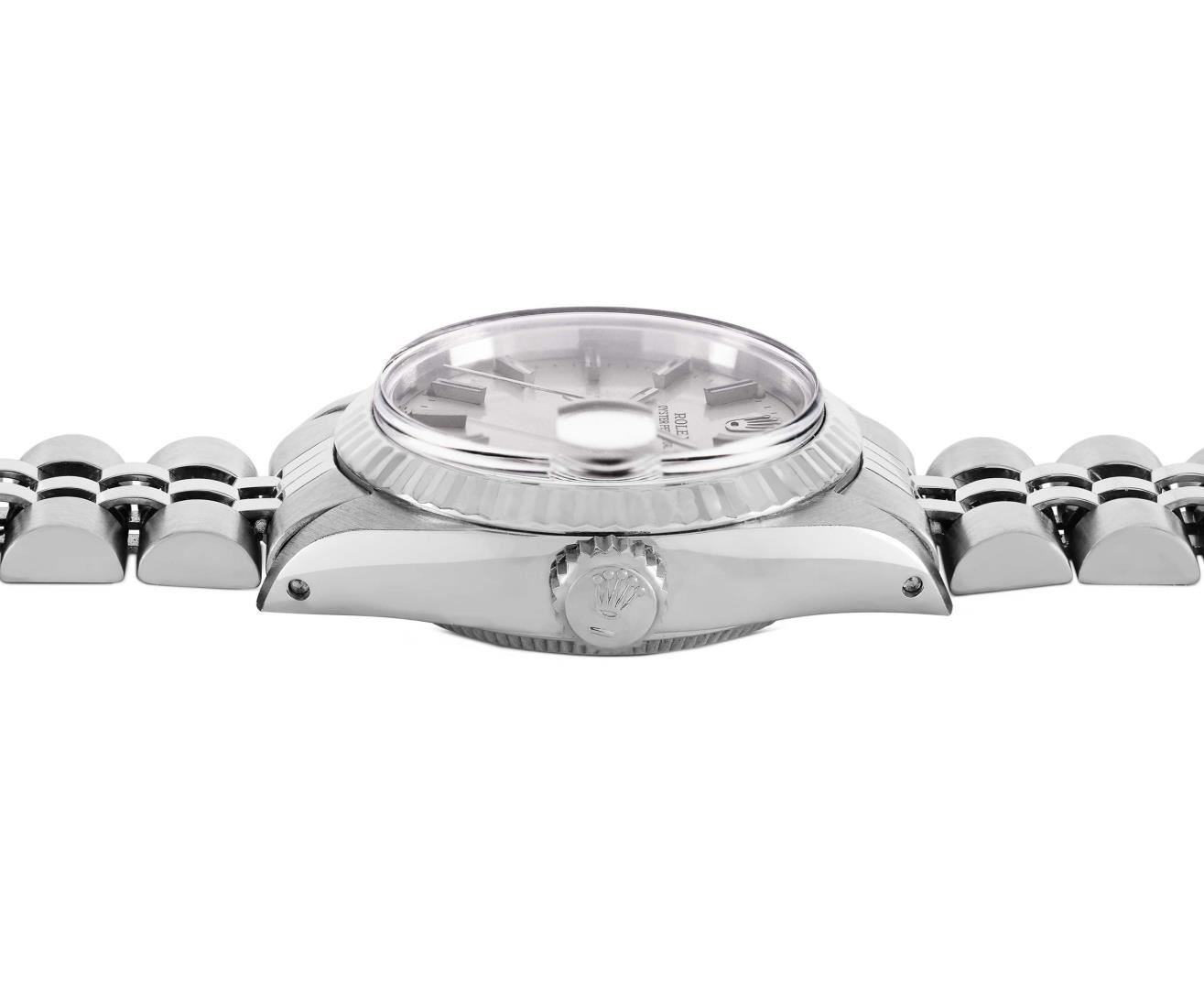 One Rolex Ladies Pre Owned Stainless Steel Date Wristwatch Polished Bright with Satin Finish, Serviced & Electronically Tested, Stainless Steel Case: 26mm, Stainless Steel Crown, 14K White Gold Fluted Bezel, Custom Crystal: New Acrylic With Magnifying Date Window. Custom Hands: New Luminescent Hands. Rolex Movement: Automatic Winding Movement 2035. Rolex Dial: Factory Silver With Index Hour Markers, Dash Tracks, And Lumi Dots. Date Window: 3 O'Clock Position Date Display, Model: Date. Condition: G-6 Extra Fine. Rolex Bracelet: Stainless Steel Jubilee Band. Bright Polish & Satin Finish. 6.0 Inch Length, Adjustable. Standard Clasp, With Rolex Logo. This Watch Has Been Serviced Time Tested And Is In Excellent Condition. It Is Free Of All Scratches And Dents.