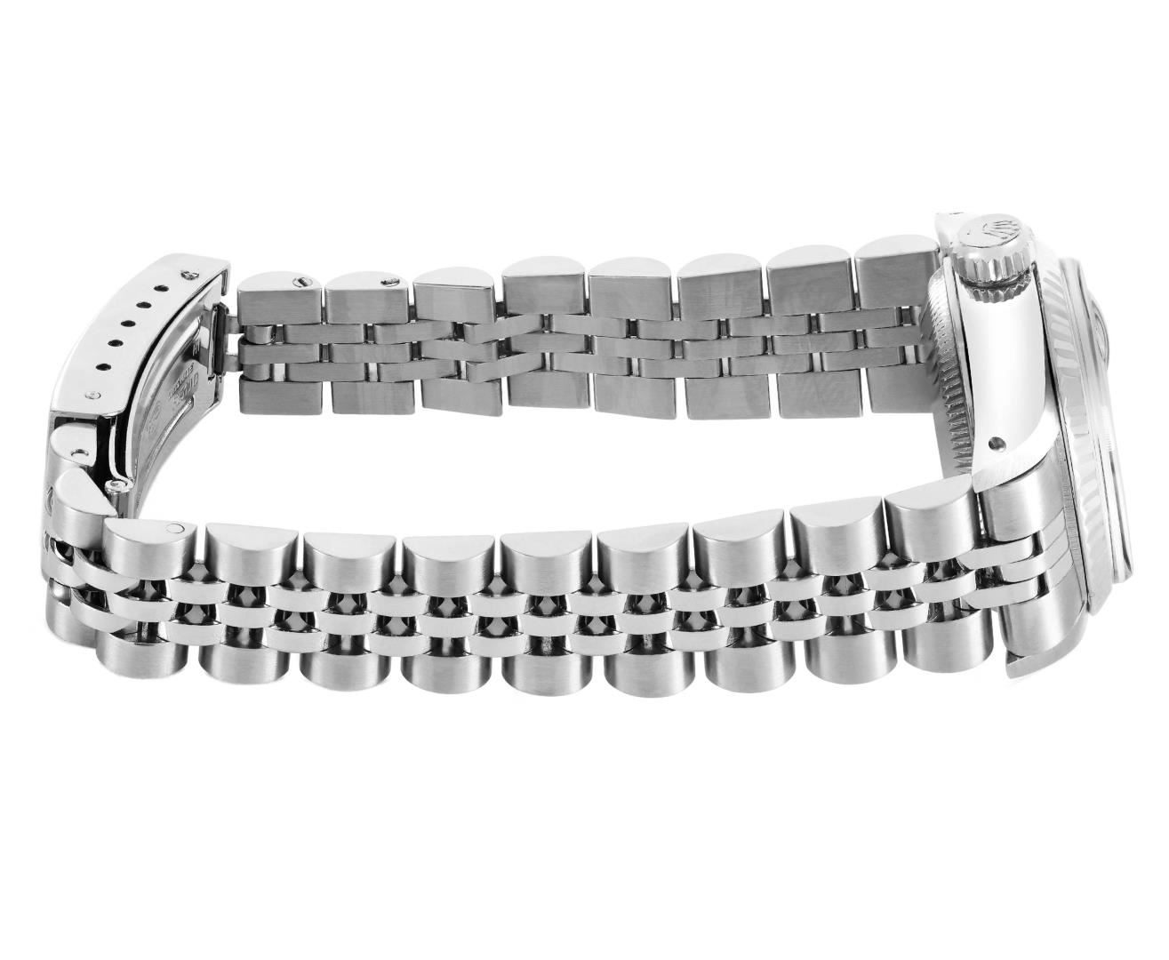 One Rolex Ladies Pre Owned Stainless Steel Date Wristwatch Polished Bright with Satin Finish, Serviced & Electronically Tested, Stainless Steel Case: 26mm, Stainless Steel Crown, 14K White Gold Fluted Bezel, Custom Crystal: New Acrylic With Magnifying Date Window. Custom Hands: New Luminescent Hands. Rolex Movement: Automatic Winding Movement 2035. Rolex Dial: Factory Silver With Index Hour Markers, Dash Tracks, And Lumi Dots. Date Window: 3 O'Clock Position Date Display, Model: Date. Condition: G-6 Extra Fine. Rolex Bracelet: Stainless Steel Jubilee Band. Bright Polish & Satin Finish. 6.0 Inch Length, Adjustable. Standard Clasp, With Rolex Logo. This Watch Has Been Serviced Time Tested And Is In Excellent Condition. It Is Free Of All Scratches And Dents.