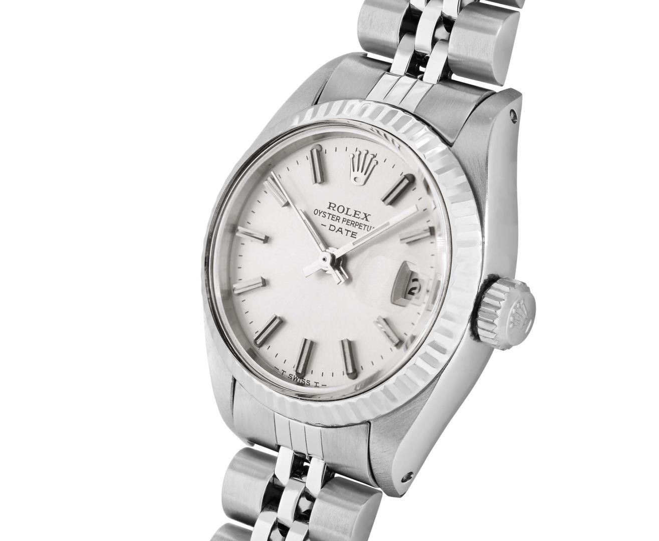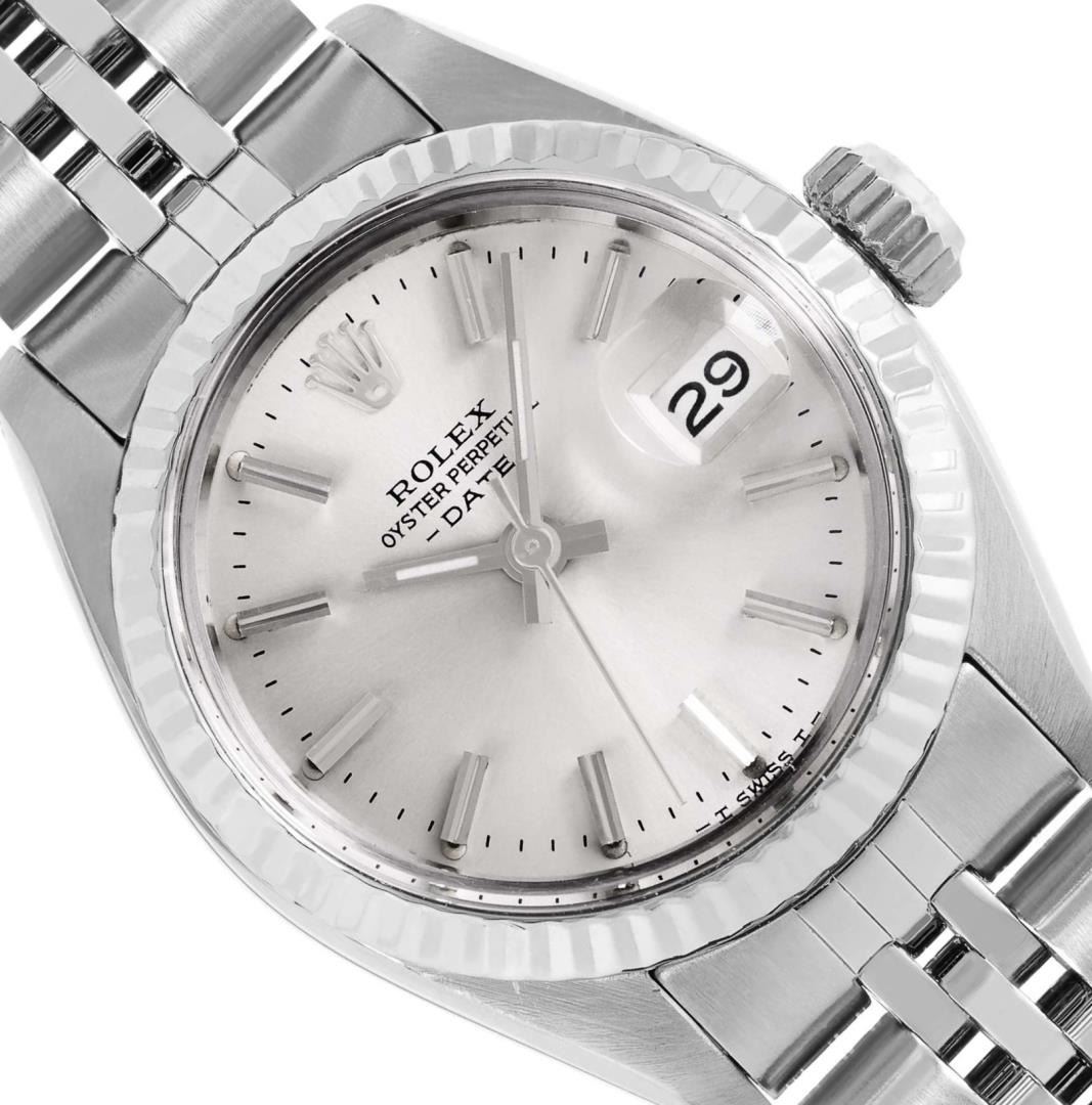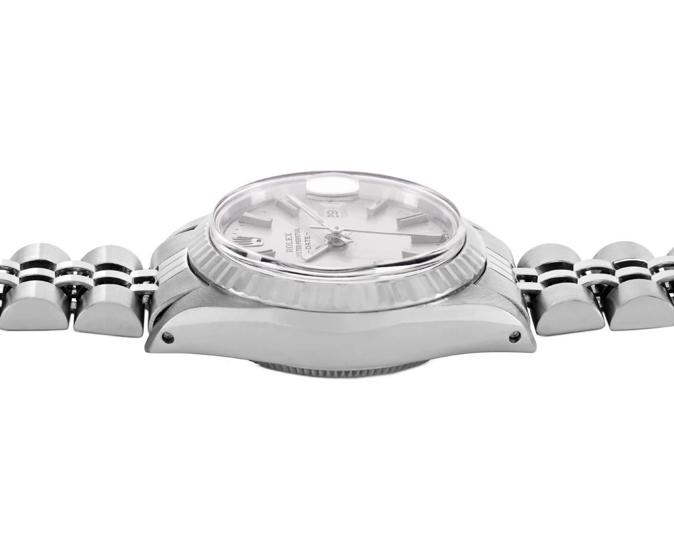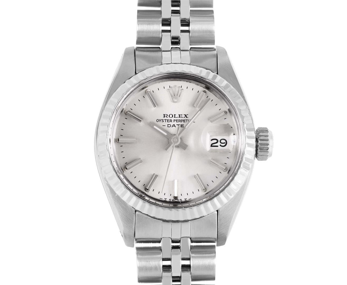 One Rolex Ladies Pre Owned Stainless Steel Date Wristwatch Polished Bright with Satin Finish, Serviced & Electronically Tested, Stainless Steel Case: 26mm, Stainless Steel Crown, 14K White Gold Fluted Bezel, Custom Crystal: New Acrylic With Magnifying Date Window. Custom Hands: New Luminescent Hands. Rolex Movement: Automatic Winding Movement 2035. Rolex Dial: Factory Silver With Index Hour Markers, Dash Tracks, And Lumi Dots. Date Window: 3 O'Clock Position Date Display, Model: Date. Condition: G-6 Extra Fine. Rolex Bracelet: Stainless Steel Jubilee Band. Bright Polish & Satin Finish. 6.0 Inch Length, Adjustable. Standard Clasp, With Rolex Logo. This Watch Has Been Serviced Time Tested And Is In Excellent Condition. It Is Free Of All Scratches And Dents.