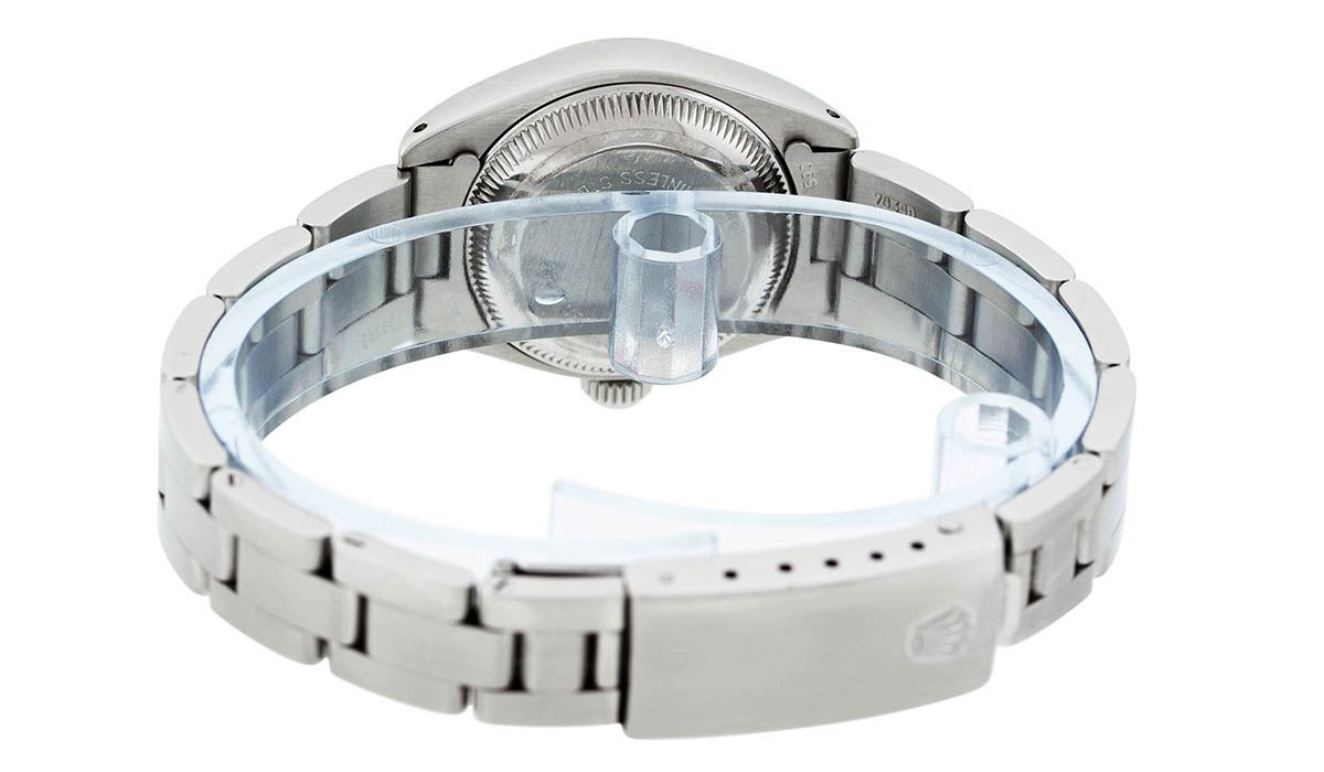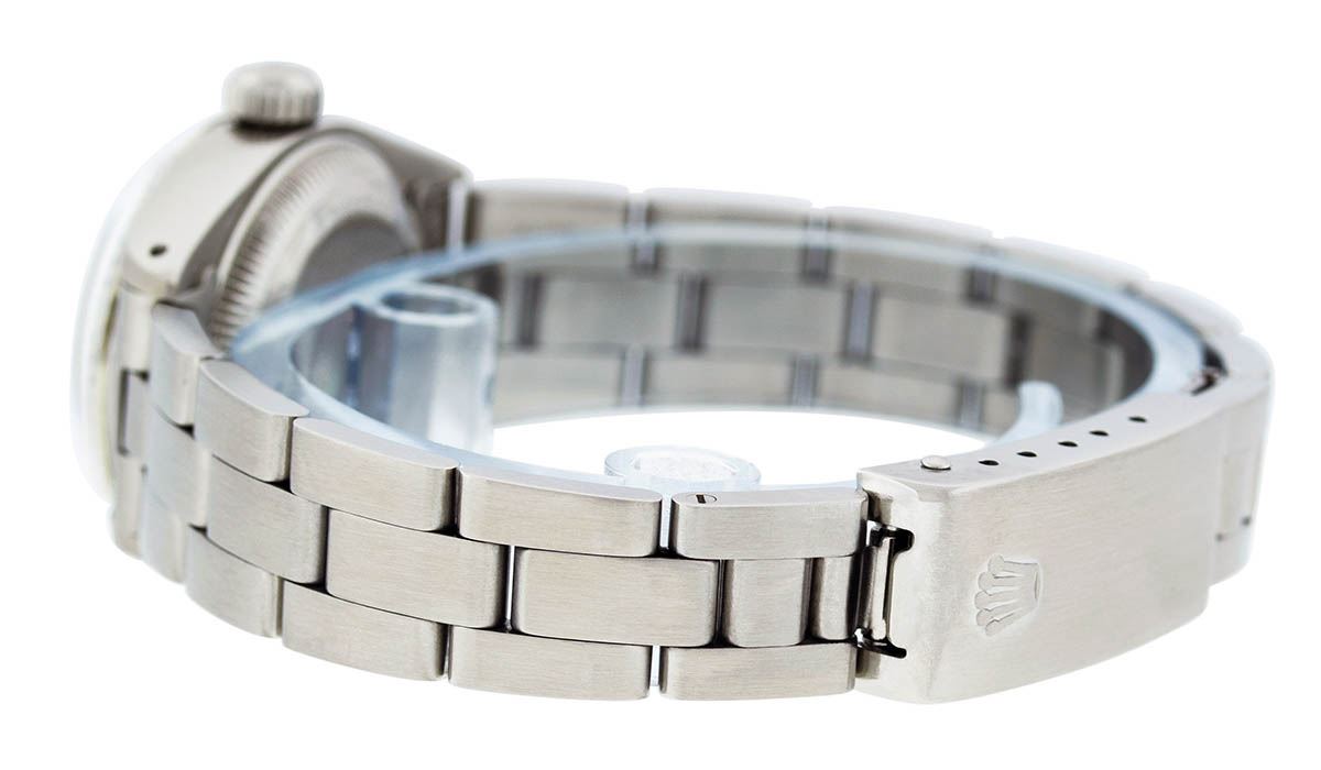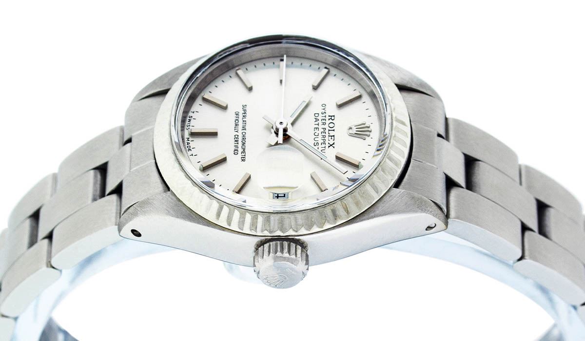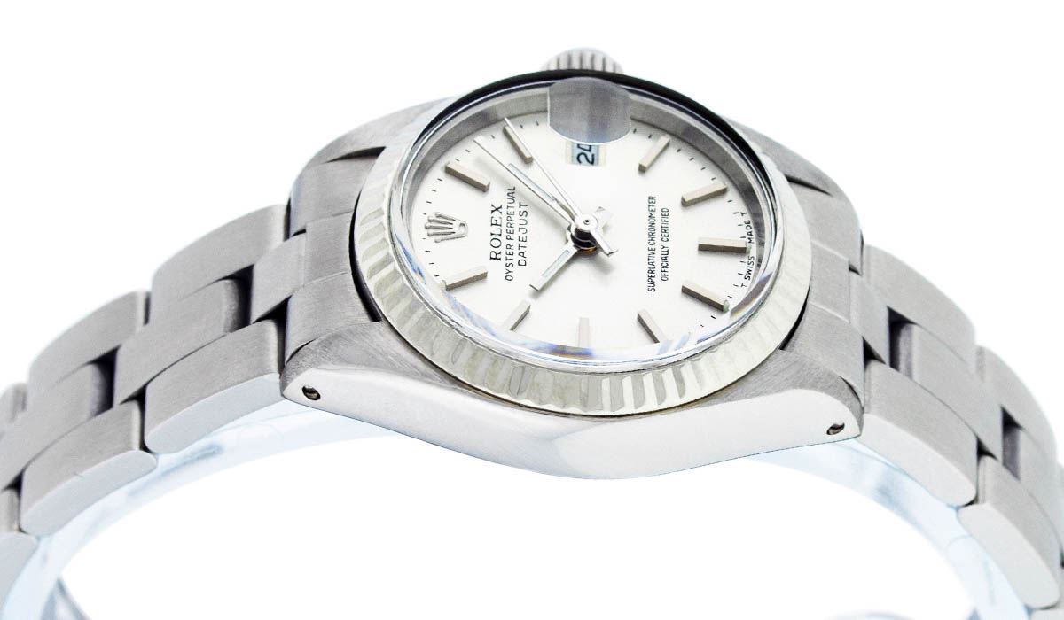 One Ladies Rolex Datejust Polished Bright with Satin Finish, Serviced & Electronically Tested, Stainless Steel Case:26mm, Stainless Steel Crown, Bezel: 14K White Gold Fluted Bezel. Custom Crystal: Acrylic Cyclops Lens. Movement: Automatic Winding Movement Caliber 2030. Dial: Silver Index Dial With Lumi Dot and Dash Track. Date Window: 3 O'Clock Position Date Display, Model: Datejust. Condition: G-6 Extra Fine. Bracelet: Stainless Steel Oyster Band. Bright Polish & Satin Finish. 6.0 Inch Length, Adjustable. Standard Clasp, With Rolex Logo. This watch has been serviced and polished and its free of all dents and scratches and has been time tested.