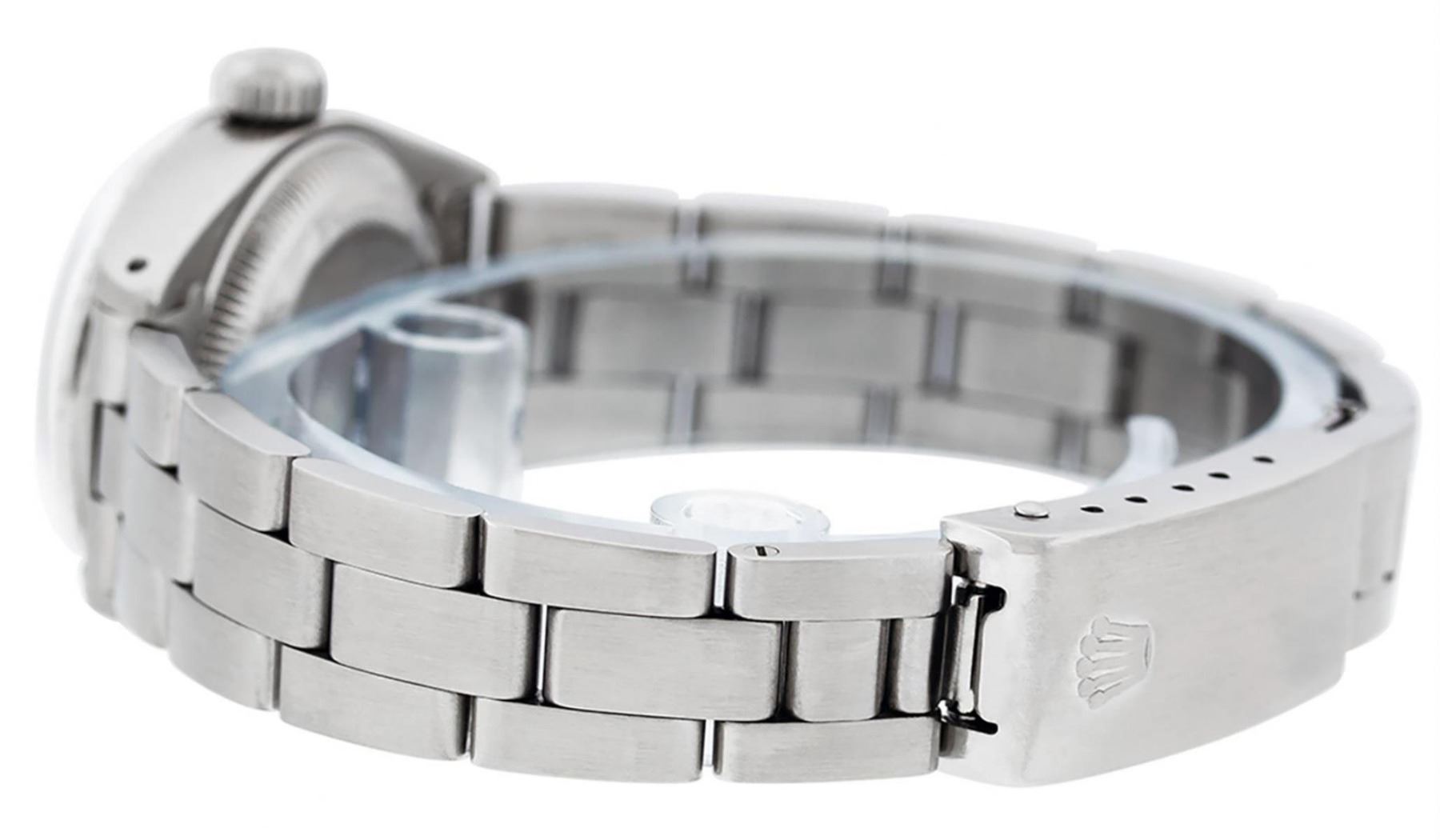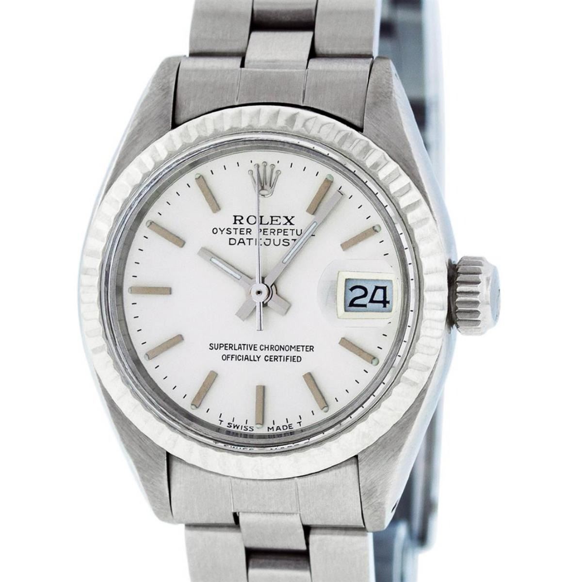 One Ladies Stainless Steel Rolex Datejust Polished Bright with Satin Finish, Serviced & Electronically Tested, Stainless Steel Case: 26mm, Stainless Steel Crown, Bezel: 14K White Gold Fluted Bezel. Custom Crystal: New Acrylic Cyclops Lens. Custom Hands: New Luminescent Hands. Movement: Automatic Winding Movement. Dial: Silver Index Dial. Date Window: 3 O'Clock Position Date Display, Model: Datejust. Condition: G-6 Extra Fine. Bracelet: Stainless Steel Oyster Band. Bright Polish & Satin Finish. 6.0 Inch Length, Adjustable. Standard Clasp, With Rolex Logo. This Watch Has Been Serviced Time Tested And Is In Excellent Condition It Is Free Of All Scratches And Dents.
