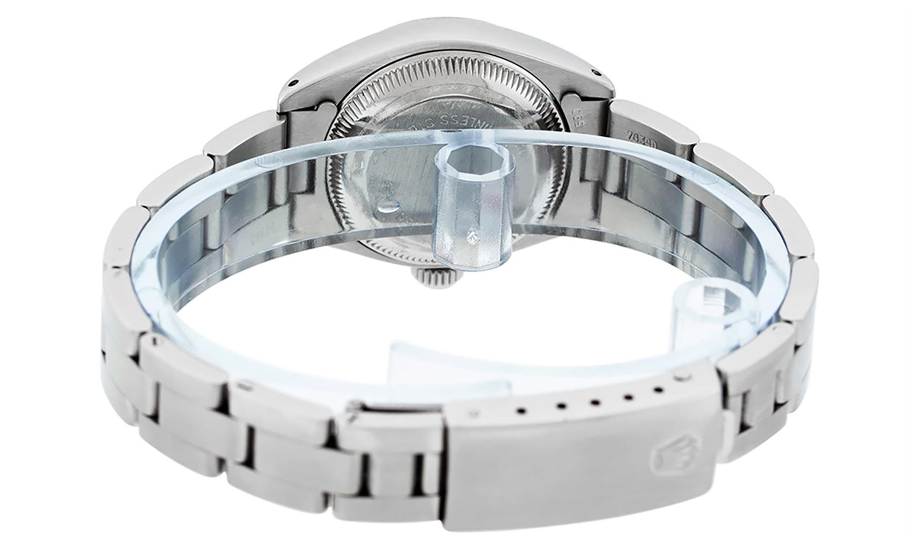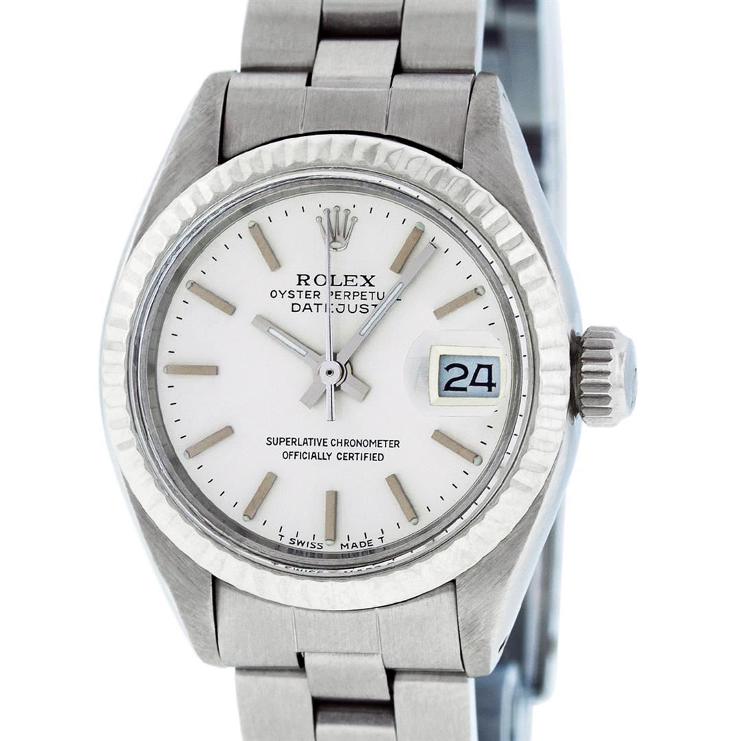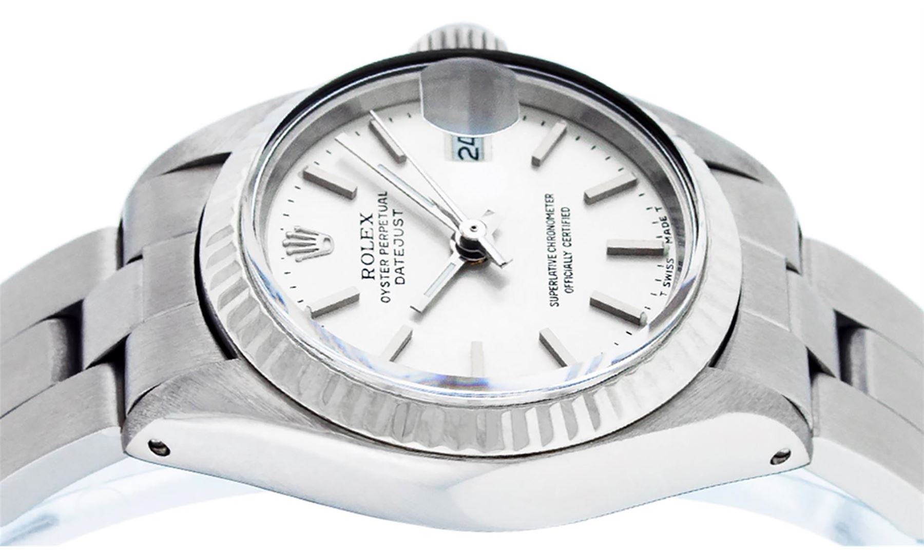 One Ladies Pre Owned Stainless Steel Rolex Polished Bright with Satin Finish, Serviced & Electronically Tested, Stainless Steel Case: 26mm, Stainless Steel Crown, Bezel: 14K White Gold Fluted Bezel. Custom Crystal: New Acrylic With Date Window. Custom Hands: New Luminescent Hands. Rolex Movement: Automatic Winding Movement. Rolex Dial: Silver Index With Dash Track. Date Window: 3 O'Clock Position Date Display, Model: Date. Condition: G-6 Extra Fine. Rolex Bracelet: Stainless Steel Oyster Band. Bright Polish & Satin Finish. 6.0 Inch Length, Adjustable. Standard Clasp, With Rolex Logo. This Watch Has Been Serviced Time Tested And Is In Excellent Condition It Is Free Of All Scratches And Dents.