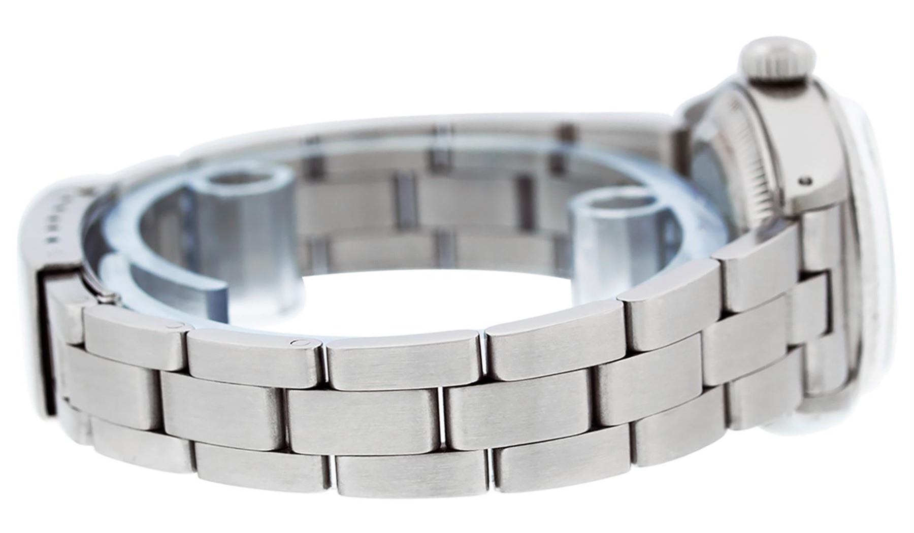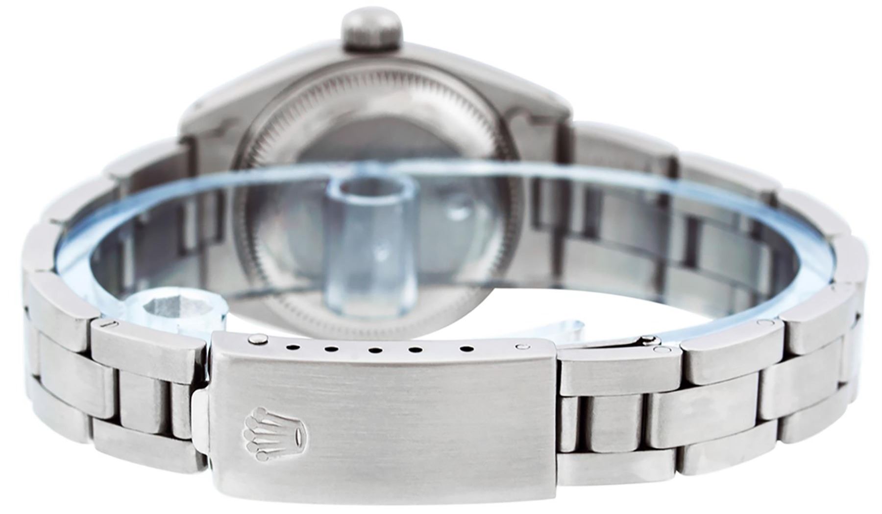 One Ladies Pre Owned Stainless Steel Rolex Polished Bright with Satin Finish, Serviced & Electronically Tested, Stainless Steel Case: 26mm, Stainless Steel Crown, Bezel: 14K White Gold Fluted Bezel. Custom Crystal: New Acrylic With Date Window. Custom Hands: New Luminescent Hands. Rolex Movement: Automatic Winding Movement. Rolex Dial: Silver Index With Dash Track. Date Window: 3 O'Clock Position Date Display, Model: Date. Condition: G-6 Extra Fine. Rolex Bracelet: Stainless Steel Oyster Band. Bright Polish & Satin Finish. 6.0 Inch Length, Adjustable. Standard Clasp, With Rolex Logo. This Watch Has Been Serviced Time Tested And Is In Excellent Condition It Is Free Of All Scratches And Dents.