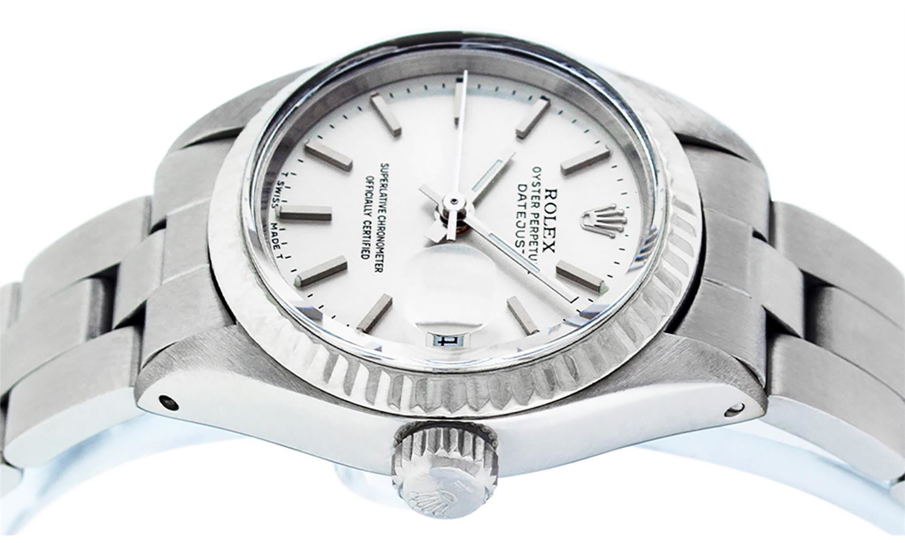 One Ladies Pre Owned Stainless Steel Rolex Polished Bright with Satin Finish, Serviced & Electronically Tested, Stainless Steel Case: 26mm, Stainless Steel Crown, Bezel: 14K White Gold Fluted Bezel. Custom Crystal: New Acrylic With Date Window. Custom Hands: New Luminescent Hands. Rolex Movement: Automatic Winding Movement. Rolex Dial: Silver Index With Dash Track. Date Window: 3 O'Clock Position Date Display, Model: Date. Condition: G-6 Extra Fine. Rolex Bracelet: Stainless Steel Oyster Band. Bright Polish & Satin Finish. 6.0 Inch Length, Adjustable. Standard Clasp, With Rolex Logo. This Watch Has Been Serviced Time Tested And Is In Excellent Condition It Is Free Of All Scratches And Dents.