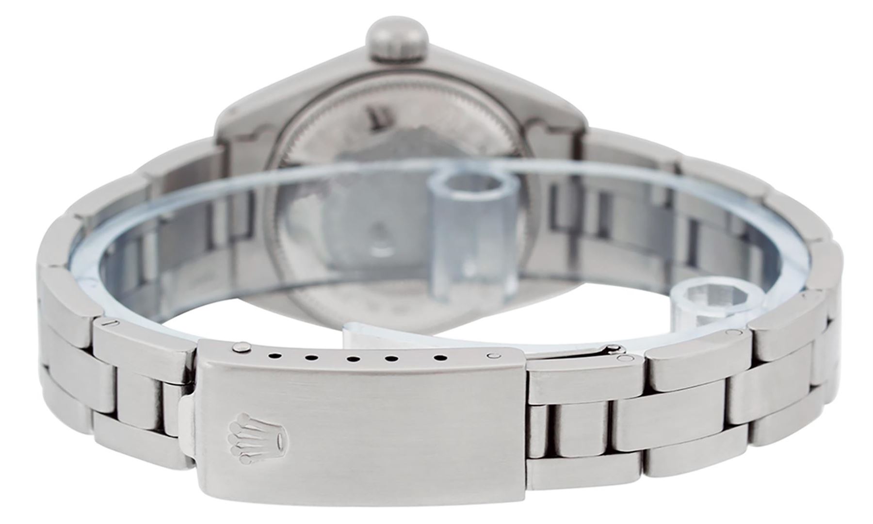 One Ladies Stainless Pre Owned Steel Rolex Datejust Polished Bright with Satin Finish, Serviced & Electronically Tested, Stainless Steel Case: 26mm, Stainless Steel Crown, Bezel: Stainless Steel Smooth Bezel. Custom Crystal: New Plastic With Date Window. Custom Hands: New Luminescent Hands. Rolex Movement: Automatic Winding Movement. Rolex Dial: Silver Index Dial. Date Window: 3 O'Clock Position Date Display, Model: Datejust. Condition: G-6 Extra Fine. Rolex Bracelet: Stainless Steel Oyster Band. Bright Polish & Satin Finish. 6.0 Inch Length, Adjustable. Standard Clasp, With Rolex Logo. This Watch Has Been Serviced Time Tested And Is In Excellent Condition It Is Free Of All Scratches And Dents.