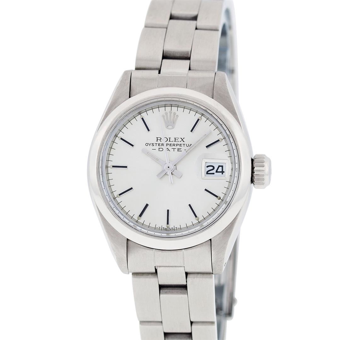 One Ladies Stainless Pre Owned Steel Rolex Polished Bright with Satin Finish, Serviced & Electronically Tested, Stainless Steel Case: 26mm, Stainless Steel Crown, Rolex Bezel: Stainless Steel Smooth Bezel. Custom Crystal: New Plastic With Date Window. Custom Hands: New Luminescent Hands. Rolex Movement: Automatic Winding Movement. Rolex Dial: Silver Index Dial With Dash Track. Date Window: 3 O'Clock Position Date Display, Model: Date. Condition: G-6 Extra Fine. Rolex Bracelet: Stainless Steel Oyster Band. Bright Polish & Satin Finish. 6.0 Inch Length, Adjustable. Standard Clasp, With Rolex Logo. This Watch Has Been Serviced Time Tested And Is In Excellent Condition It Is Free Of All Scratches And Dents.
