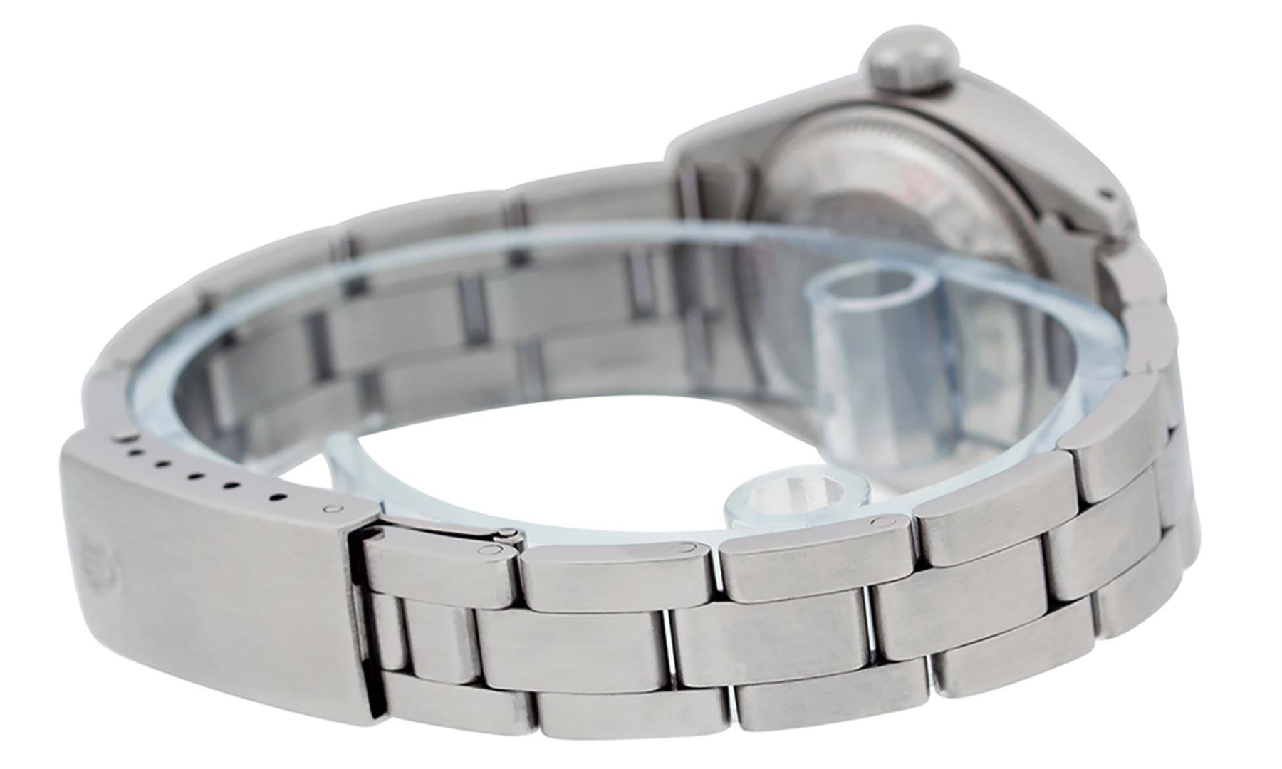 One Ladies Stainless Pre Owned Steel Rolex Polished Bright with Satin Finish, Serviced & Electronically Tested, Stainless Steel Case: 26mm, Stainless Steel Crown, Rolex Bezel: Stainless Steel Smooth Bezel. Custom Crystal: New Plastic With Date Window. Custom Hands: New Luminescent Hands. Rolex Movement: Automatic Winding Movement. Rolex Dial: Silver Index Dial With Dash Track. Date Window: 3 O'Clock Position Date Display, Model: Date. Condition: G-6 Extra Fine. Rolex Bracelet: Stainless Steel Oyster Band. Bright Polish & Satin Finish. 6.0 Inch Length, Adjustable. Standard Clasp, With Rolex Logo. This Watch Has Been Serviced Time Tested And Is In Excellent Condition It Is Free Of All Scratches And Dents.