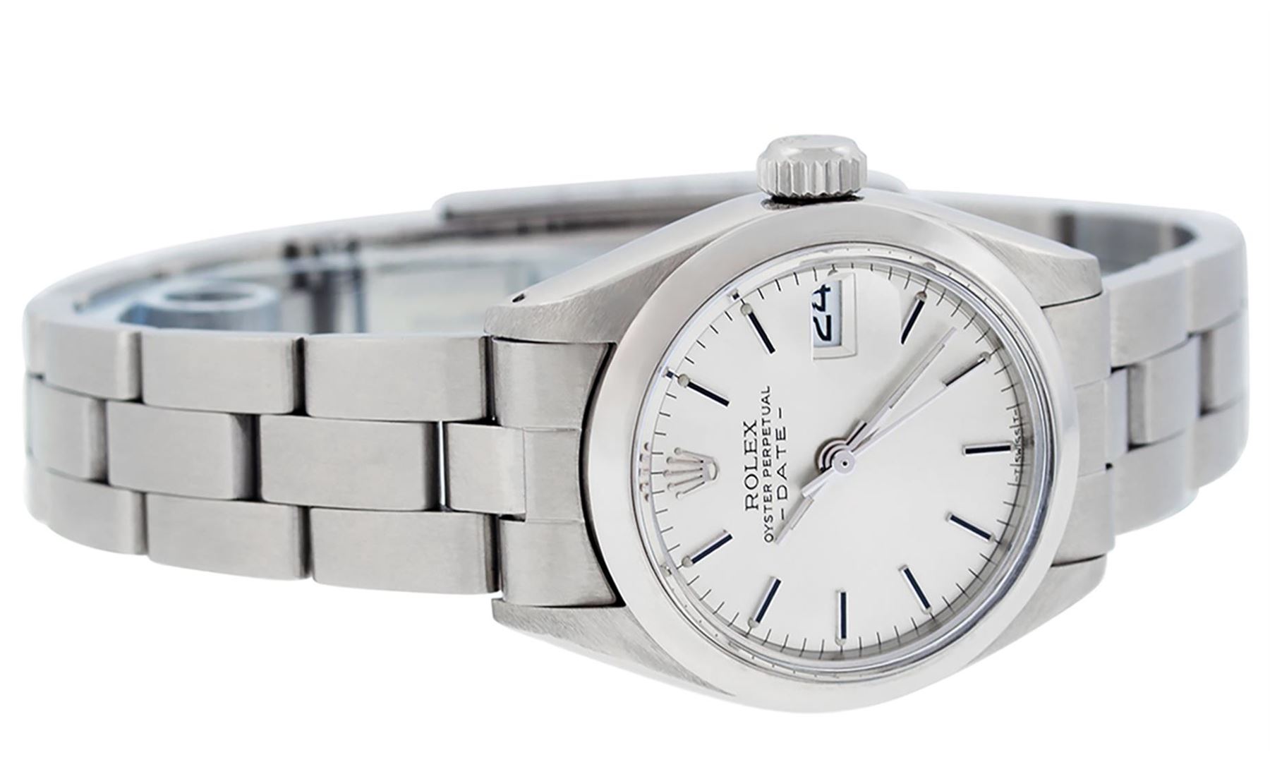 One Ladies Stainless Pre Owned Steel Rolex Polished Bright with Satin Finish, Serviced & Electronically Tested, Stainless Steel Case: 26mm, Stainless Steel Crown, Rolex Bezel: Stainless Steel Smooth Bezel. Custom Crystal: New Plastic With Date Window. Custom Hands: New Luminescent Hands. Rolex Movement: Automatic Winding Movement. Rolex Dial: Silver Index Dial With Dash Track. Date Window: 3 O'Clock Position Date Display, Model: Date. Condition: G-6 Extra Fine. Rolex Bracelet: Stainless Steel Oyster Band. Bright Polish & Satin Finish. 6.0 Inch Length, Adjustable. Standard Clasp, With Rolex Logo. This Watch Has Been Serviced Time Tested And Is In Excellent Condition It Is Free Of All Scratches And Dents.