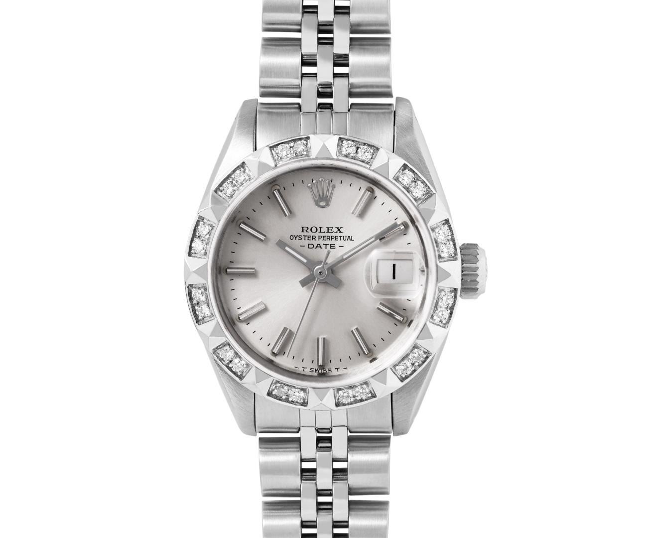 One Rolex Ladies Pre Owned Stainless Steel Date Wristwatch Polished Bright with Satin Finish, Serviced & Electronically Tested, Stainless Steel Case: 26mm, Stainless Steel Crown, Custom Bezel: New 18K White Gold Pyramid Diamond Bezel, Diamond Count: 24 Diamonds On Bezel. Custom Crystal: New Sapphire With Magnified Date Window. Custom Hands: New Luminescent Hands. Rolex Movement: Automatic Winding Movement 2035. Rolex Dial: Factory Silver With Index Hour Markers And Lumi Dots. Date Window: 3 O'Clock Position Date Display, Model: Date. Condition: G-6 Extra Fine. Rolex Bracelet: Stainless Steel Jubilee Band. Bright Polish & Satin Finish. 6.0 Inch Length, Adjustable. Standard Clasp, With Rolex Logo. This Watch Has Been Serviced Time Tested And Is In Excellent Condition. It Is Free Of All Scratches And Dents.