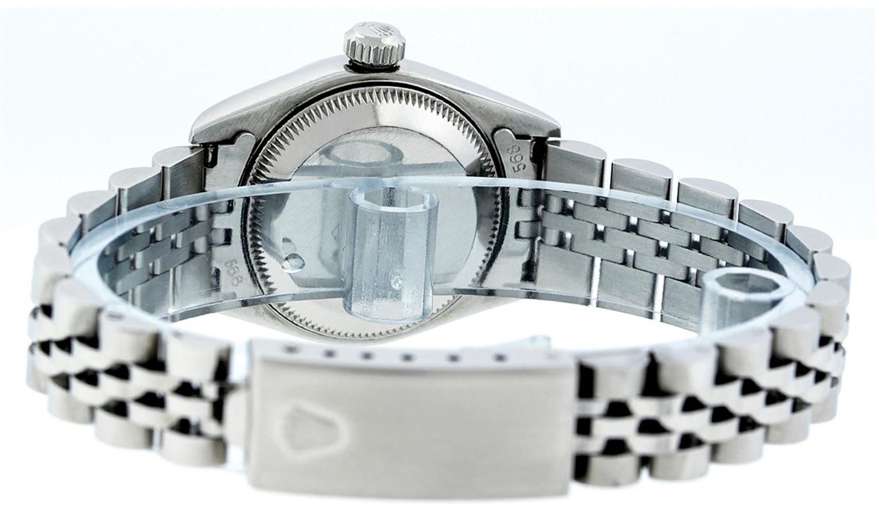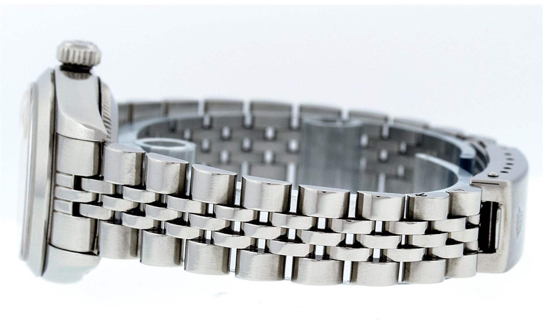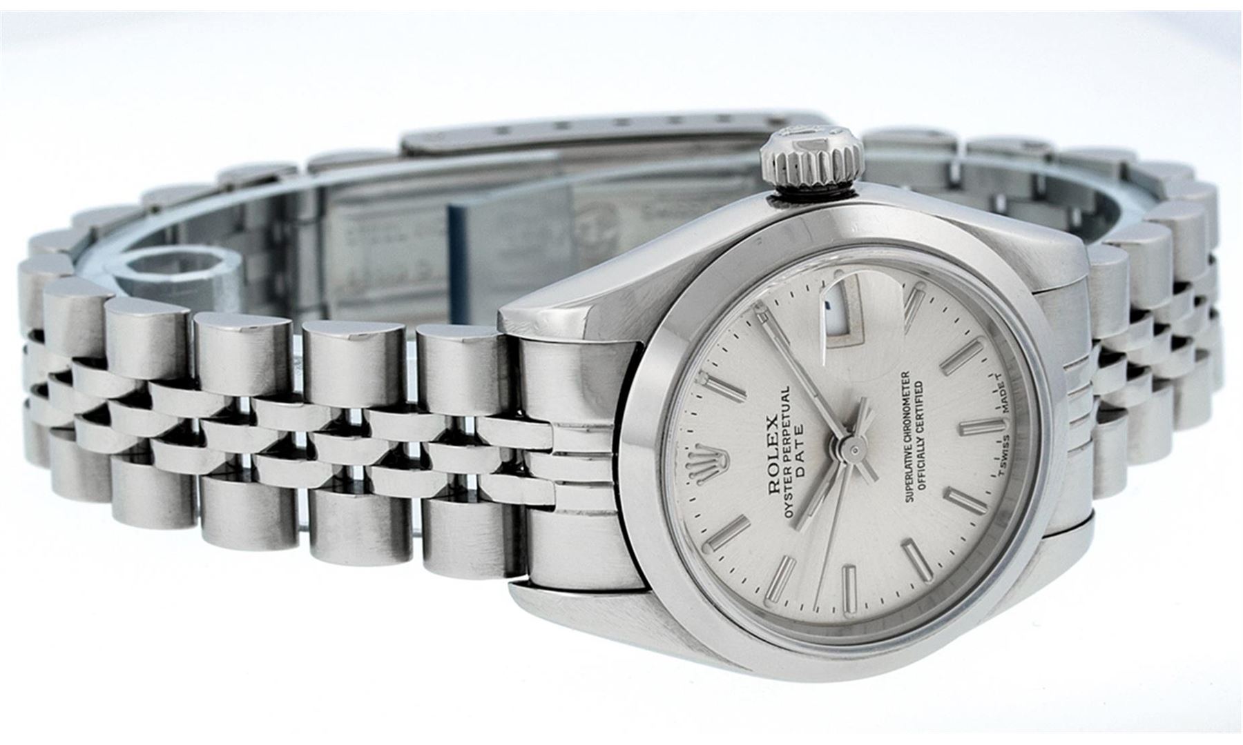 One Ladies Pre Owned Quickset Stainless Steel Rolex Date Polished Bright with Satin Finish, Serviced & Electronically Tested, Rolex Stainless Steel Case: 26mm, Rolex Stainless Steel Crown, Rolex Bezel: Stainless Steel Smooth Bezel. Crystal: Sapphire With Magnified Date Window. Hands: Luminescent Hands. Rolex Movement: Automatic Winding Movement 2230. Rolex Dial: Silver Index Dial With Luminescent Dots & Dash Track. Date Window: 3 O'Clock Position Date Display, Model: Quickset Datejust. Condition: G-6 Extra Fine. Rolex Bracelet: Stainless Steel Jubilee Band. Bright Polish & Satin Finish. 6.0 Inch Length, Adjustable. Standard Clasp, With Rolex Logo. This Watch Has Been Serviced Time Tested And Is In Excellent Condition It Is Free Of All Scratches And Dents.