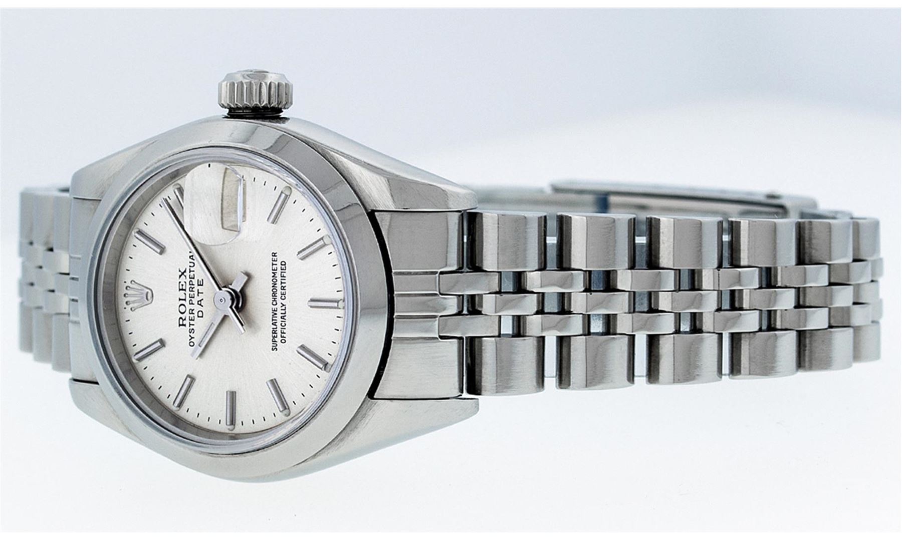 One Ladies Pre Owned Quickset Stainless Steel Rolex Date Polished Bright with Satin Finish, Serviced & Electronically Tested, Rolex Stainless Steel Case: 26mm, Rolex Stainless Steel Crown, Rolex Bezel: Stainless Steel Smooth Bezel. Crystal: Sapphire With Magnified Date Window. Hands: Luminescent Hands. Rolex Movement: Automatic Winding Movement 2230. Rolex Dial: Silver Index Dial With Luminescent Dots & Dash Track. Date Window: 3 O'Clock Position Date Display, Model: Quickset Datejust. Condition: G-6 Extra Fine. Rolex Bracelet: Stainless Steel Jubilee Band. Bright Polish & Satin Finish. 6.0 Inch Length, Adjustable. Standard Clasp, With Rolex Logo. This Watch Has Been Serviced Time Tested And Is In Excellent Condition It Is Free Of All Scratches And Dents.