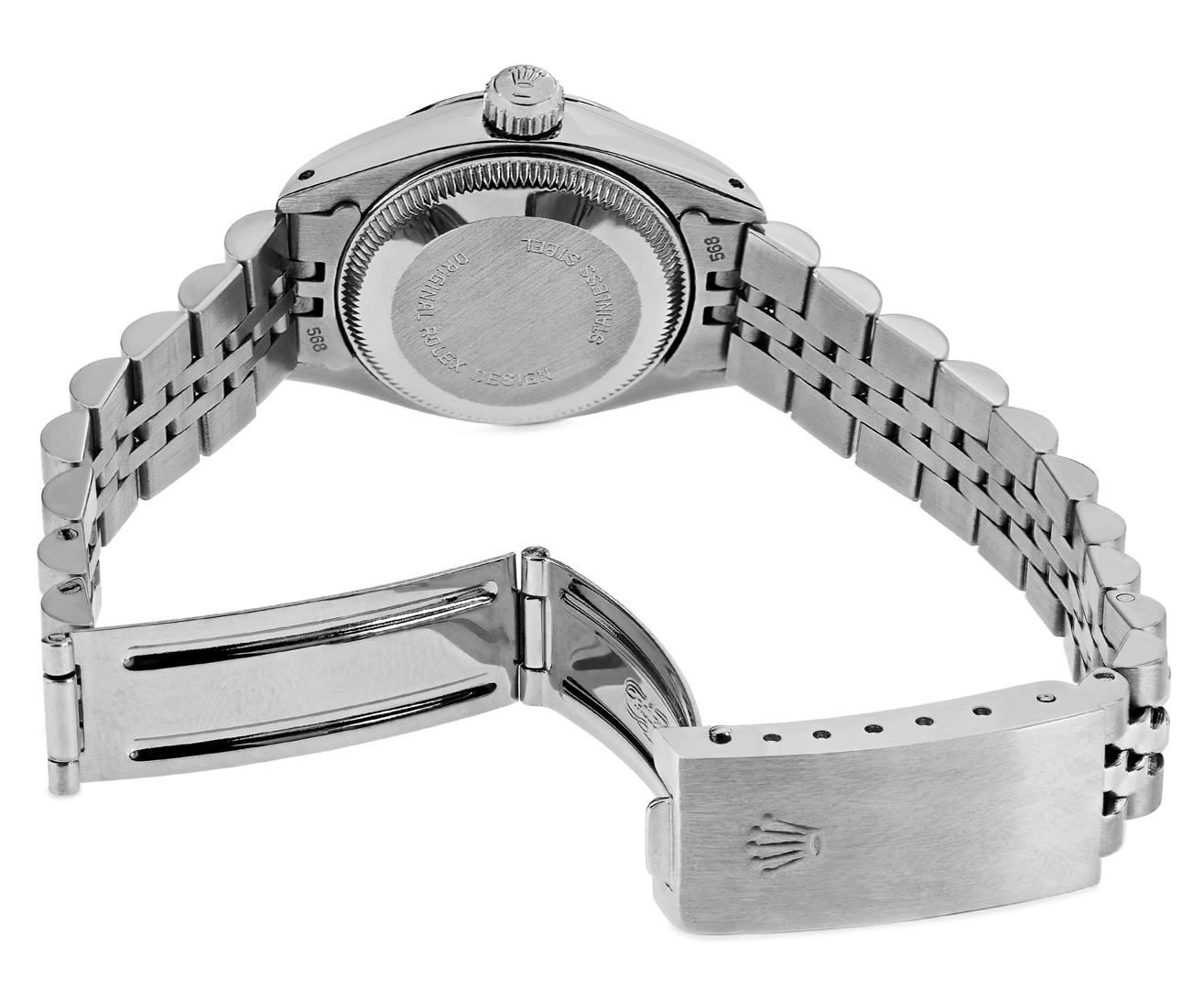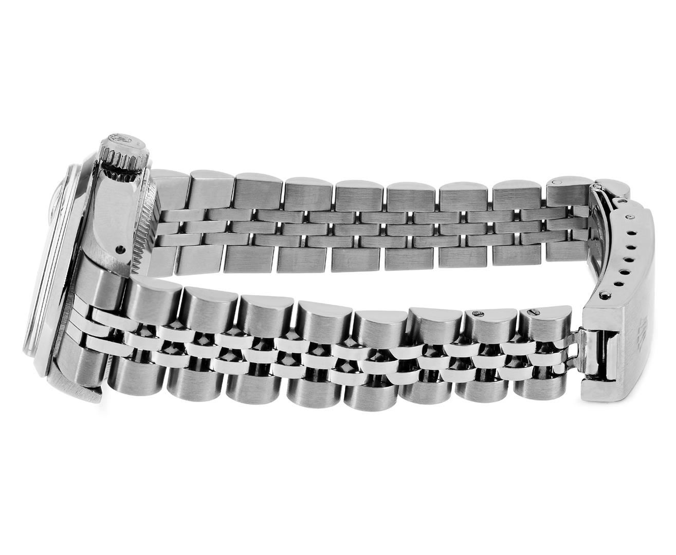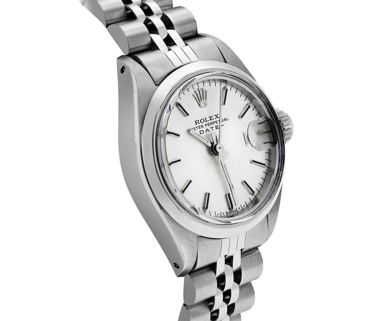 One Rolex Ladies Pre Owned Stainless Steel Date Wristwatch Polished Bright with Satin Finish, Serviced & Electronically Tested, Stainless Steel Case: 26mm, Stainless Steel Crown, Stainless Steel Smooth Bezel, Custom Crystal: New Acrylic With Magnifying Date Window. Custom Hands: New Luminescent Hands. Rolex Movement: Automatic Winding Movement 2030. Rolex Dial: Factory Silver With Index Hour Markers And Lumi Dots. Date Window: 3 O'Clock Position Date Display, Model: Date. Condition: G-6 Extra Fine. Rolex Bracelet: Stainless Steel Jubilee Band. Bright Polish & Satin Finish. 6.0 Inch Length, Adjustable. Standard Clasp, With Rolex Logo. This Watch Has Been Serviced Time Tested And Is In Excellent Condition. It Is Free Of All Scratches And Dents. This Watch Comes With A Rolex Box.