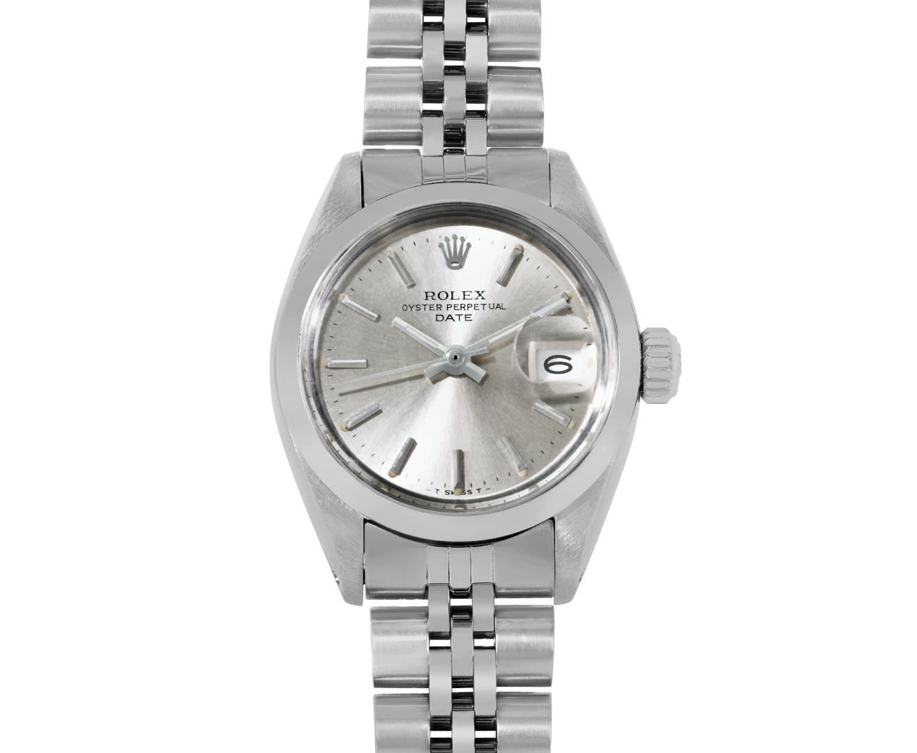 One Rolex Ladies Pre Owned Stainless Steel Date Wristwatch Polished Bright with Satin Finish, Serviced & Electronically Tested, Stainless Steel Case: 26mm, Stainless Steel Crown, Stainless Steel Smooth Bezel, Custom Crystal: New Acrylic With Magnifying Date Window. Custom Hands: New Luminescent Hands. Rolex Movement: Automatic Winding Movement 2035. Rolex Dial: Factory Silver With Index Hour Markers And Lumi Dots. Date Window: 3 O'Clock Position Date Display, Model: Date. Condition: G-6 Extra Fine. Rolex Bracelet: Stainless Steel Jubilee Band. Bright Polish & Satin Finish. 6.0 Inch Length, Adjustable. Standard Clasp, With Rolex Logo. This Watch Has Been Serviced Time Tested And Is In Excellent Condition. It Is Free Of All Scratches And Dents. This Watch Comes With A Rolex Box.