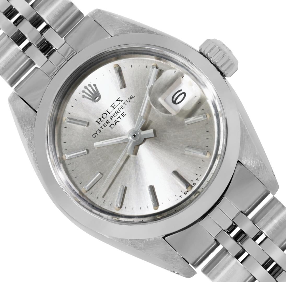 One Rolex Ladies Pre Owned Stainless Steel Date Wristwatch Polished Bright with Satin Finish, Serviced & Electronically Tested, Stainless Steel Case: 26mm, Stainless Steel Crown, Stainless Steel Smooth Bezel, Custom Crystal: New Acrylic With Magnifying Date Window. Custom Hands: New Luminescent Hands. Rolex Movement: Automatic Winding Movement 2035. Rolex Dial: Factory Silver With Index Hour Markers And Lumi Dots. Date Window: 3 O'Clock Position Date Display, Model: Date. Condition: G-6 Extra Fine. Rolex Bracelet: Stainless Steel Jubilee Band. Bright Polish & Satin Finish. 6.0 Inch Length, Adjustable. Standard Clasp, With Rolex Logo. This Watch Has Been Serviced Time Tested And Is In Excellent Condition. It Is Free Of All Scratches And Dents. This Watch Comes With A Rolex Box.