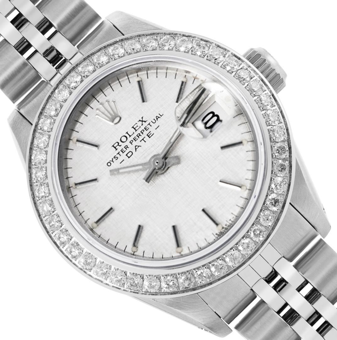 One Rolex Ladies Pre Owned Stainless Steel Date Wristwatch Polished Bright with Satin Finish, Serviced & Electronically Tested, Stainless Steel Case: 26mm, Stainless Steel Crown, Custom Bezel: New Stainless Steel Diamond Bezel, Diamond Count: 44 Diamonds, Total Weight .70 Carat, Clarity: SI-VS, Color: G to H. Custom Crystal: New Sapphire With Magnified Date Window. Custom Hands: New Luminescent Hands. Rolex Movement: Automatic Winding Movement 2030. Rolex Dial: Factory Silver Dial With Index Hour Markers And Lumi Dots. Date Window: 3 O'Clock Position Date Display, Model: Date. Condition: G-6 Extra Fine. Rolex Bracelet: Stainless Steel Jubilee Band. Bright Polish & Satin Finish. 6.0 Inch Length, Adjustable. Standard Clasp, With Rolex Logo. This Watch Has Been Serviced And Time Tested. It Is In Excellent Condition, Free Of All Scratches And Dents. This Watch Comes With A Rolex Box.