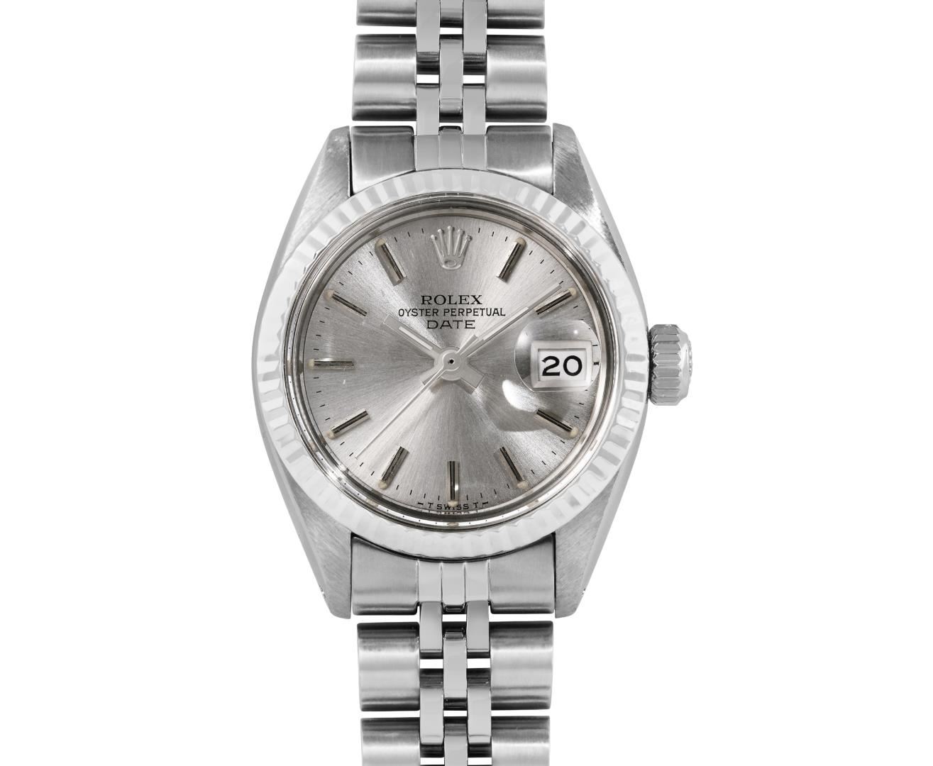 One Rolex Ladies Pre Owned Stainless Steel Date Wristwatch Polished Bright with Satin Finish, Serviced & Electronically Tested, Stainless Steel Case: 26mm, Stainless Steel Crown, 14K White Gold Fluted Bezel, Custom Crystal: New Acrylic With Magnifying Date Window. Custom Hands: New Luminescent Hands. Rolex Movement: Automatic Winding Movement 2035. Rolex Dial: Factory Silver With Index Hour Markers, Dash Tracks, And Lumi Dots. Date Window: 3 O'Clock Position Date Display, Model: Date. Condition: G-6 Extra Fine. Rolex Bracelet: Stainless Steel Jubilee Band. Bright Polish & Satin Finish. 6.0 Inch Length, Adjustable. Standard Clasp, With Rolex Logo. This Watch Has Been Serviced Time Tested And Is In Excellent Condition. It Is Free Of All Scratches And Dents.