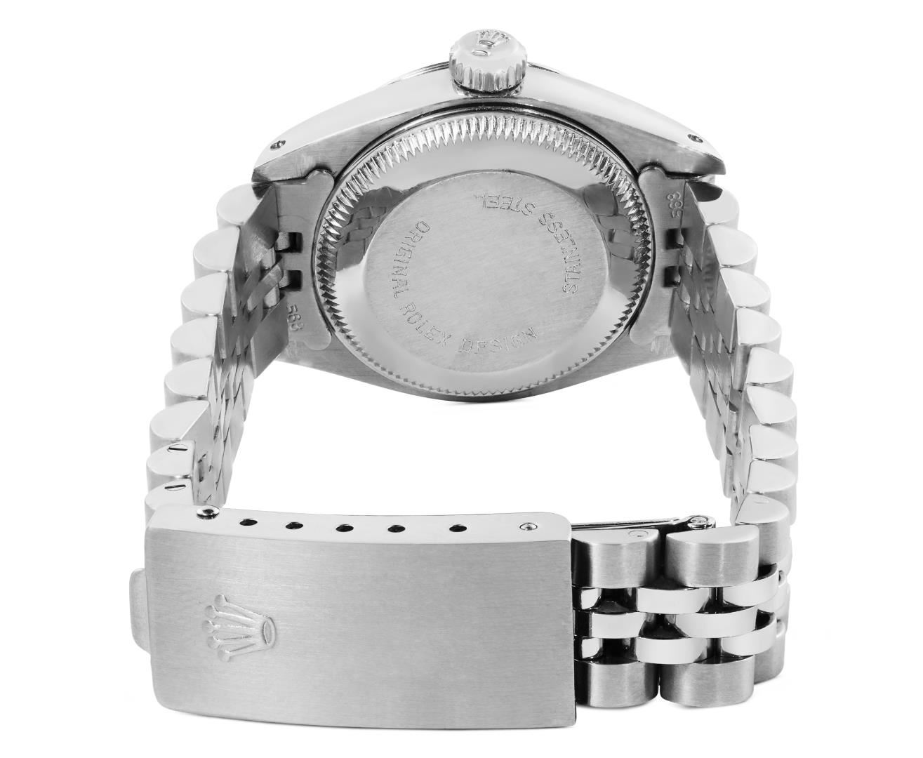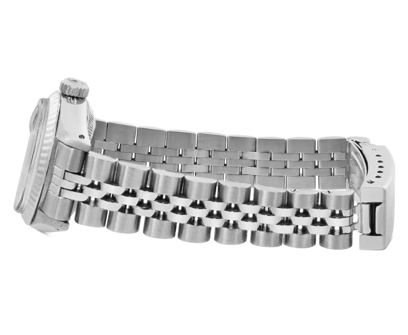 One Rolex Ladies Pre Owned Stainless Steel Date Wristwatch Polished Bright with Satin Finish, Serviced & Electronically Tested, Stainless Steel Case: 26mm, Stainless Steel Crown, 14K White Gold Fluted Bezel, Custom Crystal: New Acrylic With Magnifying Date Window. Custom Hands: New Luminescent Hands. Rolex Movement: Automatic Winding Movement 2035. Rolex Dial: Factory Silver With Index Hour Markers, Dash Tracks, And Lumi Dots. Date Window: 3 O'Clock Position Date Display, Model: Date. Condition: G-6 Extra Fine. Rolex Bracelet: Stainless Steel Jubilee Band. Bright Polish & Satin Finish. 6.0 Inch Length, Adjustable. Standard Clasp, With Rolex Logo. This Watch Has Been Serviced Time Tested And Is In Excellent Condition. It Is Free Of All Scratches And Dents.