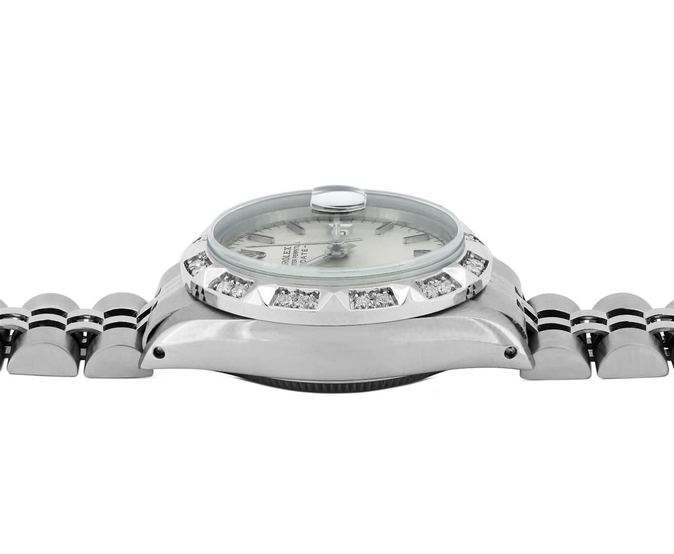 One Rolex Ladies Pre Owned Stainless Steel Date Wristwatch Polished Bright with Satin Finish, Serviced & Electronically Tested, Stainless Steel Case: 26mm, Stainless Steel Crown, Custom Bezel: New 18K White Gold Pyramid Diamond Bezel, Diamond Count: 24 Di