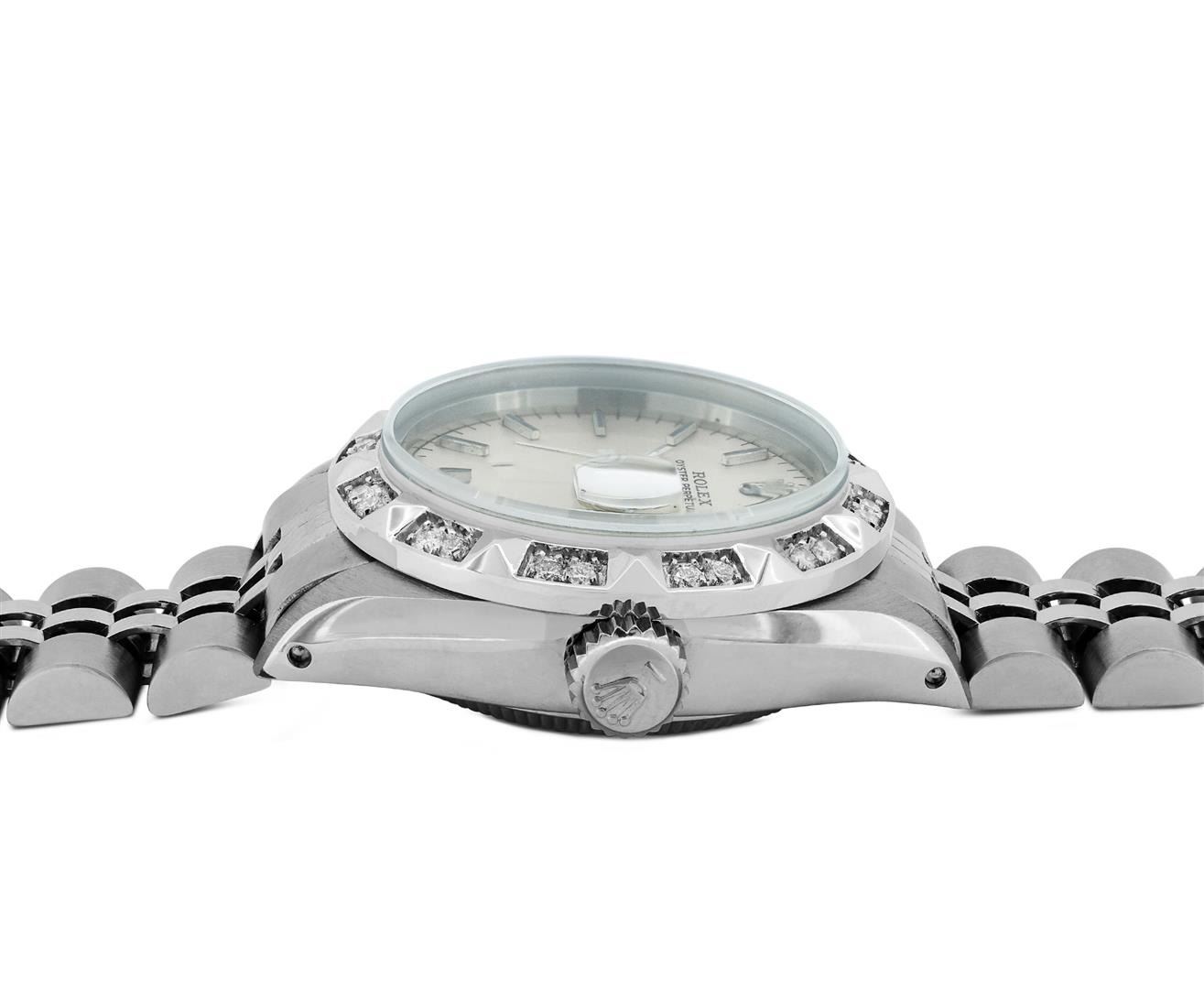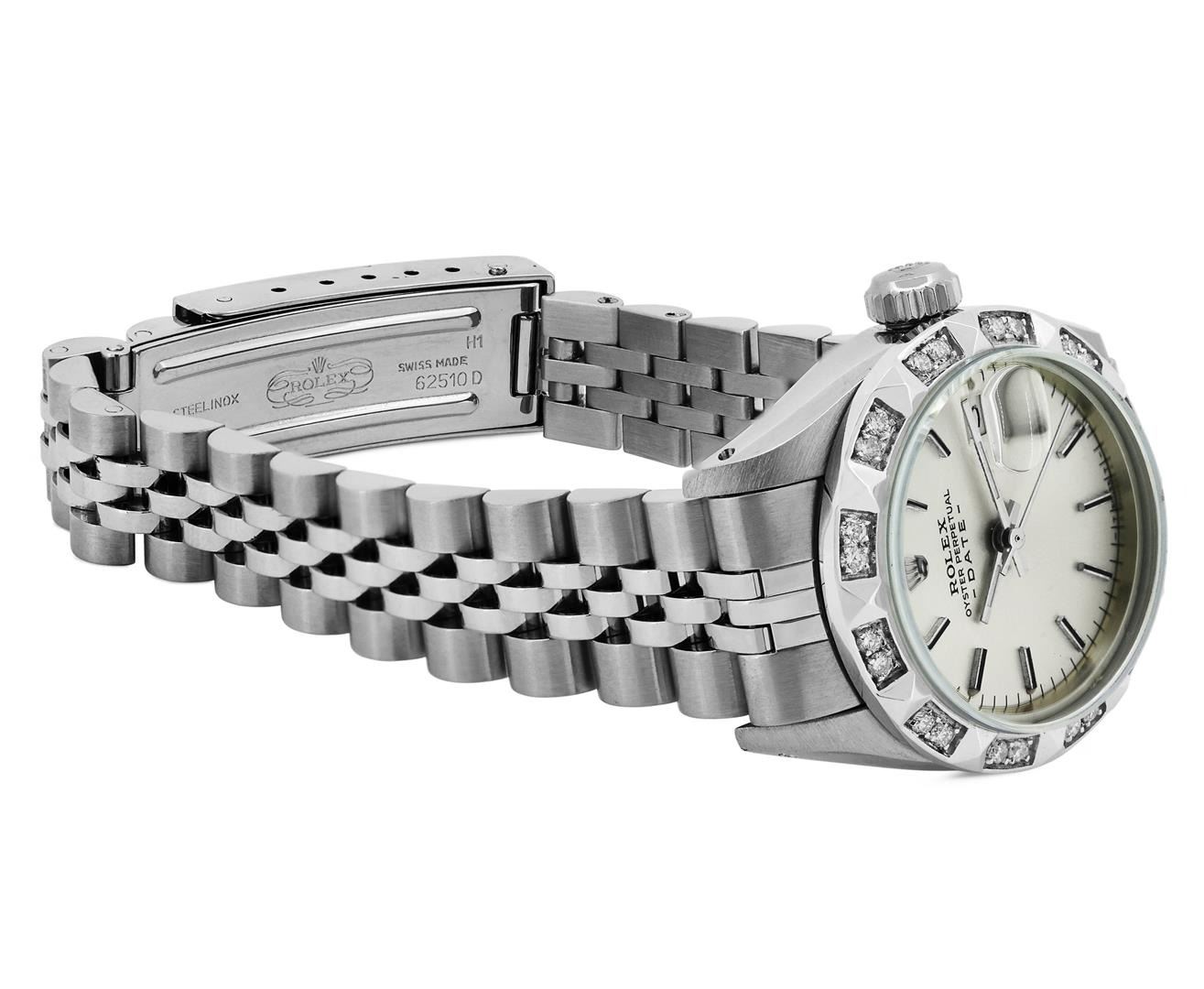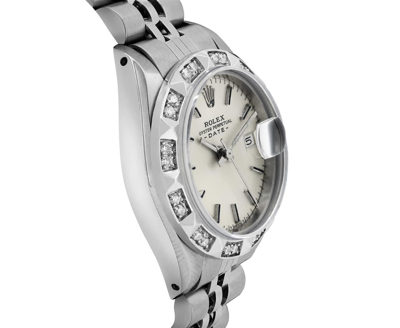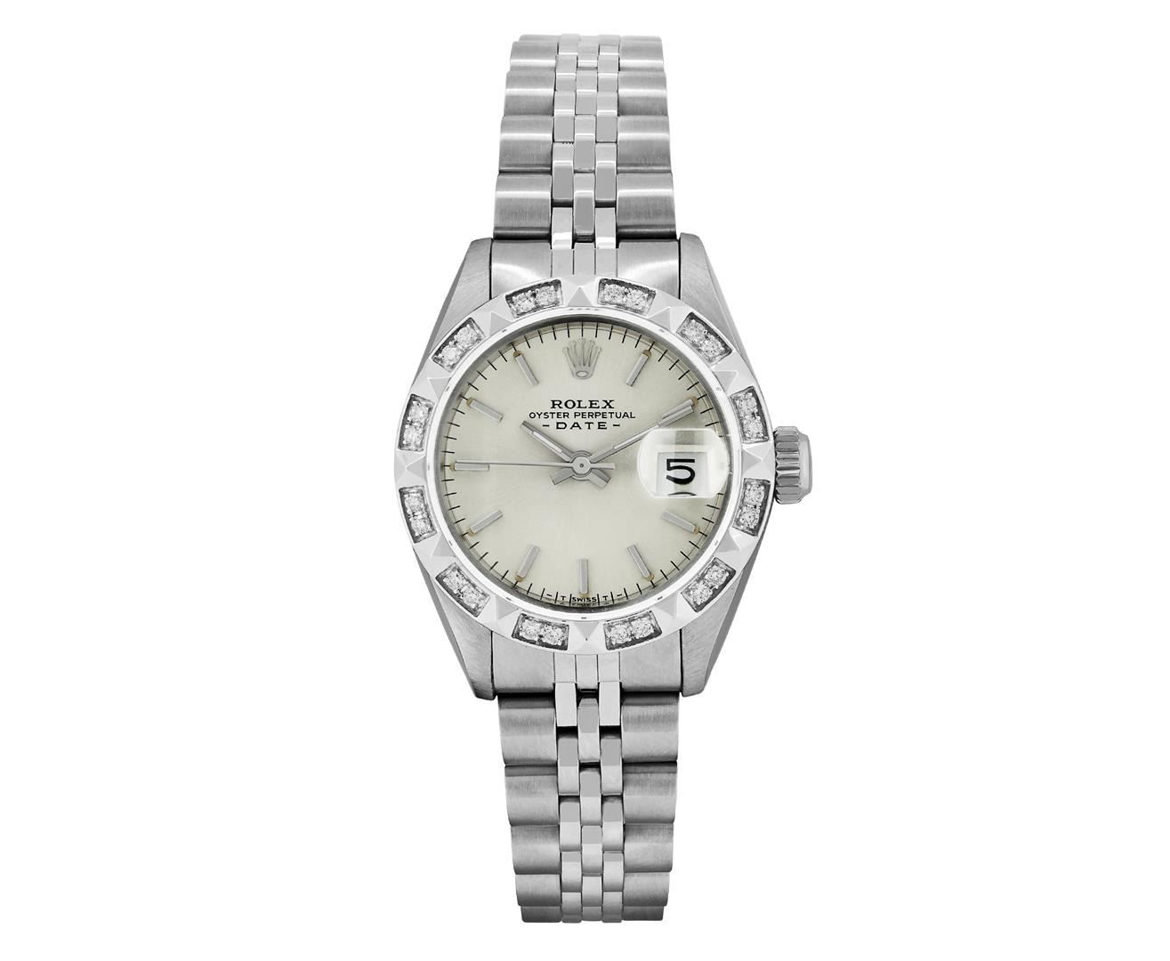 One Rolex Ladies Pre Owned Stainless Steel Date Wristwatch Polished Bright with Satin Finish, Serviced & Electronically Tested, Stainless Steel Case: 26mm, Stainless Steel Crown, Custom Bezel: New 18K White Gold Pyramid Diamond Bezel, Diamond Count: 24 Diamonds On Bezel. Total Weight .50 Carat, Clarity: SI-VS, Color: G to H. Custom Crystal: New Sapphire With Magnified Date Window. Custom Hands: New Luminescent Hands. Rolex Movement: Automatic Winding Movement 2030. Rolex Dial: Factory Silver With Index Hour Markers And Lumi Dots. Date Window: 3 O'Clock Position Date Display, Model: Date. Condition: G-6 Extra Fine. Rolex Bracelet: Stainless Steel Jubilee Band. Bright Polish & Satin Finish. 6.0 Inch Length, Adjustable. Standard Clasp, With Rolex Logo. This Watch Has Been Serviced Time Tested And Is In Excellent Condition It Is Free Of All Scratches And Dents. This Watch Comes With A Rolex Box.