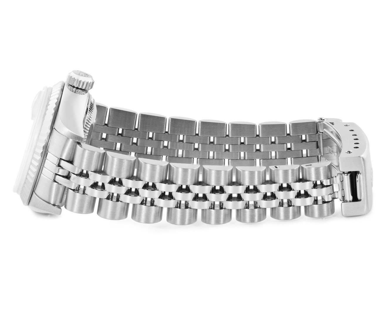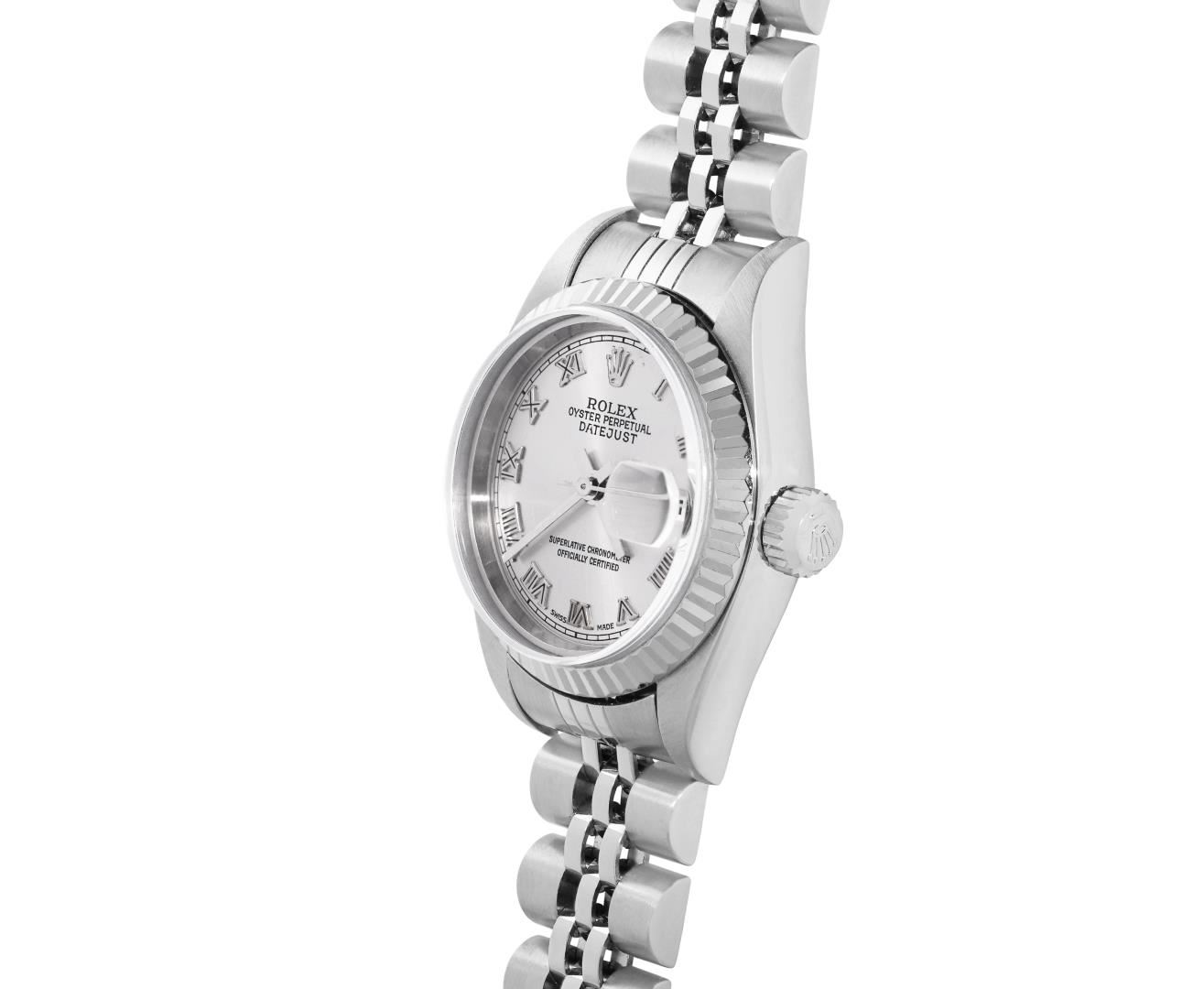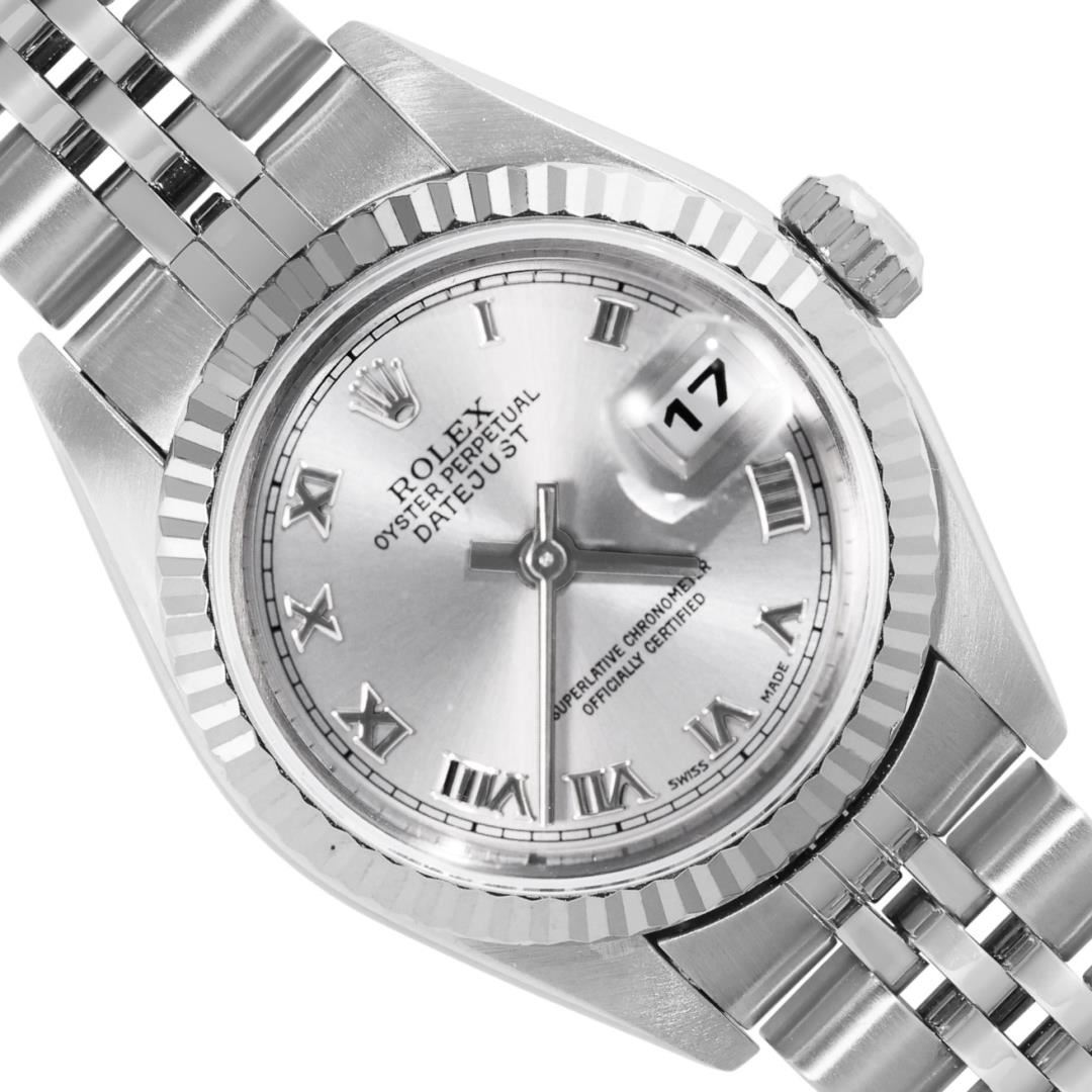 One Rolex Ladies Pre Owned Quickset Stainless Steel Datejust Wristwatch Polished Bright with Satin Finish, Serviced And Electronically Tested, Stainless Steel Case: 26mm, Stainless Steel Crown, Rolex Bezel: 18K White Gold Fluted Bezel. Crystal: Sapphire With Magnified Date Window. Hands: Solid Hands. Rolex Movement: 2235 Automatic Winding Movement. Rolex Dial: Factory Silver With Roman Hour Markers, and Square Track. Date Window: 3 O'Clock Position Date Display, Model: Quickset Datejust. Condition: G-6 Extra Fine. Rolex Bracelet: Stainless Steel Jubilee Band. Bright Polish And Satin Finish. 6.0 Inch Length, Adjustable. Standard Clasp, With Rolex Logo. This Watch Has Been Serviced Time Tested And Is In Excellent Condition. It Is Free Of All Scratches And Dents.