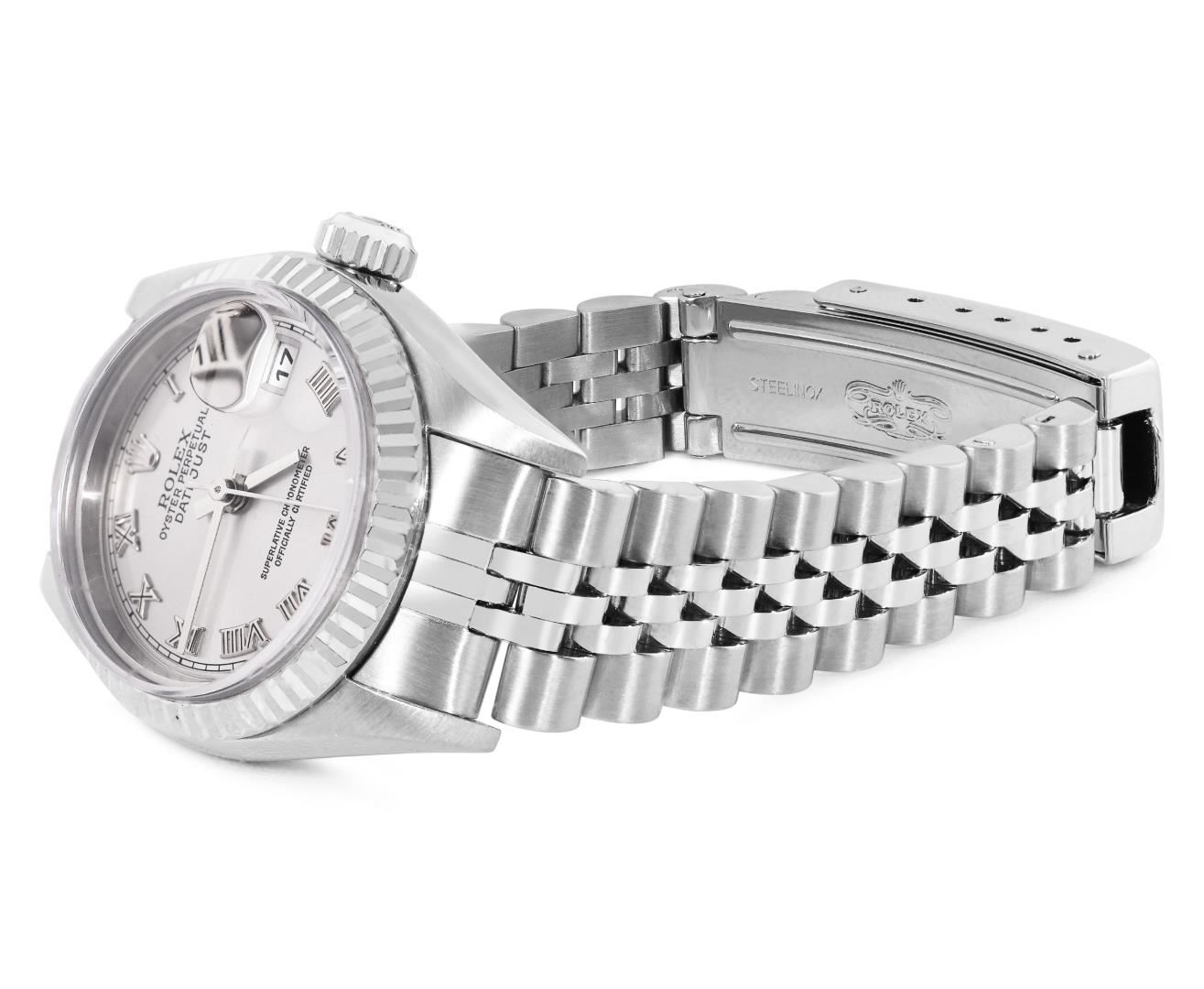 One Rolex Ladies Pre Owned Quickset Stainless Steel Datejust Wristwatch Polished Bright with Satin Finish, Serviced And Electronically Tested, Stainless Steel Case: 26mm, Stainless Steel Crown, Rolex Bezel: 18K White Gold Fluted Bezel. Crystal: Sapphire With Magnified Date Window. Hands: Solid Hands. Rolex Movement: 2235 Automatic Winding Movement. Rolex Dial: Factory Silver With Roman Hour Markers, and Square Track. Date Window: 3 O'Clock Position Date Display, Model: Quickset Datejust. Condition: G-6 Extra Fine. Rolex Bracelet: Stainless Steel Jubilee Band. Bright Polish And Satin Finish. 6.0 Inch Length, Adjustable. Standard Clasp, With Rolex Logo. This Watch Has Been Serviced Time Tested And Is In Excellent Condition. It Is Free Of All Scratches And Dents.