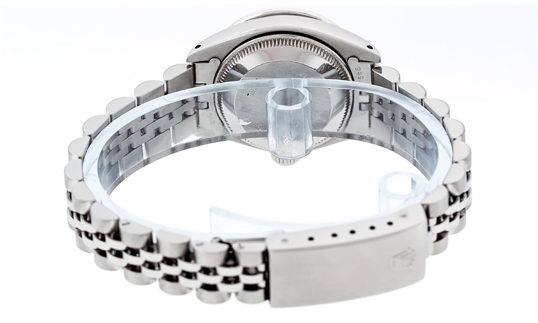One Pre Owned Ladies Stainless Steel Rolex Datejust Polished Bright with Satin Finish, Serviced & Electronically Tested, Rolex Stainless Steel Case: 26mm, Rolex Stainless Steel Crown, Rolex Bezel: 14K White Gold Bezel. Custom Crystal: New With Cyclops Len