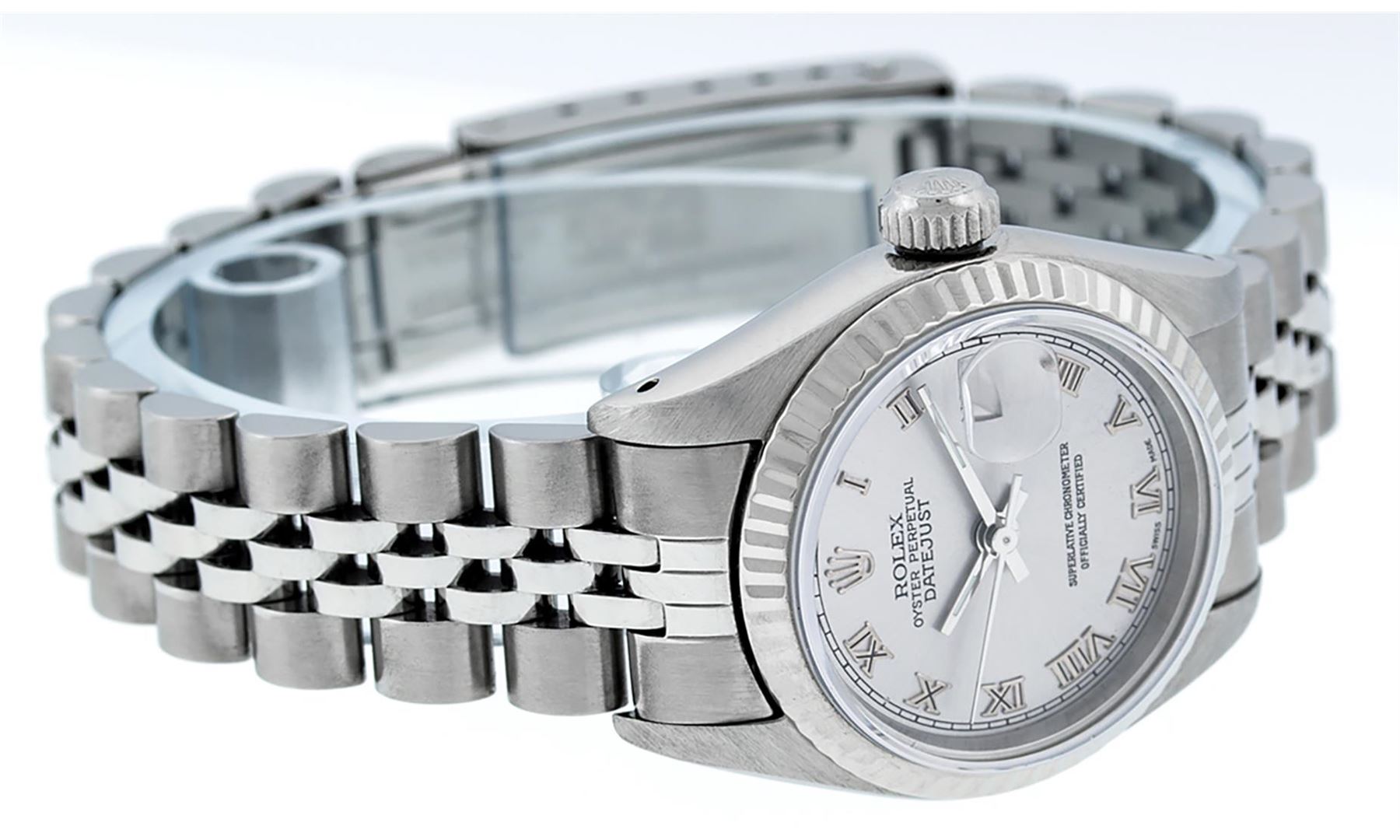 One Pre Owned Ladies Stainless Steel Rolex Polished Bright with Satin Finish, Serviced & Electronically Tested, Rolex Stainless Steel Case: 26mm, Rolex Stainless Steel Crown, Rolex Bezel: 14K White Gold Bezel. Custom Crystal: Acrylic With Magnified Date Window. Custom Hands: New Luminescent Hands. Rolex Movement: Automatic Winding Movement. Custom Dial: Refinished To Silver Roman Dial. Date Window: 3 O'Clock Position Date Display, Model: Datejust. Condition: G-6 Extra Fine. Rolex Bracelet: Stainless Steel Jubilee Band. Bright Polish & Satin Finish. 6.0 Inch Length, Adjustable. Standard Clasp, With Rolex Logo. This Watch Has Been Serviced Time Tested And Is In Excellent Condition It Is Free Of All Scratches And Dents.