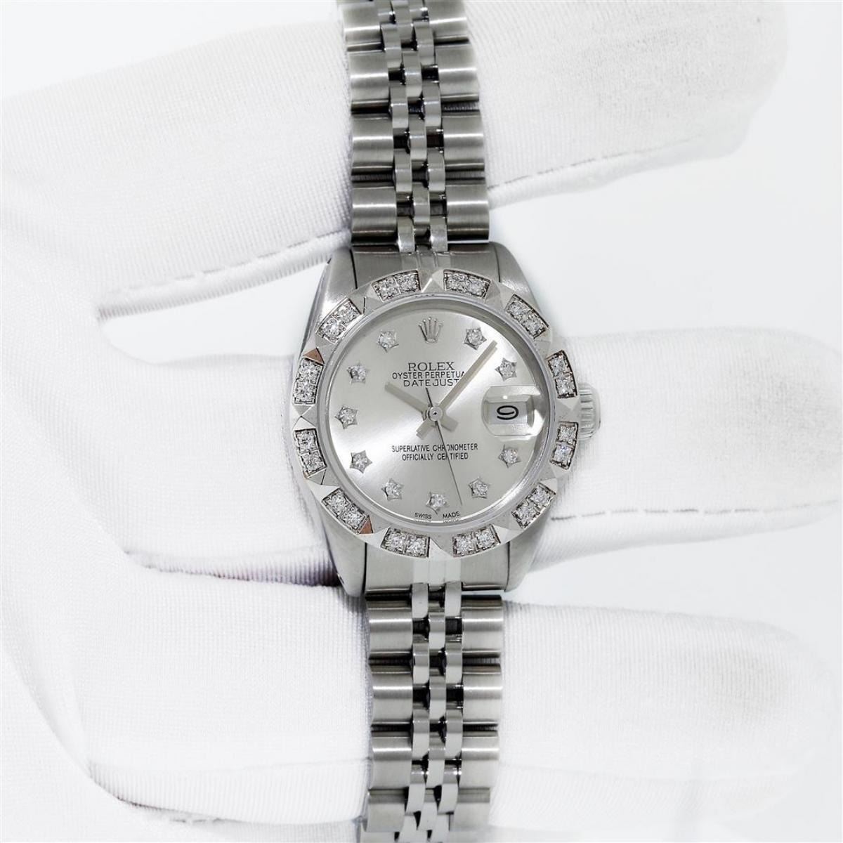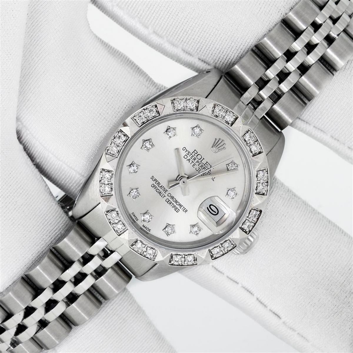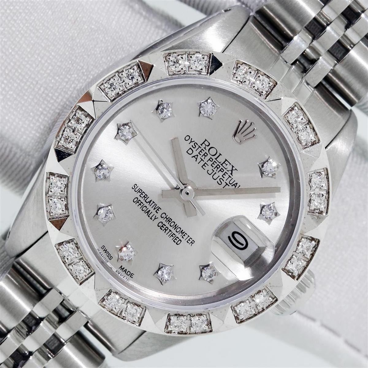 One Ladies Stainless Steel Rolex Datejust Polished Bright with Satin Finish, Serviced & Electronically Tested, Stainless Steel Case: 26mm, Stainless Steel Crown, Custom Bezel: New 18K White Gold Pyramid Diamond Bezel, Diamond Count: 24 Diamonds In Dial. Total Weight .50 Carat, Clarity: SI-VS, Color: G to H. Custom Crystal: New Scratch Resistant Synthetic Sapphire Cyclops Lens. Custom Hands: New Luminescent Hands. Movement: Automatic Winding Movement. Custom Dial: Silver Diamond Dial With Star Setting. Diamond Count: 10 Diamonds In Dial. Clarity: SI-VS, Color: G to H. Date Window: 3 O'Clock Position Date Display, Model: Datejust. Condition: G-6 Extra Fine. Bracelet: Stainless Steel Jubilee Band With Rolex Crown On Buckle. Bright Polish & Satin Finish. Band Length: 6.0 Inch Length, Adjustable. Standard Clasp, With Rolex Logo. This Watch Has Been Serviced Time Tested And Is In Excellent Condition It Is Free Of All Scratches And Dents.