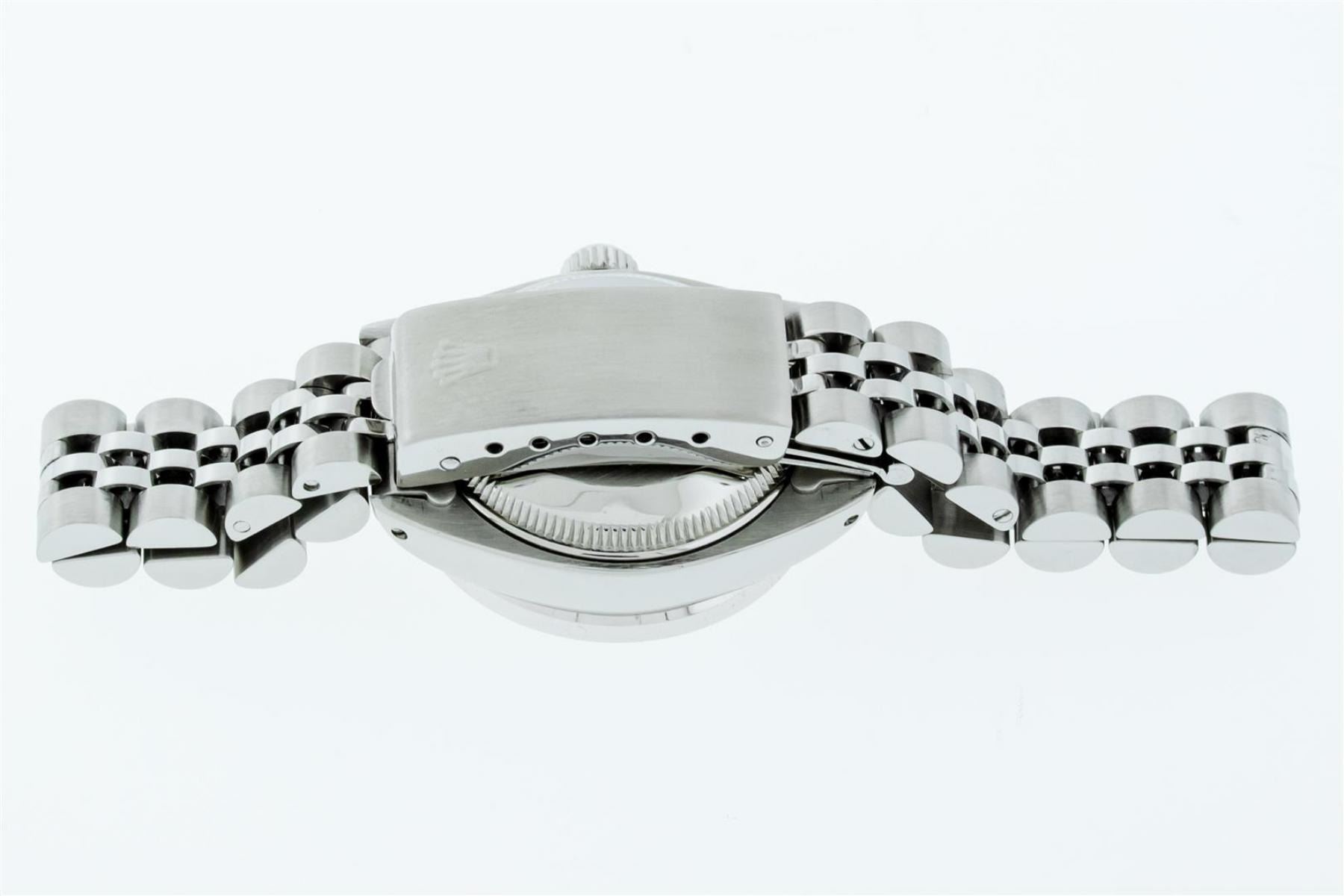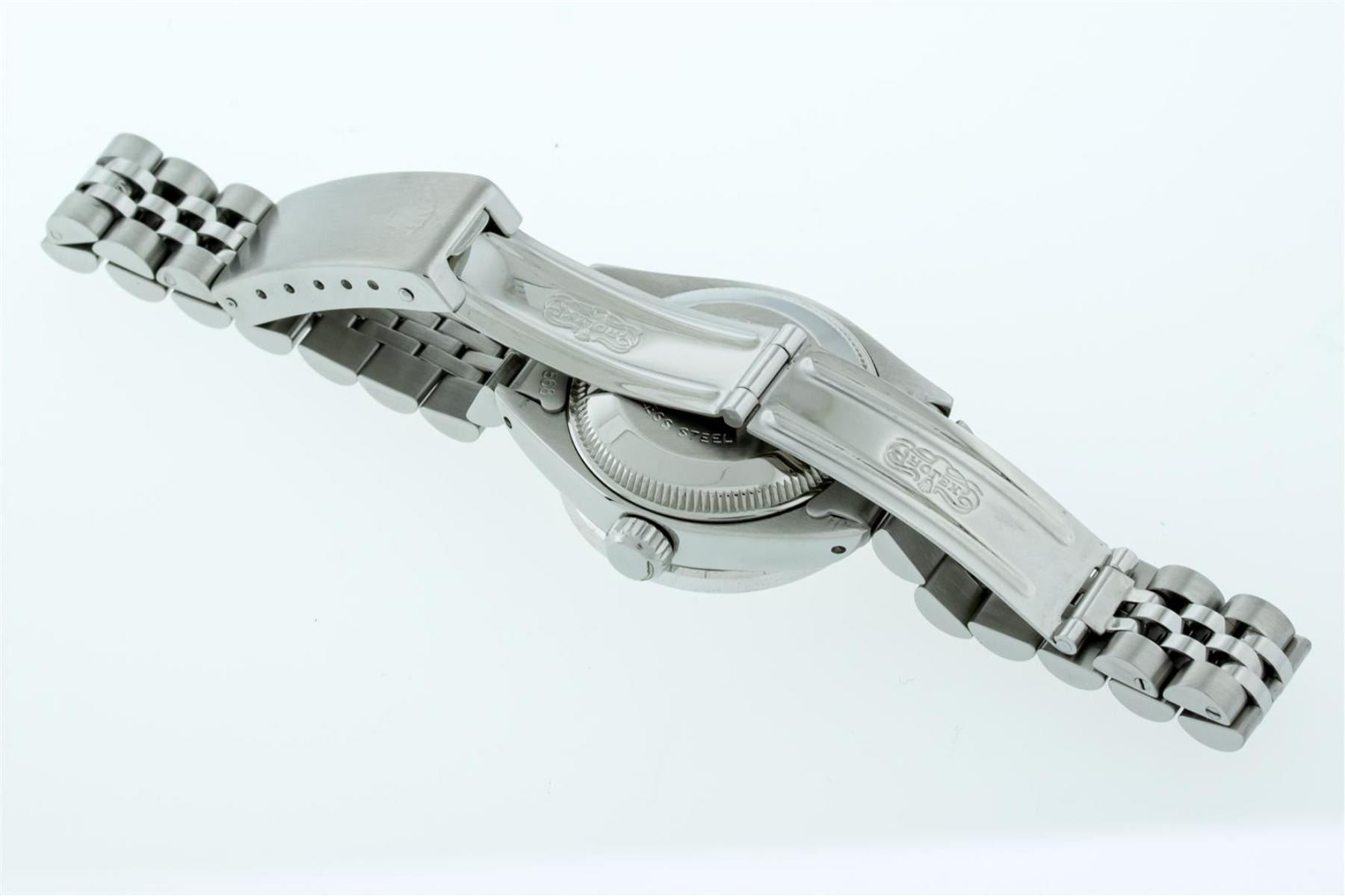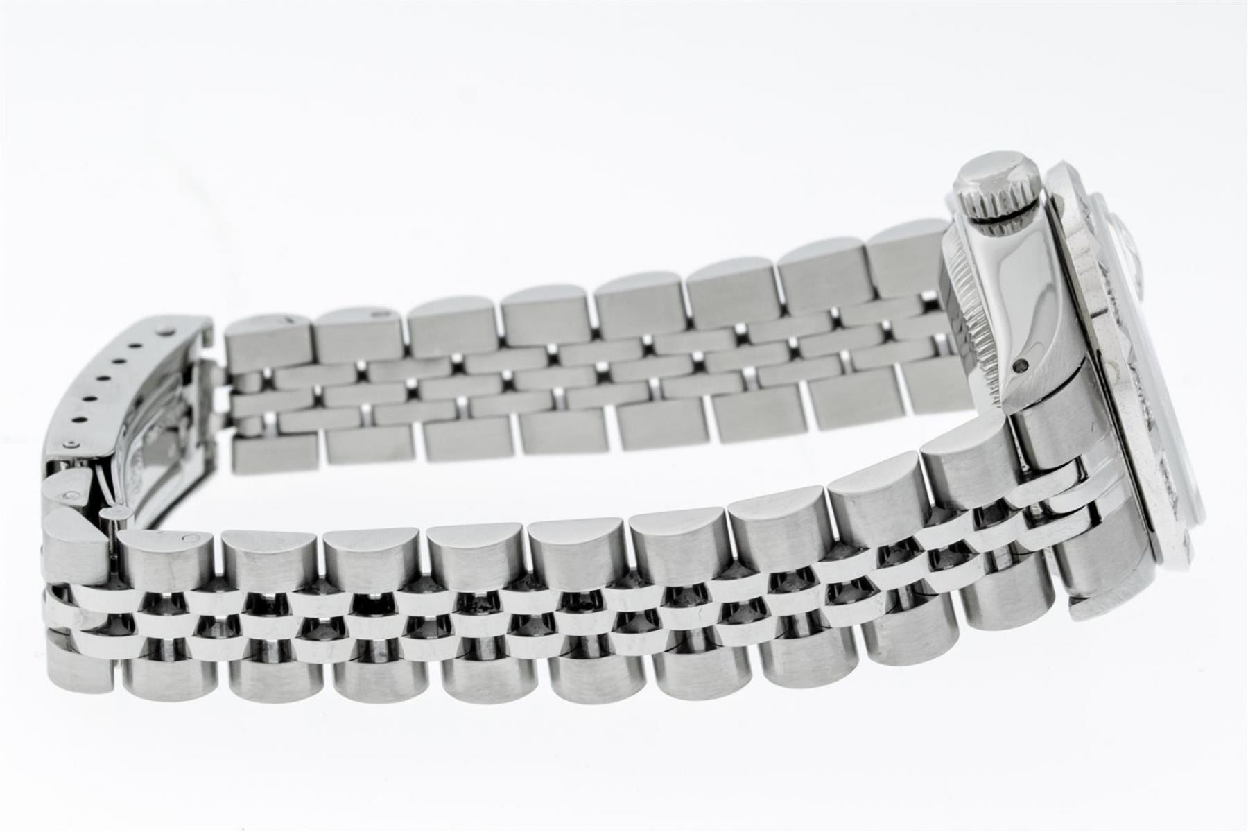 One Ladies Stainless Steel Rolex Datejust Polished Bright with Satin Finish, Serviced & Electronically Tested, Stainless Steel Case: 26mm, Stainless Steel Crown, Custom Bezel: New 18K White Gold Pyramid Diamond Bezel, Diamond Count: 24 Diamonds In Dial. Total Weight .50 Carat, Clarity: SI-VS, Color: G to H. Custom Crystal: New Scratch Resistant Synthetic Sapphire Cyclops Lens. Custom Hands: New Luminescent Hands. Movement: Automatic Winding Movement. Custom Dial: Silver Diamond Dial With Star Setting. Diamond Count: 10 Diamonds In Dial. Clarity: SI-VS, Color: G to H. Date Window: 3 O'Clock Position Date Display, Model: Datejust. Condition: G-6 Extra Fine. Bracelet: Stainless Steel Jubilee Band With Rolex Crown On Buckle. Bright Polish & Satin Finish. Band Length: 6.0 Inch Length, Adjustable. Standard Clasp, With Rolex Logo. This Watch Has Been Serviced Time Tested And Is In Excellent Condition It Is Free Of All Scratches And Dents.