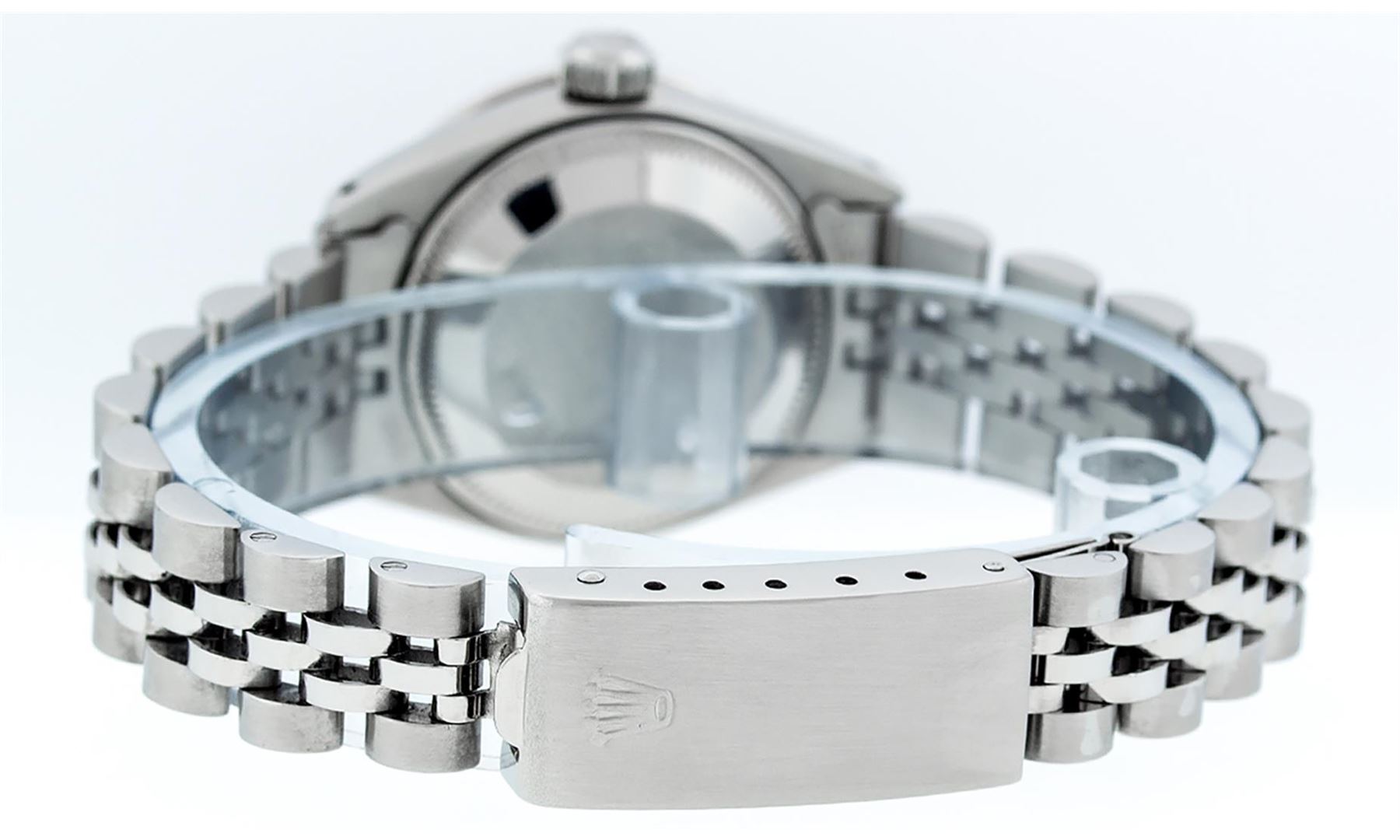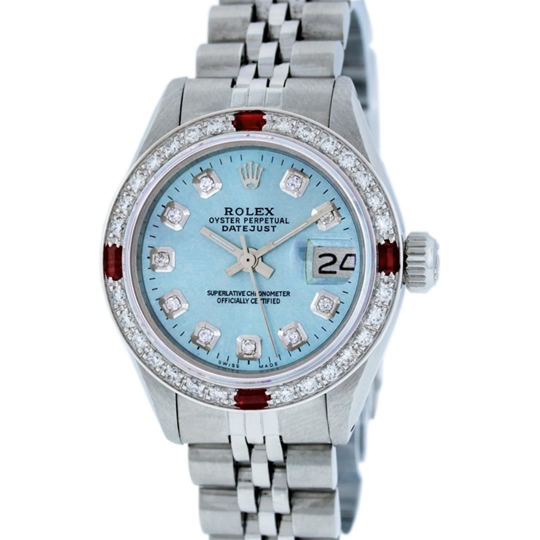 One Ladies Stainless Steel Rolex Datejust Polished Bright with Satin Finish, Serviced & Electronically Tested, Stainless Steel Case: 26mm, Stainless Steel Crown, Custom Bezel: New 18K White Gold Ruby Beadset Diamond Bezel, Diamond + Gem Count: 28 Diamonds + 4 Rubies. Total Weight .70 Carat, Clarity: SI-VS, Color: G to H. Custom Crystal: New Scratch Resistant Synthetic Sapphire Cyclops Lens. Custom Hands: New Luminescent Hands. Movement: Automatic Winding Movement. Custom Dial: Refinished Sky Blue With Diamond Hour Markers & Dash Tracks, 10 Diamonds in Dial, G To H In Color, Clarity: SI-VS. Date Window: 3 O'Clock Position Date Display, Model: Datejust. Condition: G-6 Extra Fine. Bracelet: Stainless Steel Jubilee Band. Bright Polish & Satin Finish. 6.0 Inch Length, Adjustable. Standard Clasp, With Rolex Logo. This Watch Has Been Serviced Time Tested And Is In Excellent Condition It Is Free Of All Scratches And Dents.