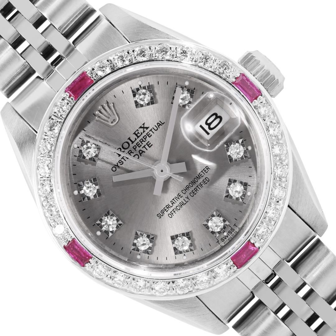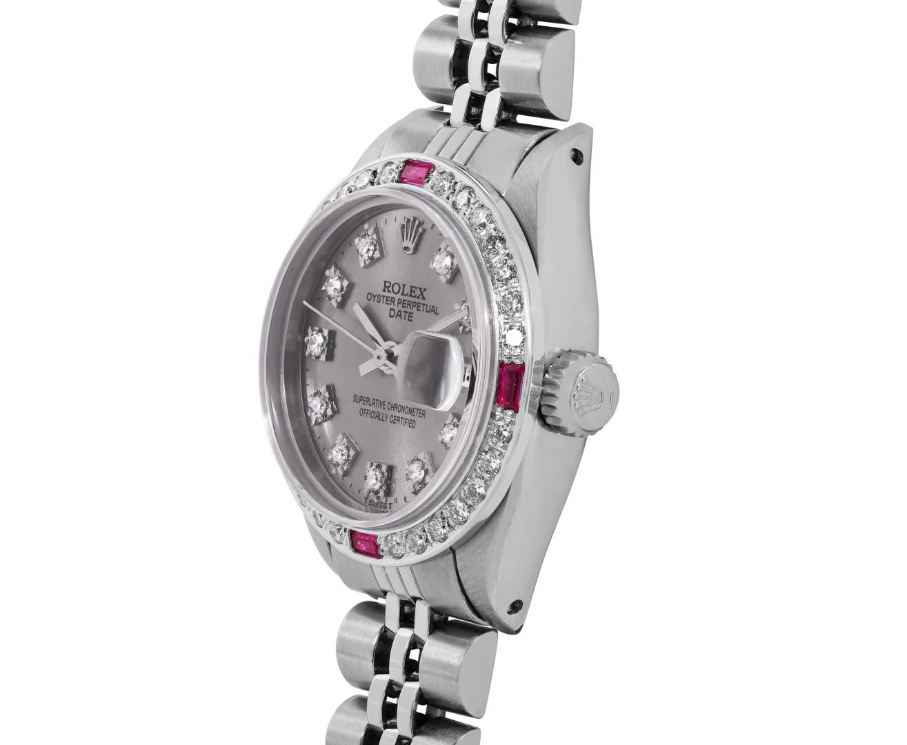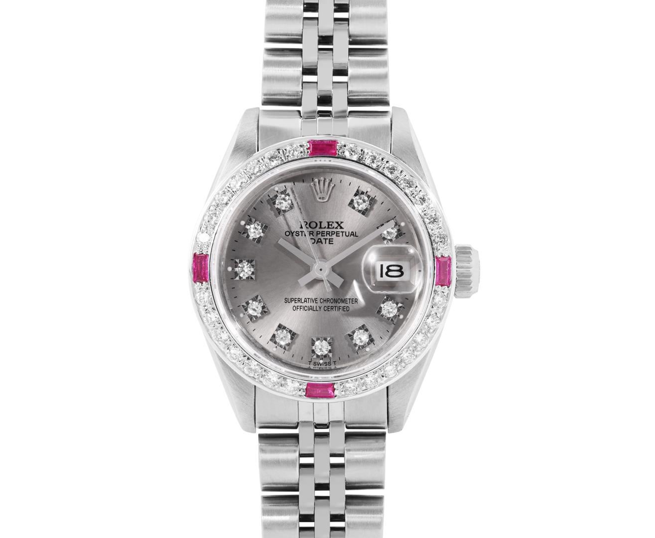 One Rolex Ladies Pre Owned Stainless Steel Date Wristwatch Polished Bright with Satin Finish, Serviced and Electronically Tested, Stainless Steel Case: 26mm, Stainless Steel Crown, Custom Bezel: New 18K White Gold Ruby Beadset Diamond Bezel, Diamond + Gem Count: 36 Diamonds + 4 Rubies. Custom Crystal: New Sapphire With Magnified Date Window. Rolex Movement: Automatic Winding Movement 2035. Custom Dial: Custom Slate Gray Dial With Added Diamond Hour Markers, Dash Tracks, And Lumi Dots. Date Window: 3 O'Clock Position Date Display, Model: Date. Condition: G-6 Extra Fine. Rolex Bracelet: Stainless Steel Jubilee Band. Bright Polish and Satin Finish. 6.0 Inch Length, Adjustable. Standard Clasp, With Rolex Logo. This Watch Has Been Serviced Time Tested And Is In Excellent Condition. It Is Free Of All Scratches And Dents.