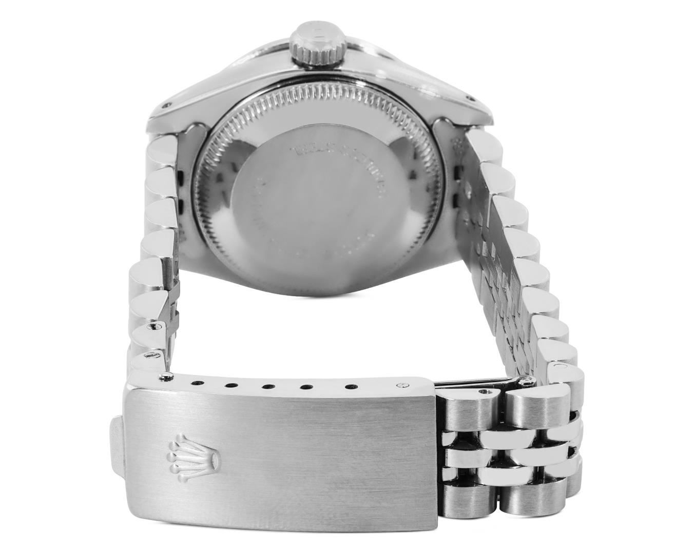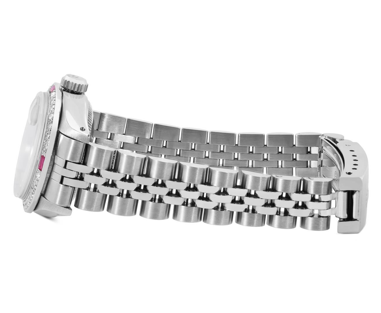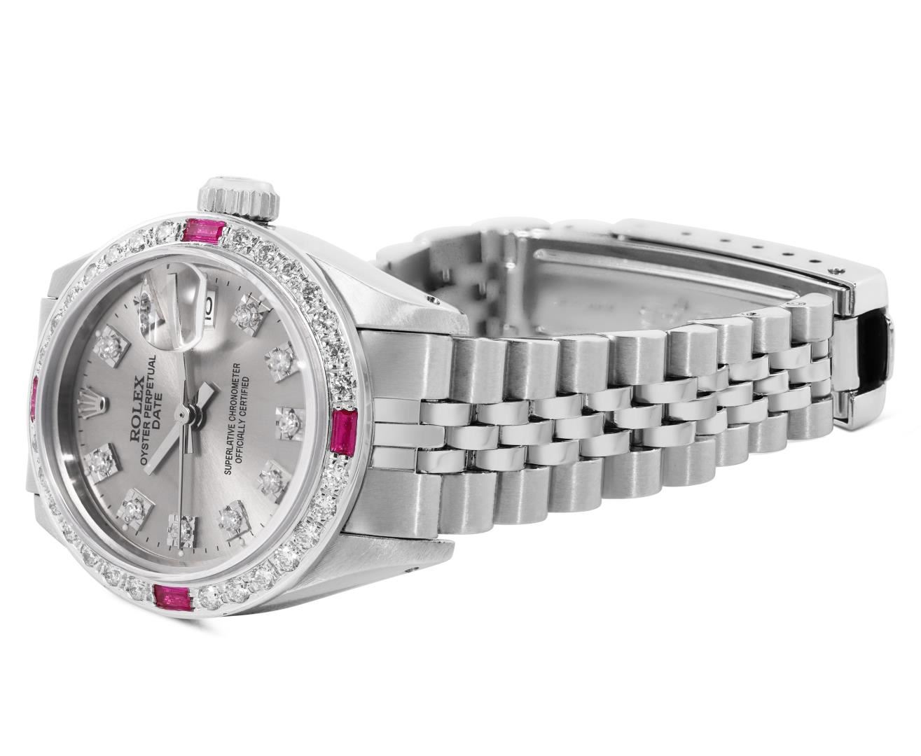One Rolex Ladies Pre Owned Stainless Steel Date Wristwatch Polished Bright with Satin Finish, Serviced and Electronically Tested, Stainless Steel Case: 26mm, Stainless Steel Crown, Custom Bezel: New 18K White Gold Ruby Beadset Diamond Bezel, Diamond + Gem Count: 36 Diamonds + 4 Rubies. Custom Crystal: New Sapphire With Magnified Date Window. Rolex Movement: Automatic Winding Movement 2035. Custom Dial: Custom Slate Gray Dial With Added Diamond Hour Markers, Dash Tracks, And Lumi Dots. Date Window: 3 O'Clock Position Date Display, Model: Date. Condition: G-6 Extra Fine. Rolex Bracelet: Stainless Steel Jubilee Band. Bright Polish and Satin Finish. 6.0 Inch Length, Adjustable. Standard Clasp, With Rolex Logo. This Watch Has Been Serviced Time Tested And Is In Excellent Condition. It Is Free Of All Scratches And Dents.