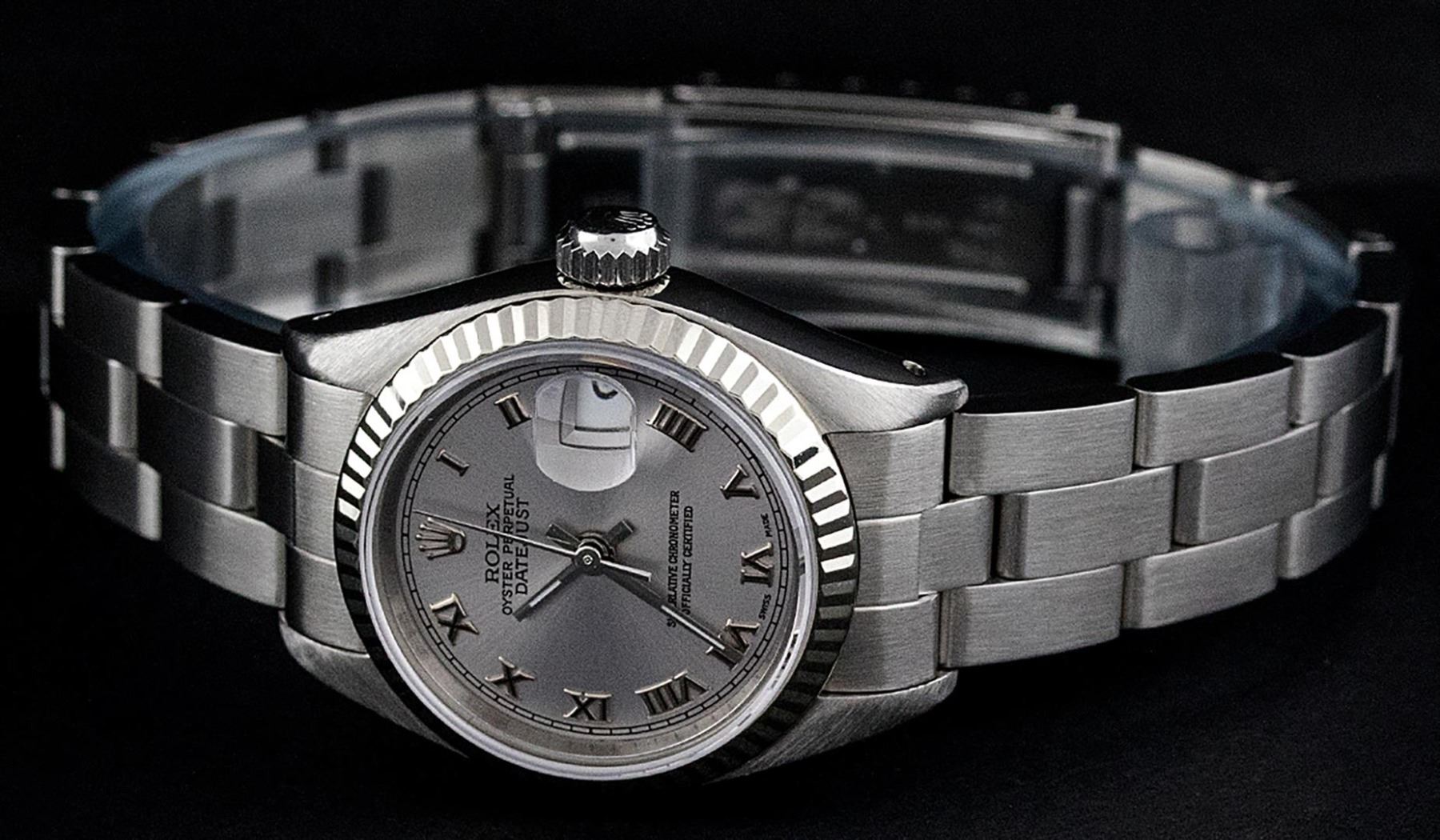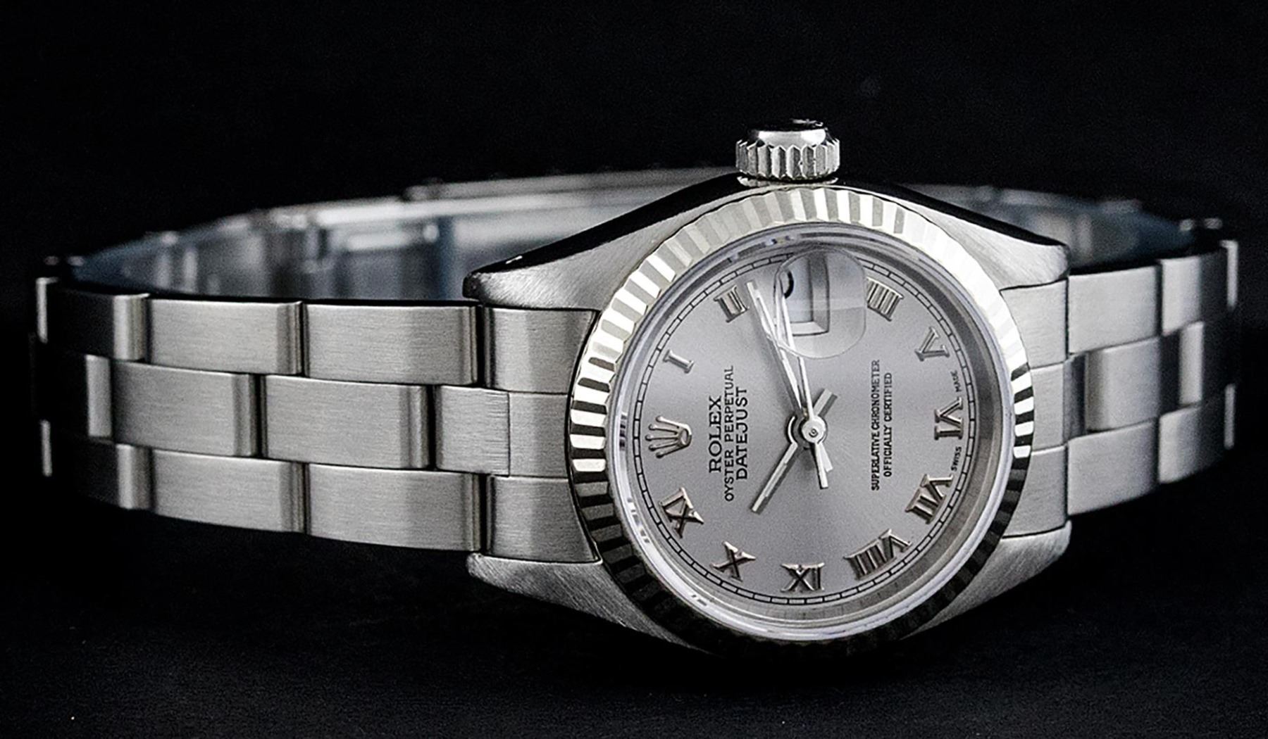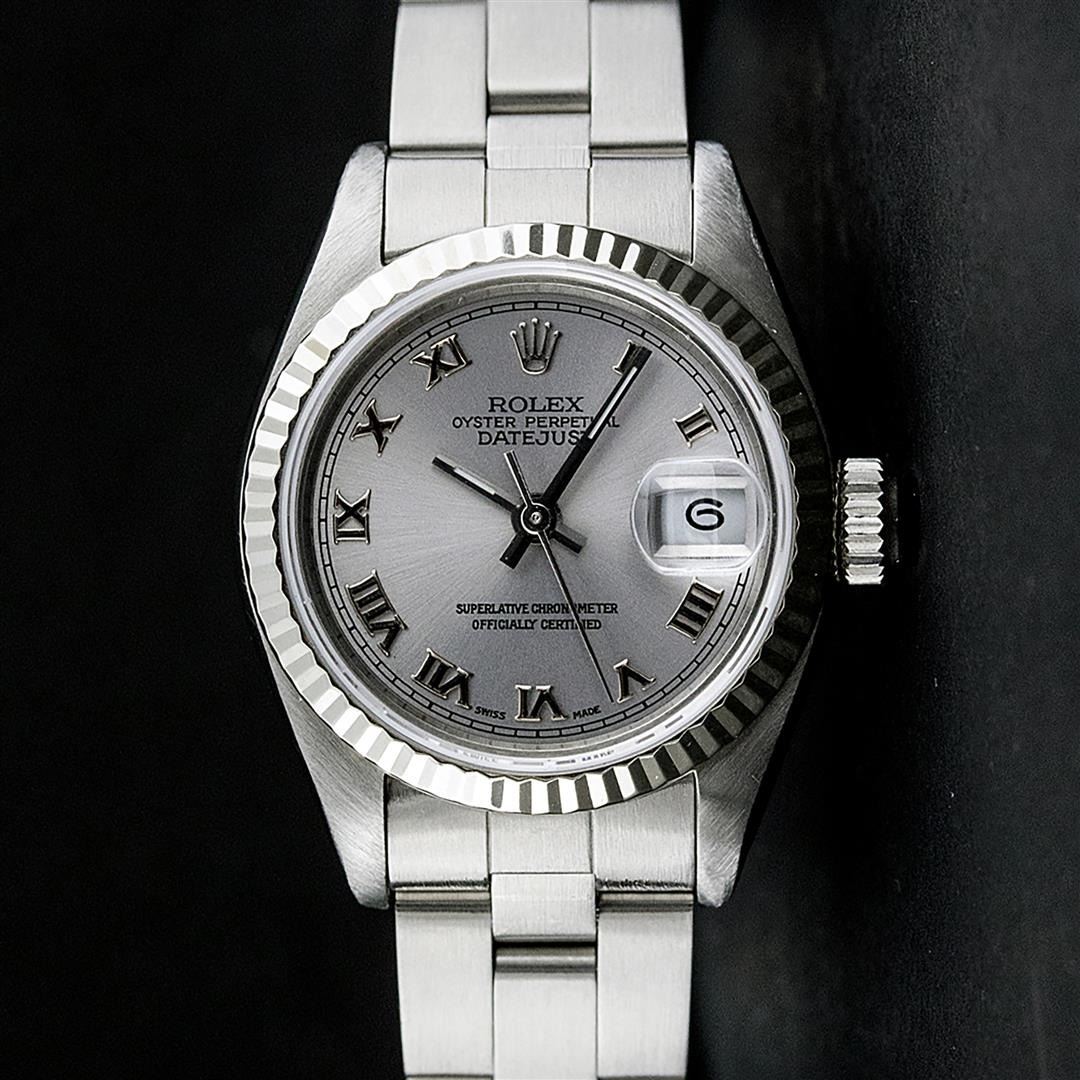 One Ladies Pre Owned Stainless Steel Rolex Polished Bright with Satin Finish, Serviced & Electronically Tested, Rolex Stainless Steel Case: 26mm, Rolex Stainless Steel Crown, Rolex Bezel: White Gold Fluted Bezel. Custom Crystal: New Acrylic With Date Window. Custom Hands: New Luminescent Hands. Rolex Movement: Automatic Winding Movement. Custom Dial: Refinished To Slate Grey With Roman Hour Markers And Dash Track. Date Window: 3 O'Clock Position Date Display, Model: Date. Condition: G-6 Extra Fine. Rolex Bracelet: Stainless Steel Oyster Band. Bright Polish & Satin Finish. 6.0 Inch Length, Adjustable. Standard Clasp, With Rolex Logo. This Watch Has Been Serviced Time Tested And Is In Excellent Condition It Is Free Of All Scratches And Dents.