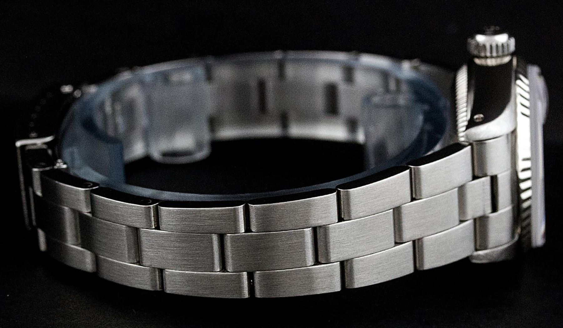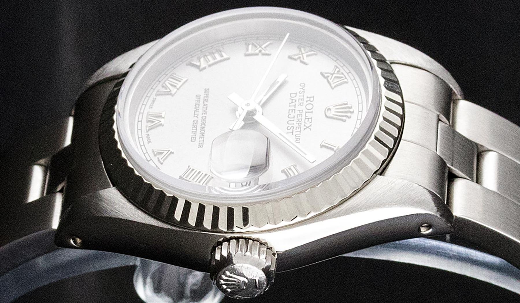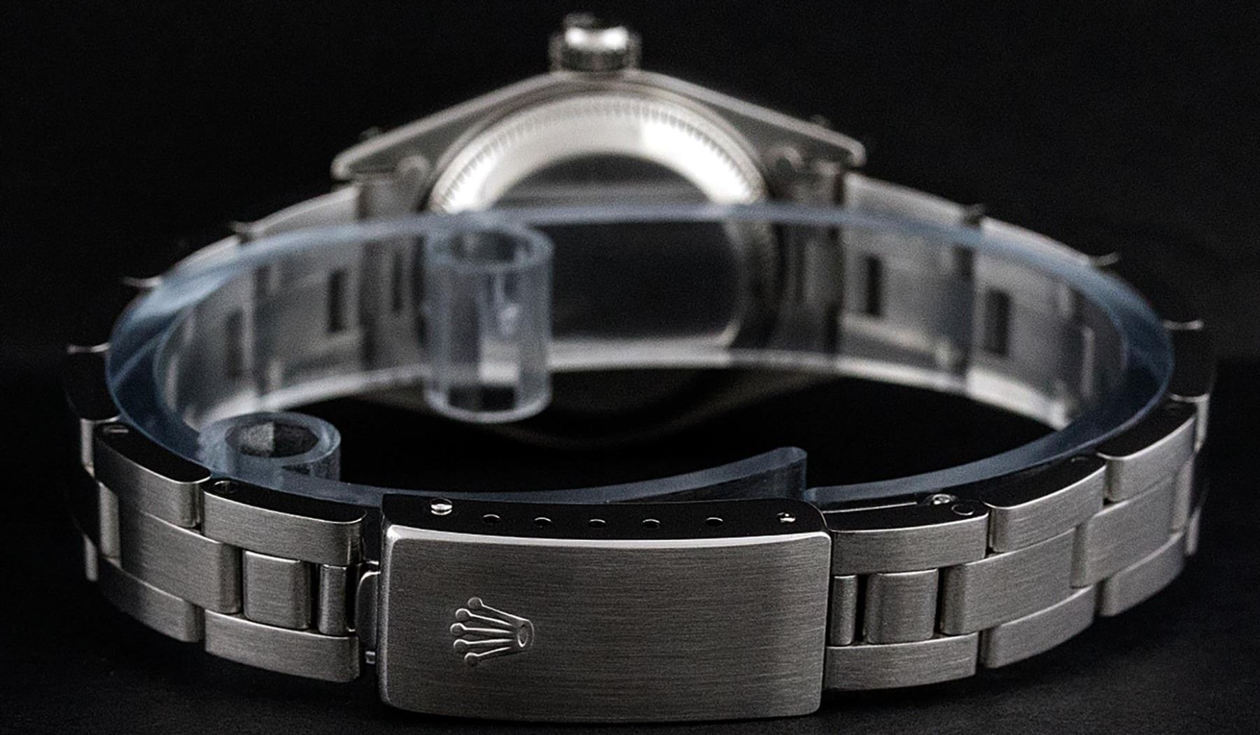 One Ladies Pre Owned Stainless Steel Rolex Polished Bright with Satin Finish, Serviced & Electronically Tested, Rolex Stainless Steel Case: 26mm, Rolex Stainless Steel Crown, Rolex Bezel: White Gold Fluted Bezel. Custom Crystal: New Acrylic With Date Window. Custom Hands: New Luminescent Hands. Rolex Movement: Automatic Winding Movement. Custom Dial: Refinished To Slate Grey With Roman Hour Markers And Dash Track. Date Window: 3 O'Clock Position Date Display, Model: Date. Condition: G-6 Extra Fine. Rolex Bracelet: Stainless Steel Oyster Band. Bright Polish & Satin Finish. 6.0 Inch Length, Adjustable. Standard Clasp, With Rolex Logo. This Watch Has Been Serviced Time Tested And Is In Excellent Condition It Is Free Of All Scratches And Dents.