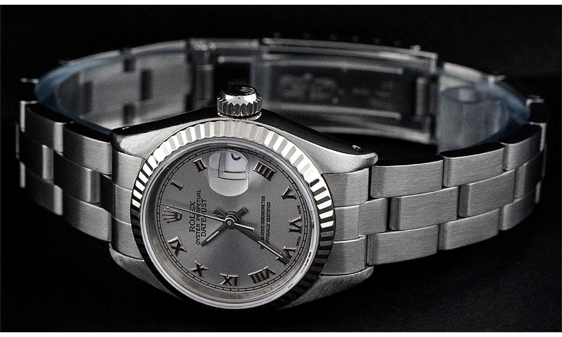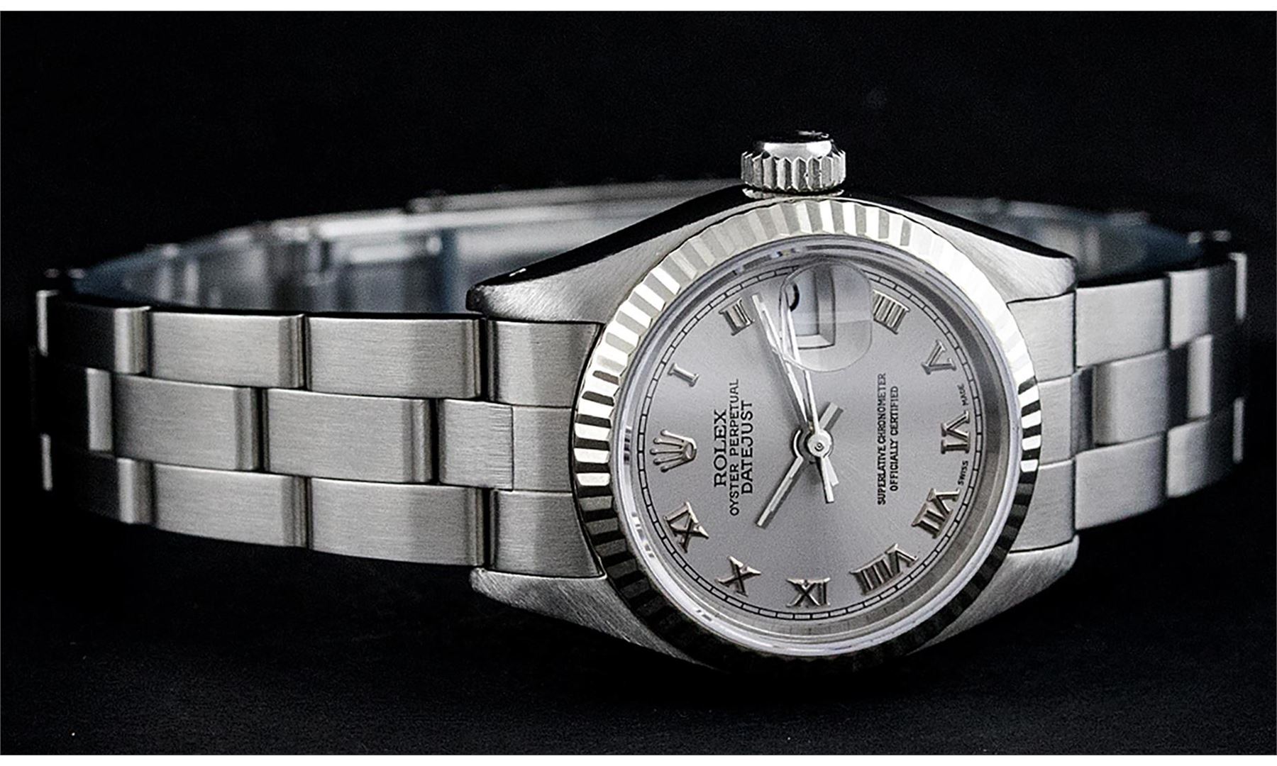 One Ladies Pre Owned Stainless Steel Rolex Polished Bright with Satin Finish, Serviced & Electronically Tested, Rolex Stainless Steel Case: 26mm, Rolex Stainless Steel Crown, Rolex Bezel: White Gold Fluted Bezel. Custom Crystal: New Acrylic With Date Window. Custom Hands: New Luminescent Hands. Rolex Movement: Automatic Winding Movement. Custom Dial: Refinished To Slate Grey With Roman Hour Markers And Dash Track. Date Window: 3 O'Clock Position Date Display, Model: Date. Condition: G-6 Extra Fine. Rolex Bracelet: Stainless Steel Oyster Band. Bright Polish & Satin Finish. 6.0 Inch Length, Adjustable. Standard Clasp, With Rolex Logo. This Watch Has Been Serviced Time Tested And Is In Excellent Condition It Is Free Of All Scratches And Dents.