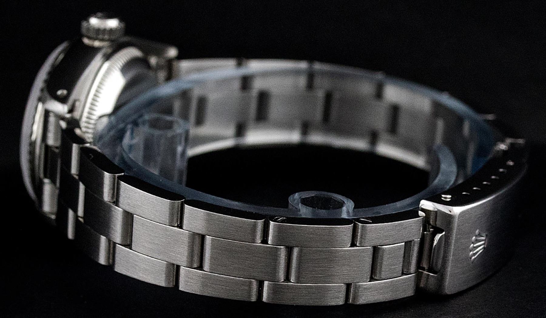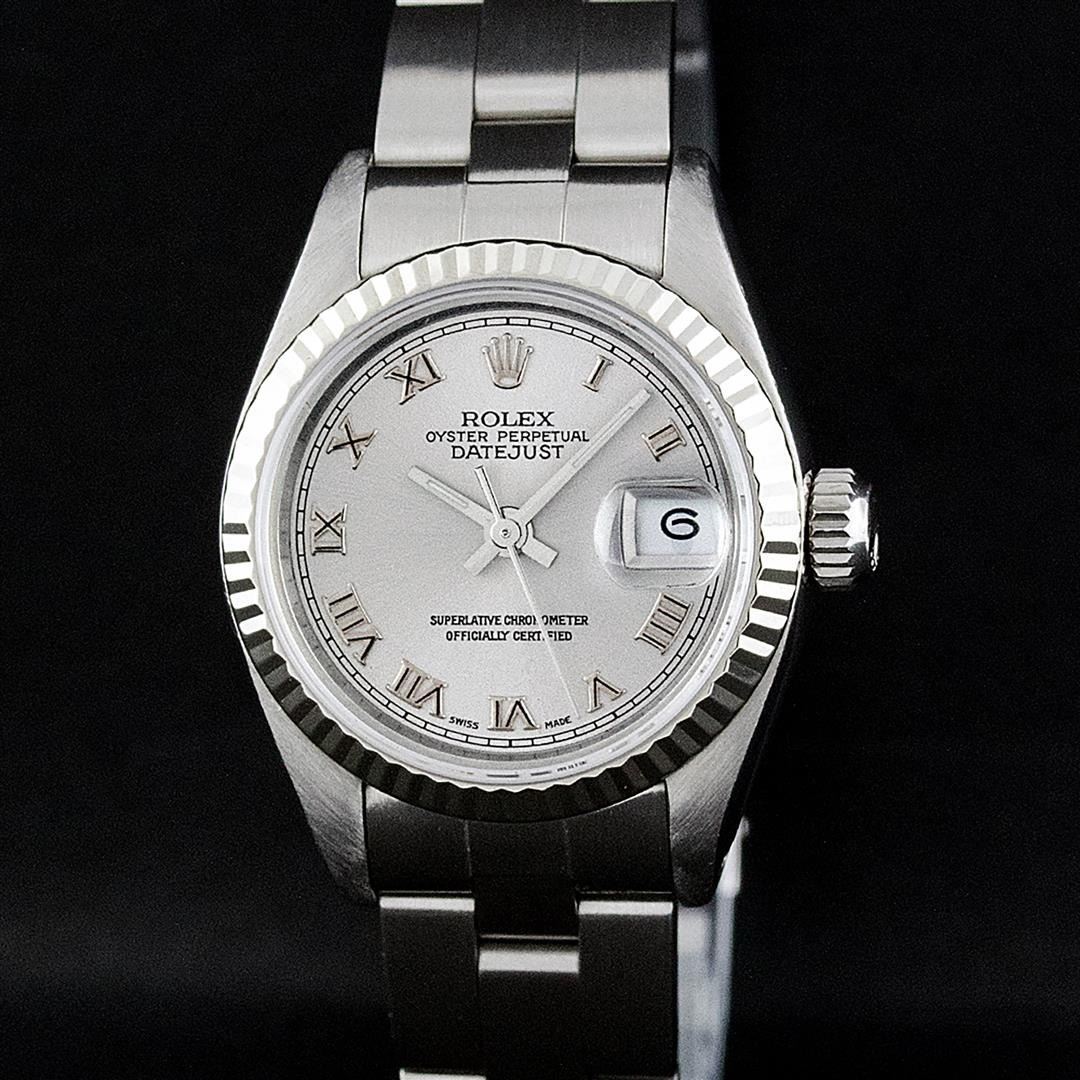 One Ladies Pre Owned Stainless Steel Rolex Polished Bright with Satin Finish, Serviced & Electronically Tested, Rolex Stainless Steel Case: 26mm, Rolex Stainless Steel Crown, Rolex Bezel: White Gold Fluted Bezel. Custom Crystal: New Acrylic With Date Window. Custom Hands: New Luminescent Hands. Rolex Movement: Automatic Winding Movement. Custom Dial: Refinished To Slate Grey With Roman Hour Markers And Dash Track. Date Window: 3 O'Clock Position Date Display, Model: Date. Condition: G-6 Extra Fine. Rolex Bracelet: Stainless Steel Oyster Band. Bright Polish & Satin Finish. 6.0 Inch Length, Adjustable. Standard Clasp, With Rolex Logo. This Watch Has Been Serviced Time Tested And Is In Excellent Condition It Is Free Of All Scratches And Dents.