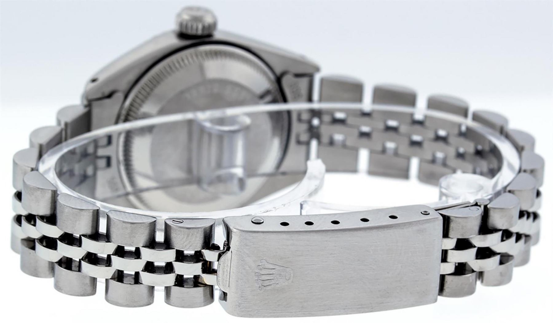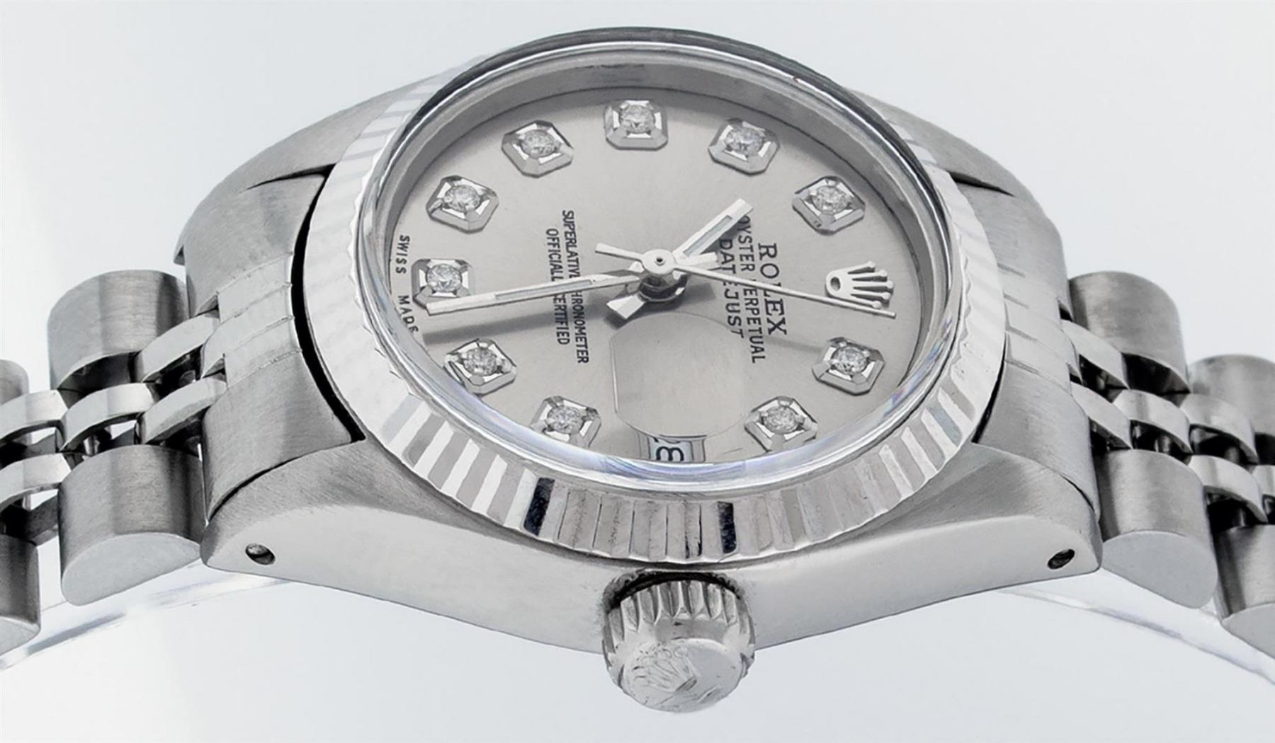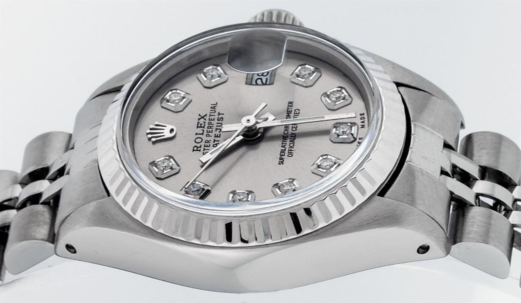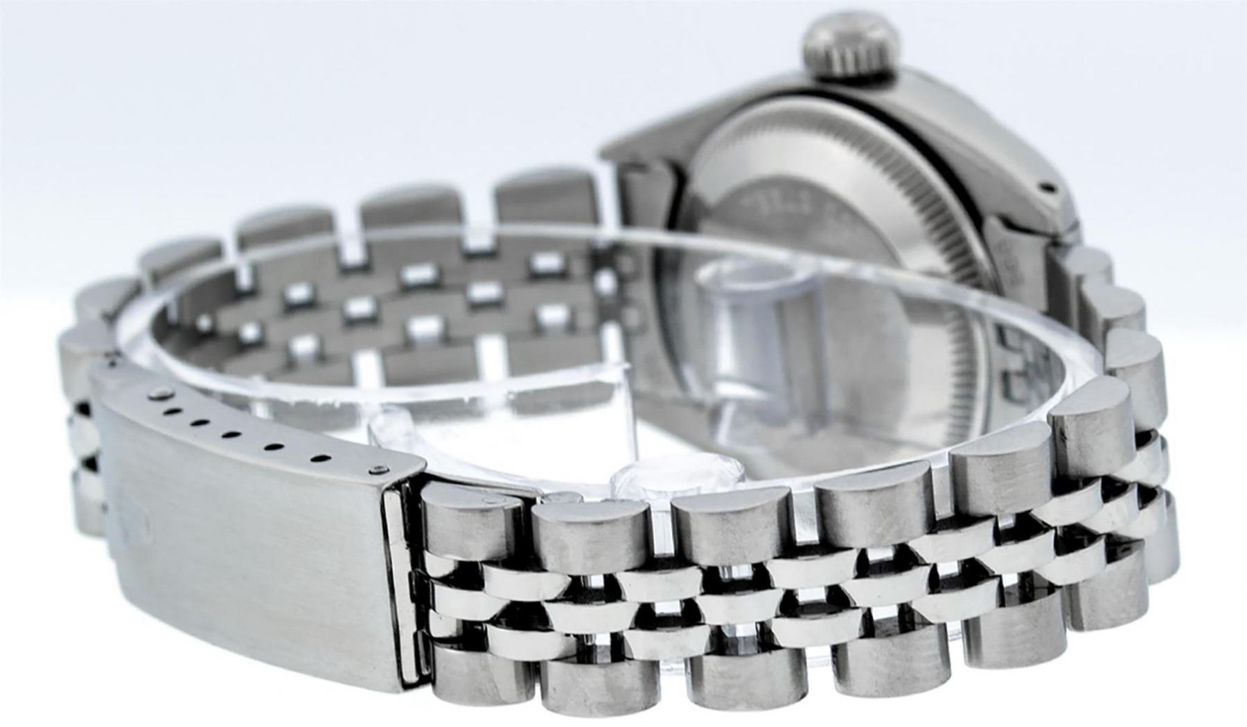 One Ladies Stainless Steel Rolex Datejust Polished Bright with Satin Finish, Serviced & Electronically Tested, Stainless Steel Case: 26mm, Stainless Steel Crown, Bezel: 14K White Gold Bezel. Custom Crystal: New Acrylic Cyclops Lens. Custom Hands: New Luminescent Hands. Movement: Automatic Winding Movement. Dial: Slate Grey Diamond Dial, Diamond Count: 10 Diamonds In Dial, Color: G to H, Clarity: SI-VS. Date Window: 3 O'Clock Position Date Display, Model: Datejust. Condition: G-6 Extra Fine. Bracelet: Stainless Steel Jubilee Band. Bright Polish & Satin Finish. 6.0 Inch Length, Adjustable. Standard Clasp, With Rolex Logo. This Watch Has Been Serviced Time Tested And Is In Excellent Condition It Is Free Of All Scratches And Dents.