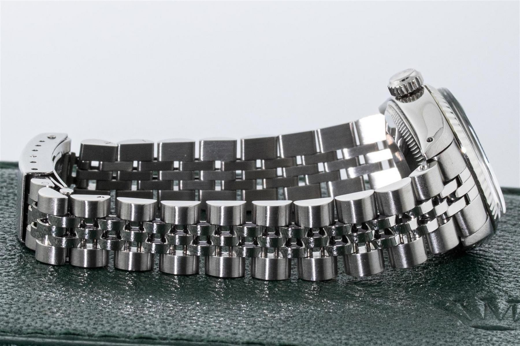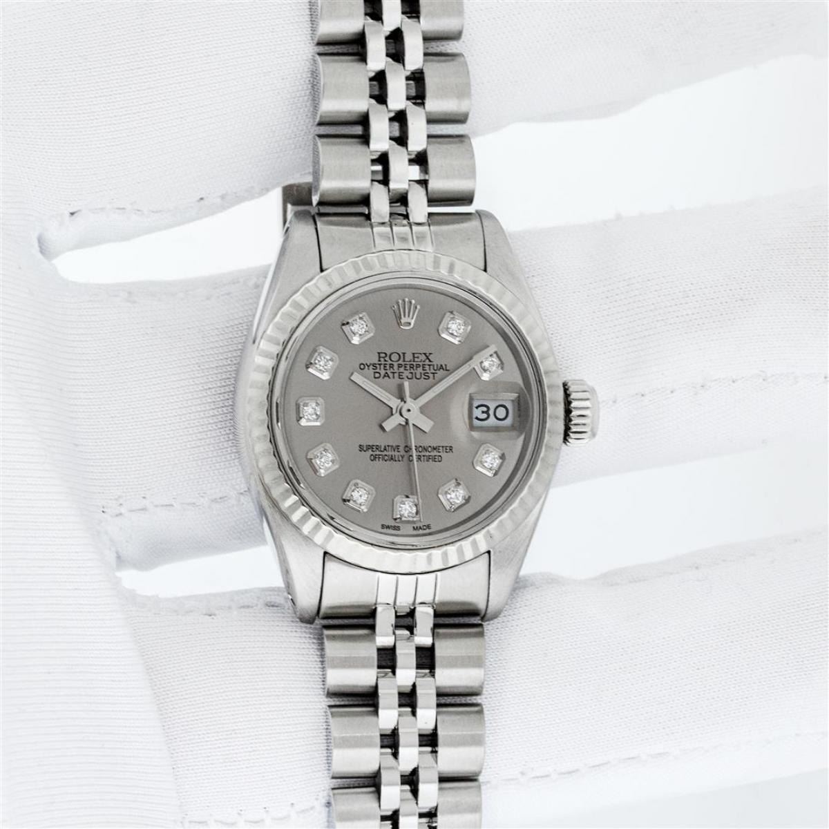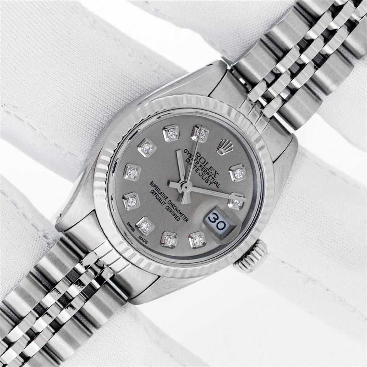 One Ladies Stainless Steel Rolex Datejust Polished Bright with Satin Finish, Serviced & Electronically Tested, Stainless Steel Case: 26mm, Stainless Steel Crown, Bezel: 14K White Gold Bezel. Custom Crystal: New Acrylic Cyclops Lens. Custom Hands: New Luminescent Hands. Movement: Automatic Winding Movement. Dial: Slate Grey Diamond Dial, Diamond Count: 10 Diamonds In Dial, Color: G to H, Clarity: SI-VS. Date Window: 3 O'Clock Position Date Display, Model: Datejust. Condition: G-6 Extra Fine. Bracelet: Stainless Steel Jubilee Band. Bright Polish & Satin Finish. 6.0 Inch Length, Adjustable. Standard Clasp, With Rolex Logo. This Watch Has Been Serviced Time Tested And Is In Excellent Condition It Is Free Of All Scratches And Dents.
