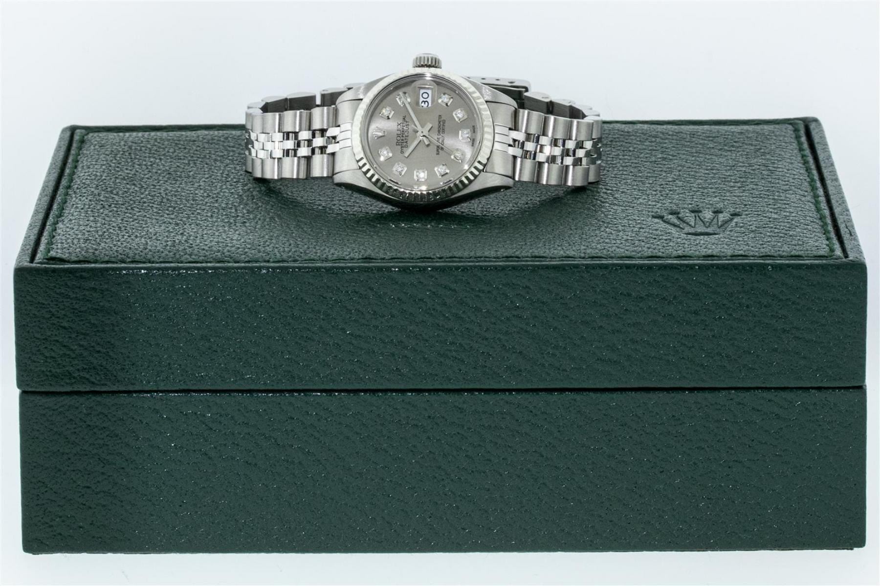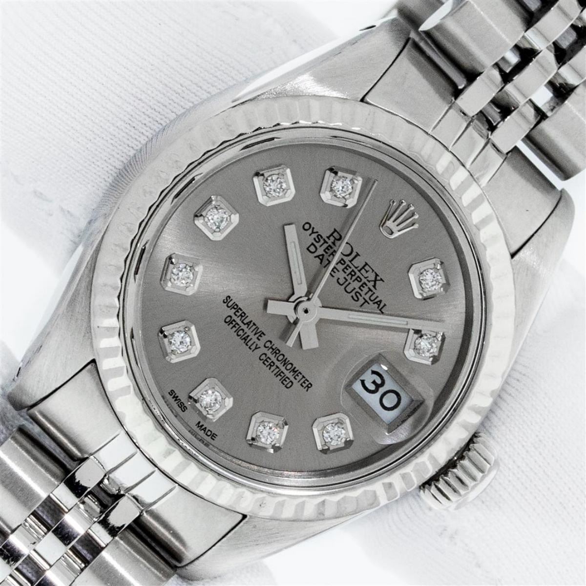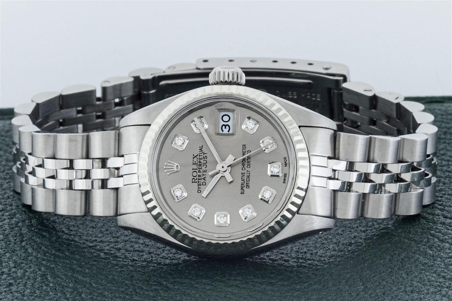 One Ladies Stainless Steel Rolex Datejust Polished Bright with Satin Finish, Serviced & Electronically Tested, Stainless Steel Case: 26mm, Stainless Steel Crown, Bezel: 14K White Gold Bezel. Custom Crystal: New Acrylic Cyclops Lens. Custom Hands: New Luminescent Hands. Movement: Automatic Winding Movement. Dial: Slate Grey Diamond Dial, Diamond Count: 10 Diamonds In Dial, Color: G to H, Clarity: SI-VS. Date Window: 3 O'Clock Position Date Display, Model: Datejust. Condition: G-6 Extra Fine. Bracelet: Stainless Steel Jubilee Band. Bright Polish & Satin Finish. 6.0 Inch Length, Adjustable. Standard Clasp, With Rolex Logo. This Watch Has Been Serviced Time Tested And Is In Excellent Condition It Is Free Of All Scratches And Dents.